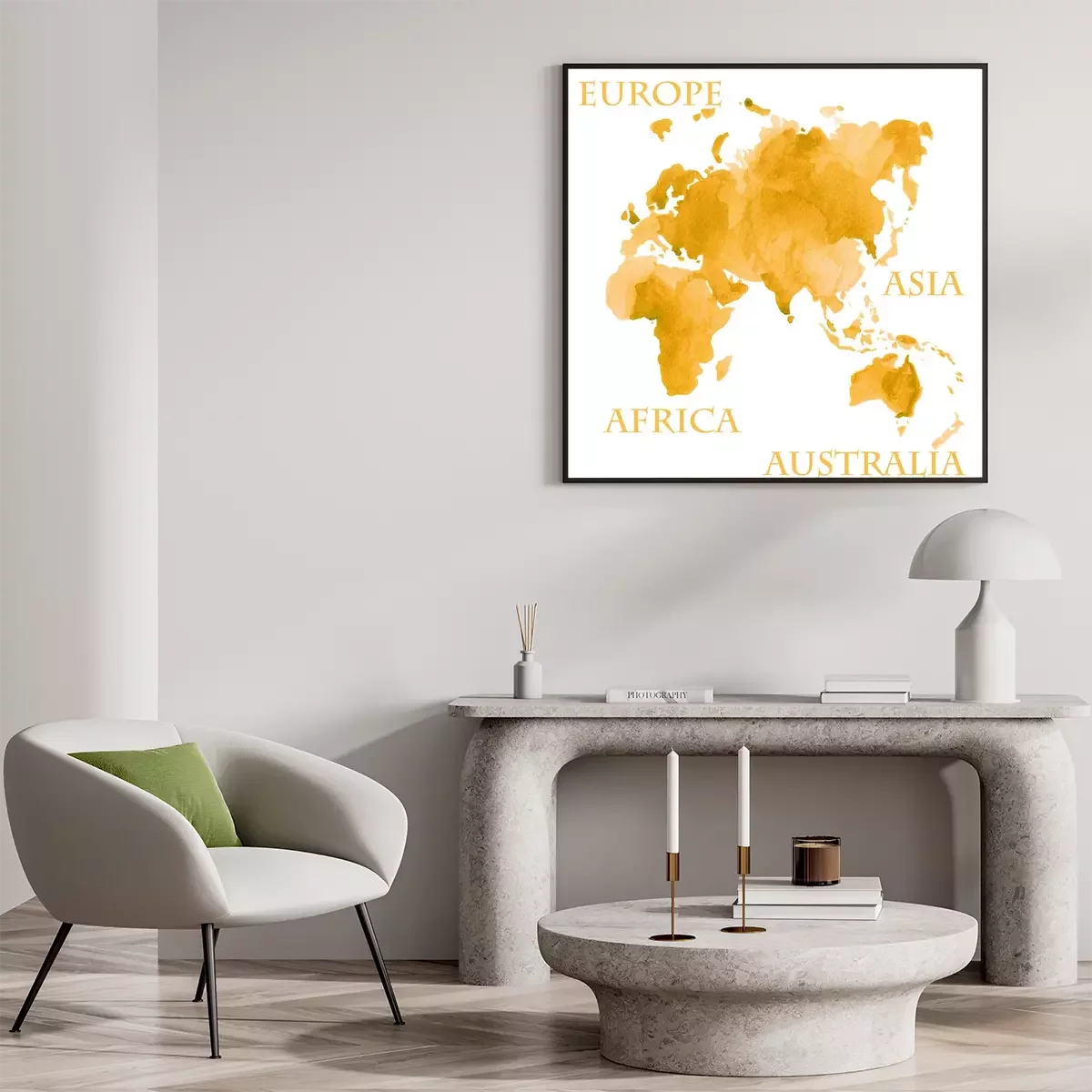 Poster  Illustration aquarelle des parties de la carte du monde comme l'Europe, l'Asie, l'Afrique et l'Australie peints à l'encre d'or sépia