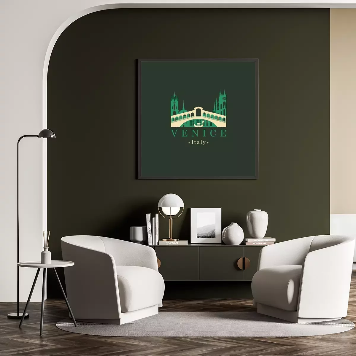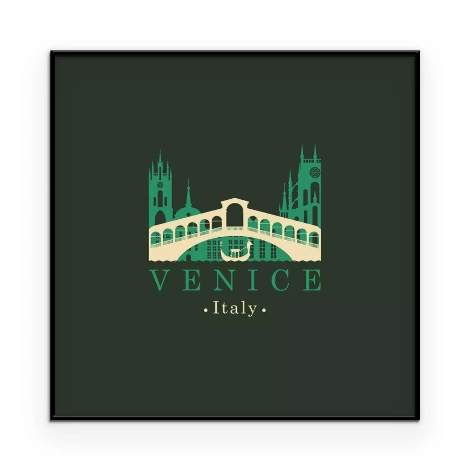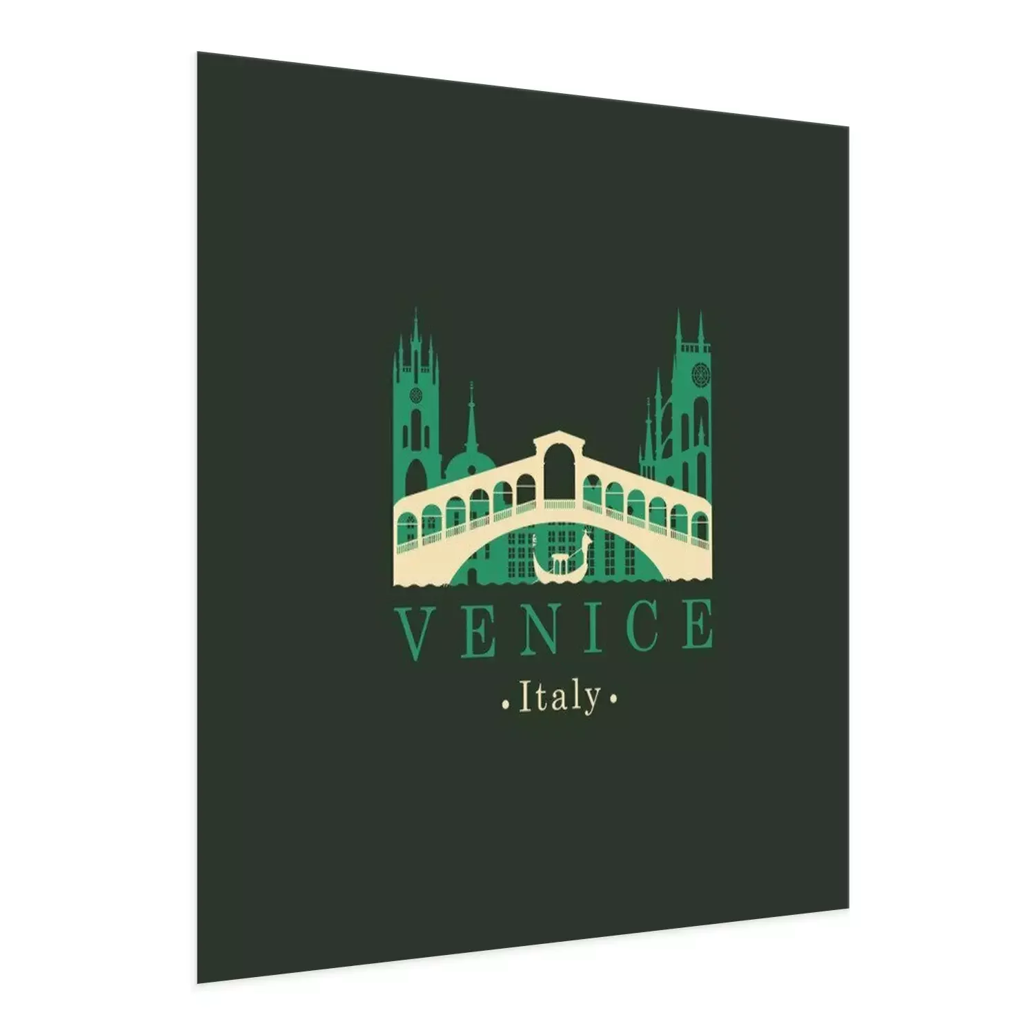 Poster  Illustration de vecteur voyage, bannière ou icône. Logo du pont Rialto. Ponte di Rialto et la gondole sur un fond des vieux bâtiments de Venise. Venise Landmark. Attraction architecturale italienne