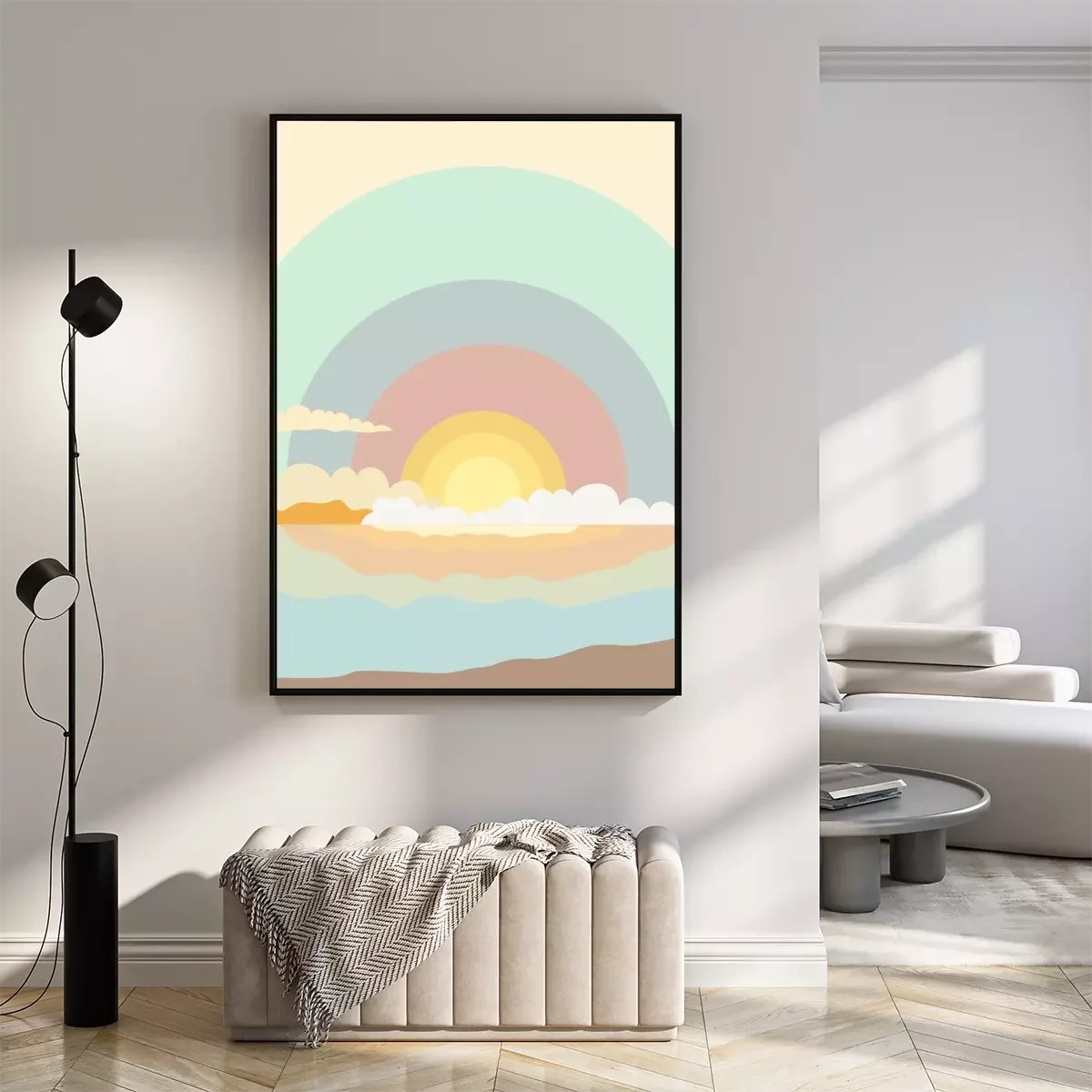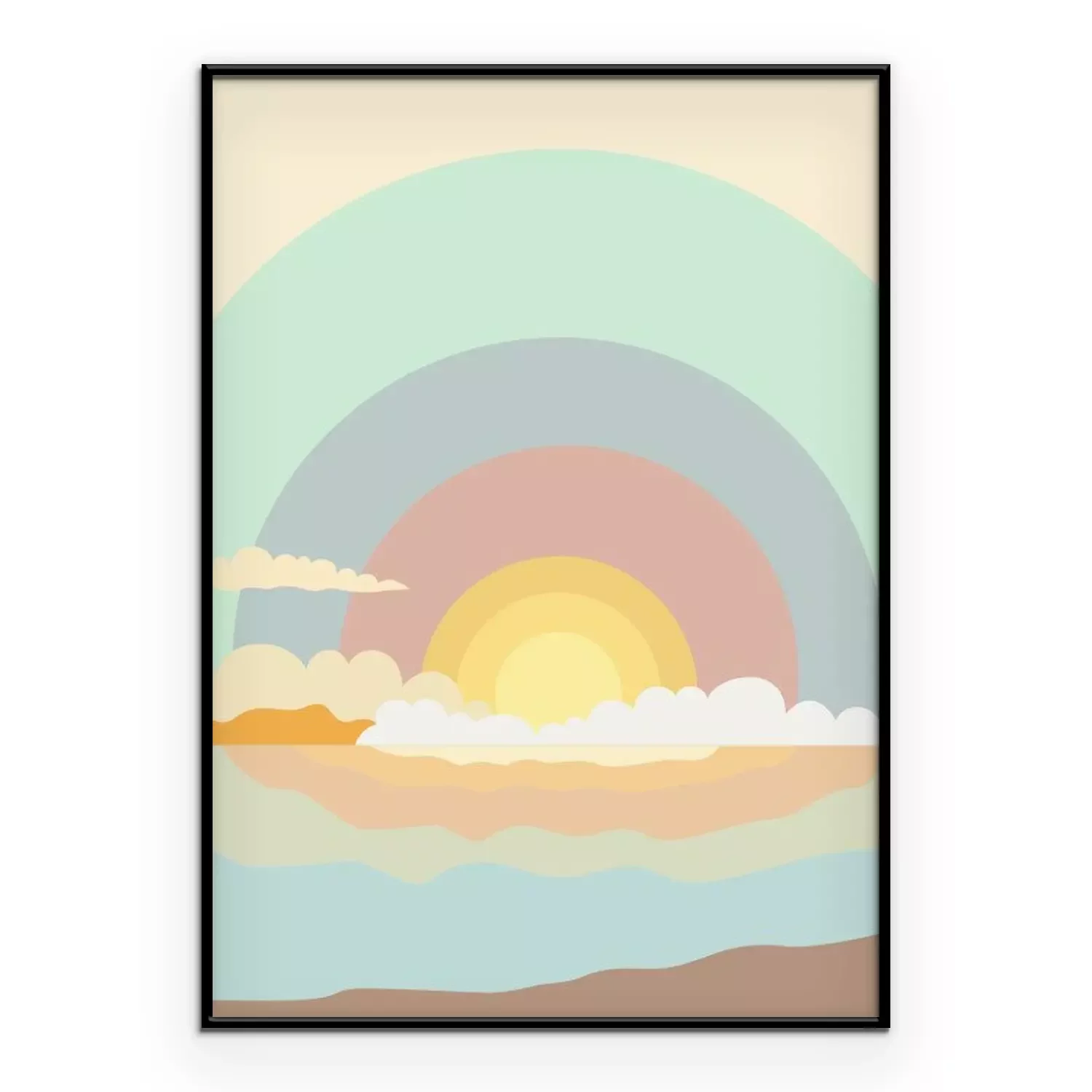 Poster : Illustration du lever du soleil dans la mer dans des tons pastels délicats avec nuages ​​et bord de mer pour poster, décoration, couverture de livre, fond