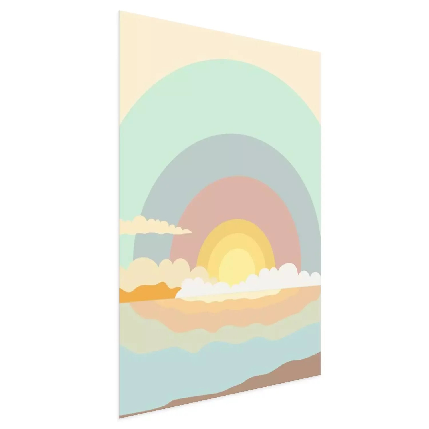Poster  Illustration du lever du soleil dans la mer dans des tons pastels délicats avec nuages ​​et bord de mer pour poster, décoration, couverture de livre, fond
