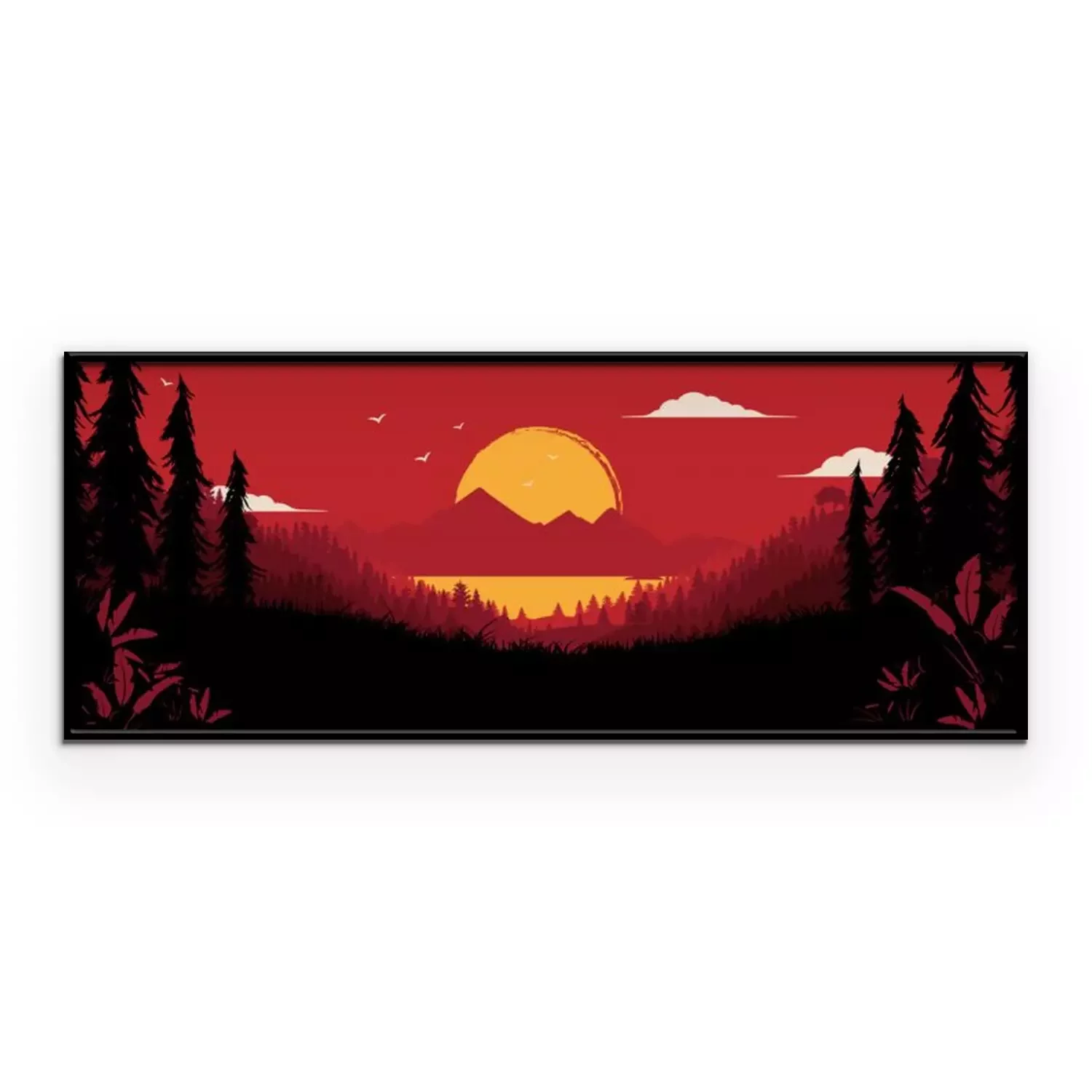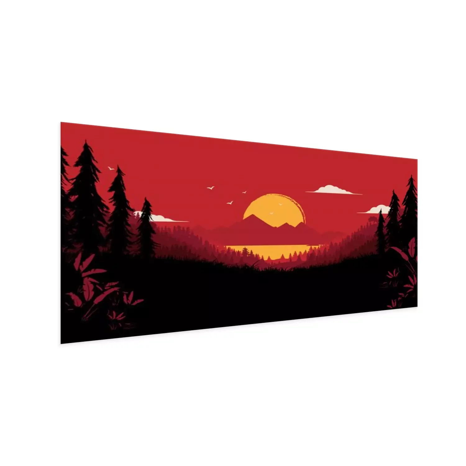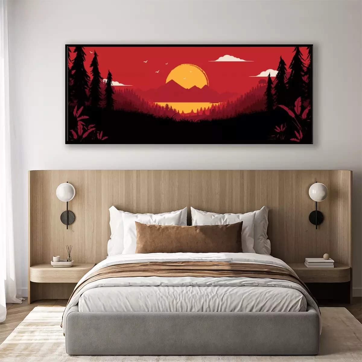 Vector landscape with warm sun. Sunrise over mountains with ocean and forest. Red and orange colours. Good morning, new day and positive emotions concept. Illustration.