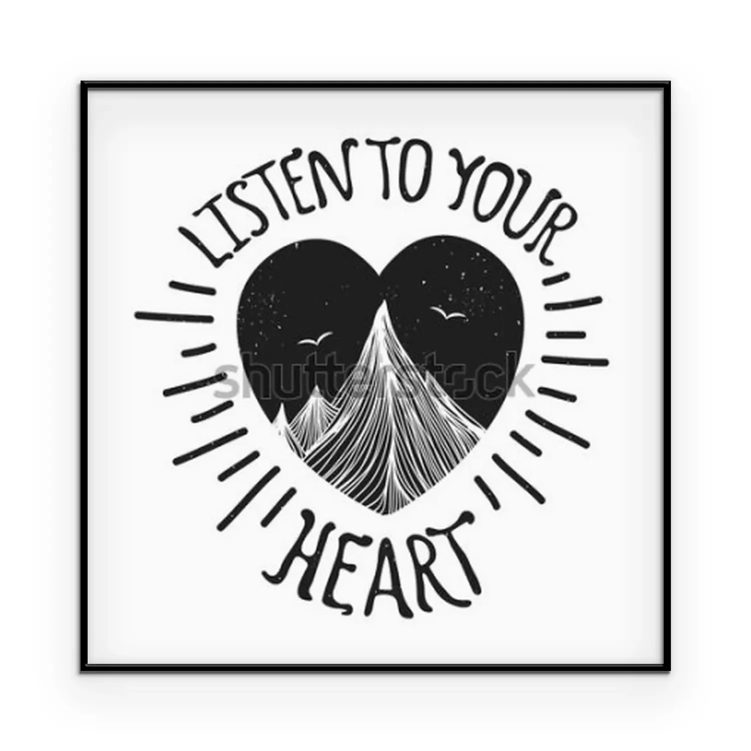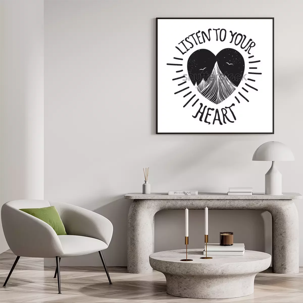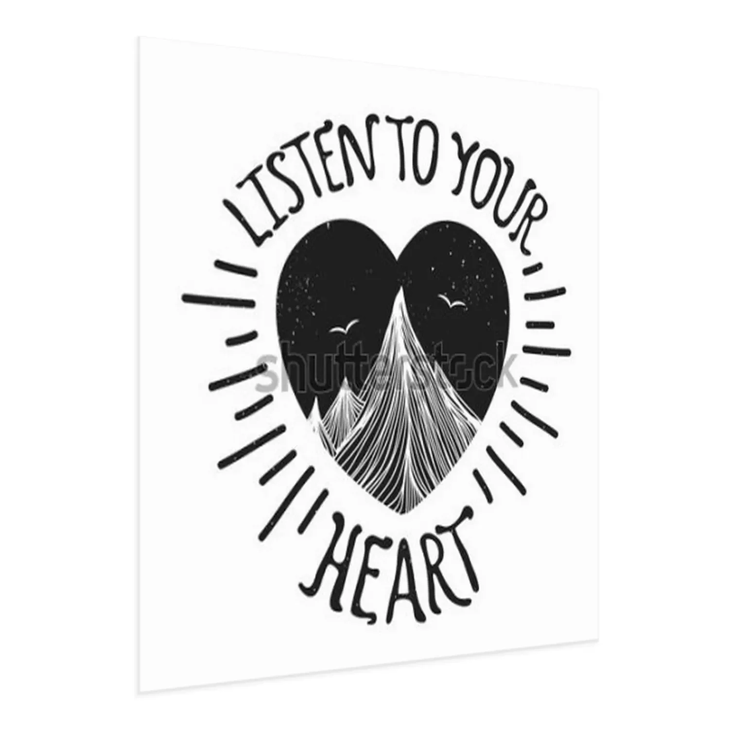 Poster  Illustration vectorielle avec les montagnes à l'intérieur du coeur. Écoutez votre coeur - citation de lettrage. Typographie de motivation et d'inspiration avec texte. Conception de