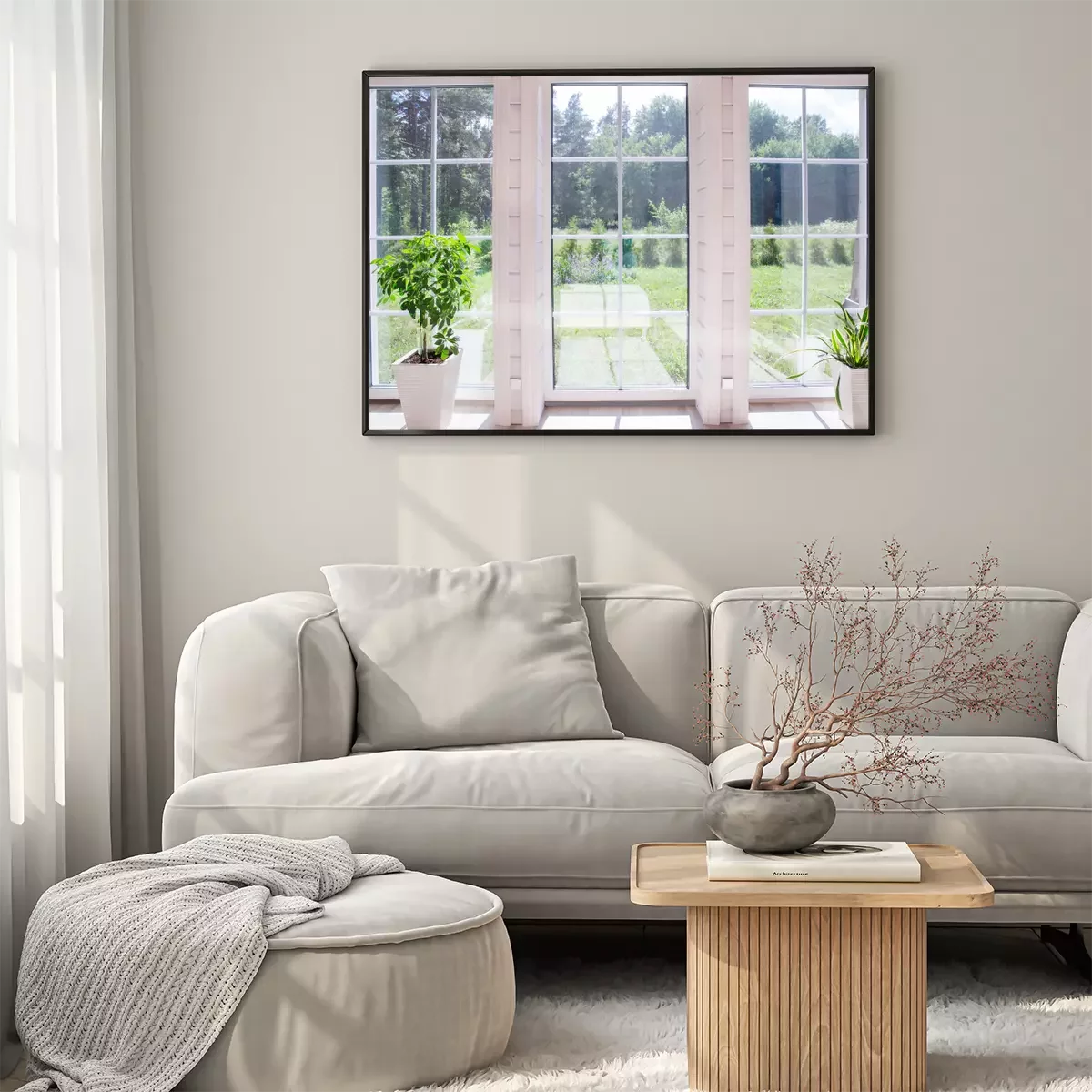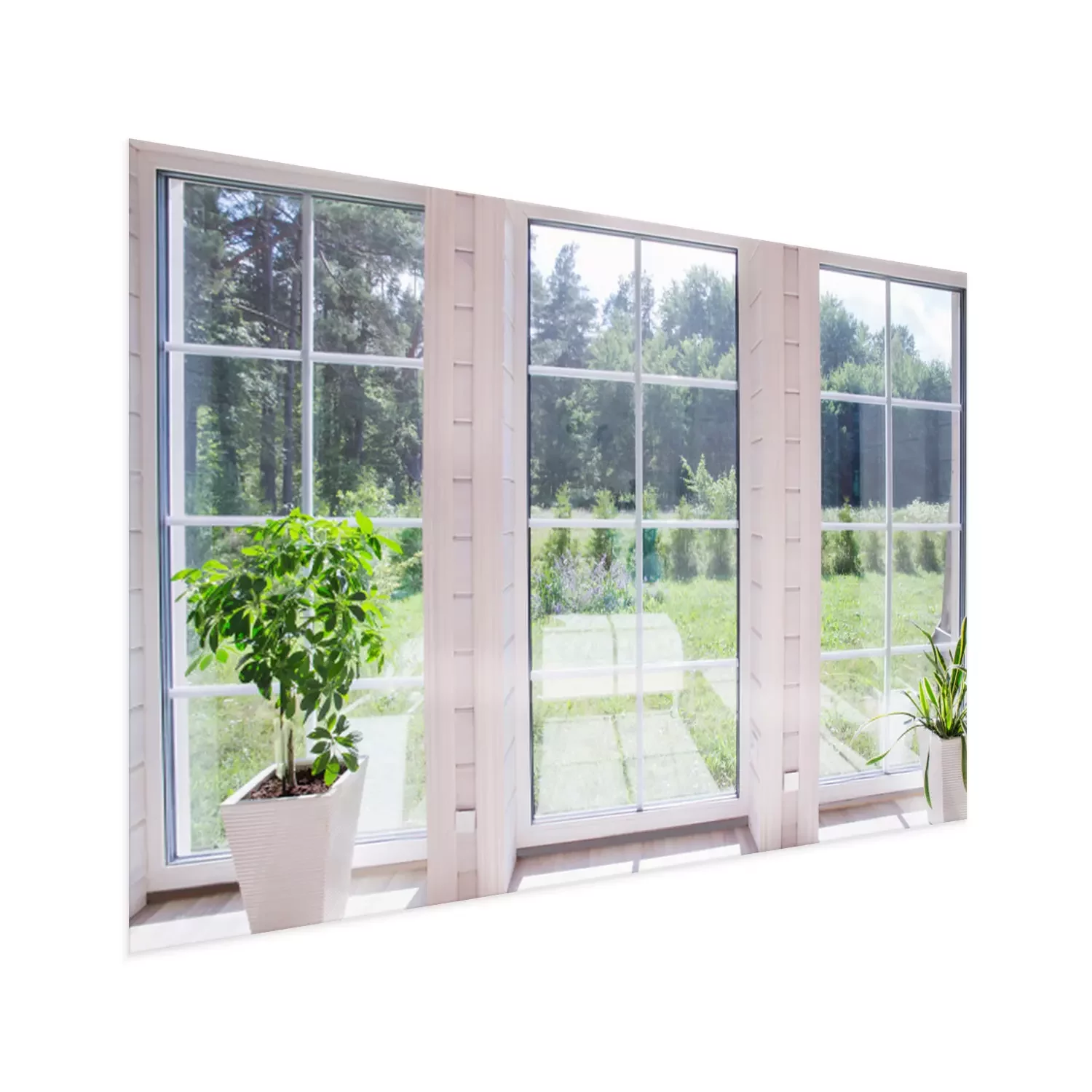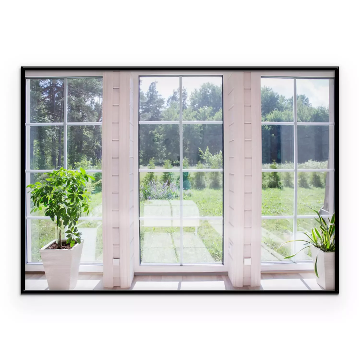 Poster  Intérieur lumineux de la pièce dans une maison en bois avec une grande fenêtre donnant sur la cour d'été. Paysage d'été en fenêtre blanche. Concept maison et jardin. Plante d'intérieur Sansevieria tri