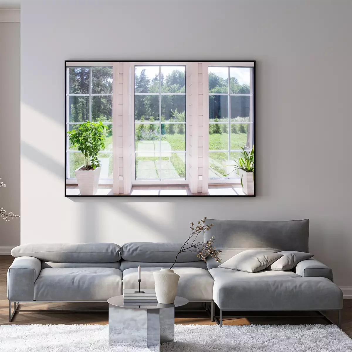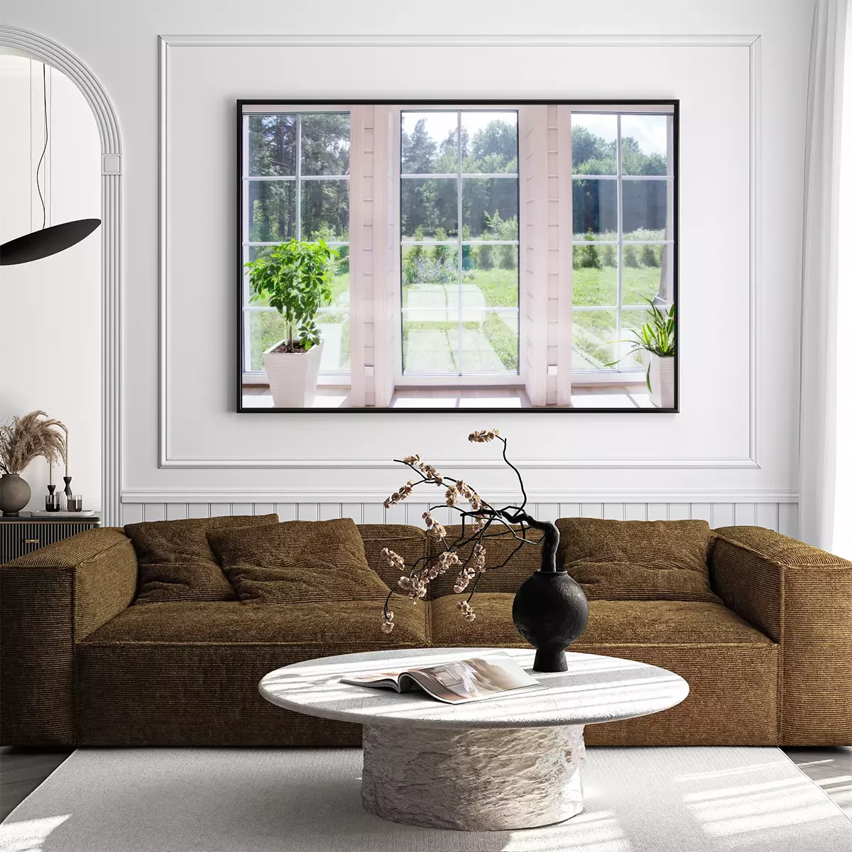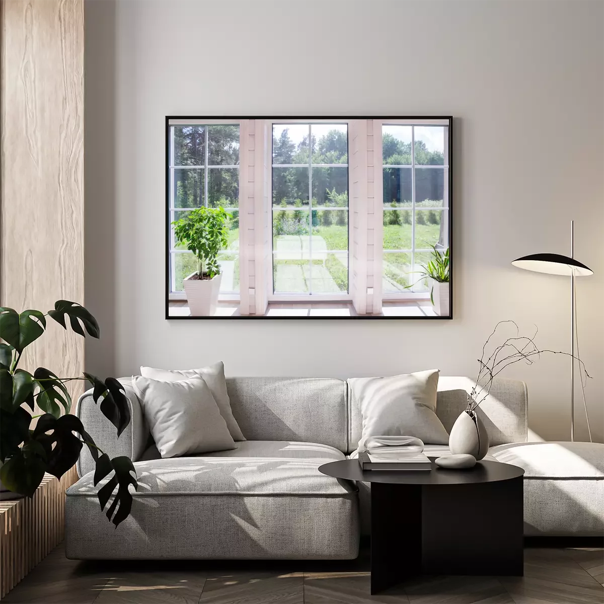 Poster  Intérieur lumineux de la pièce dans une maison en bois avec une grande fenêtre donnant sur la cour d'été. Paysage d'été en fenêtre blanche. Concept maison et jardin. Plante d'intérieur Sansevieria tri