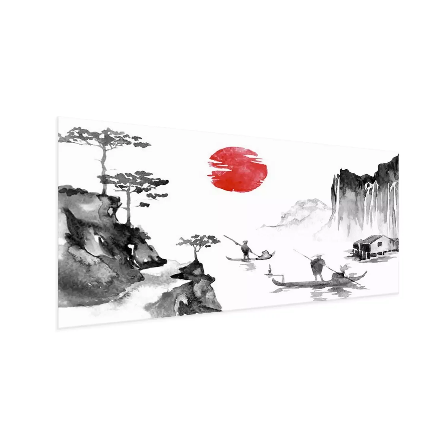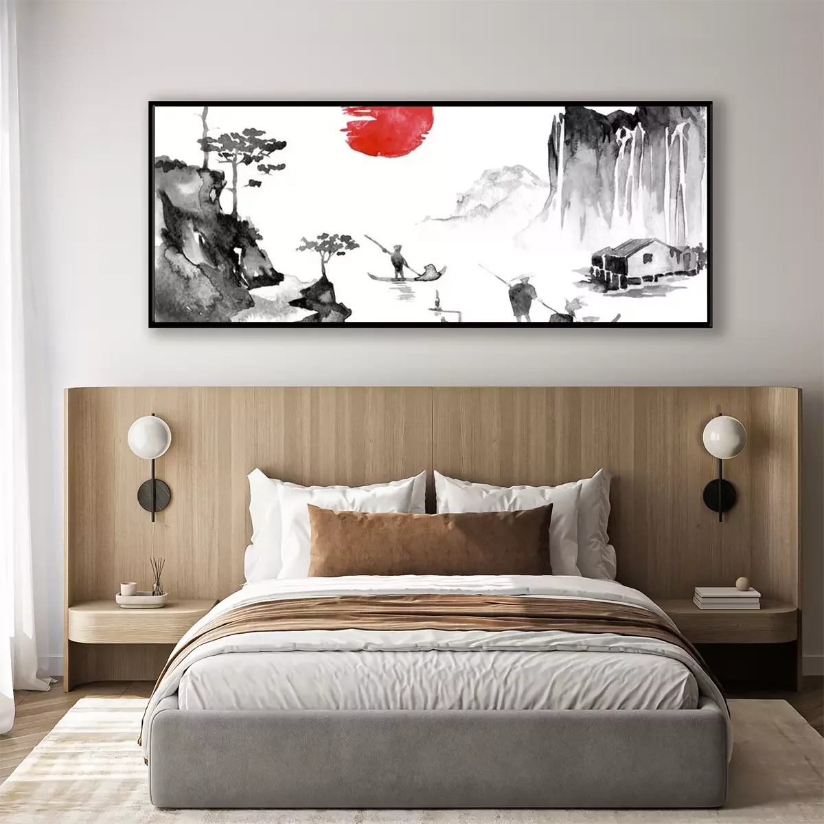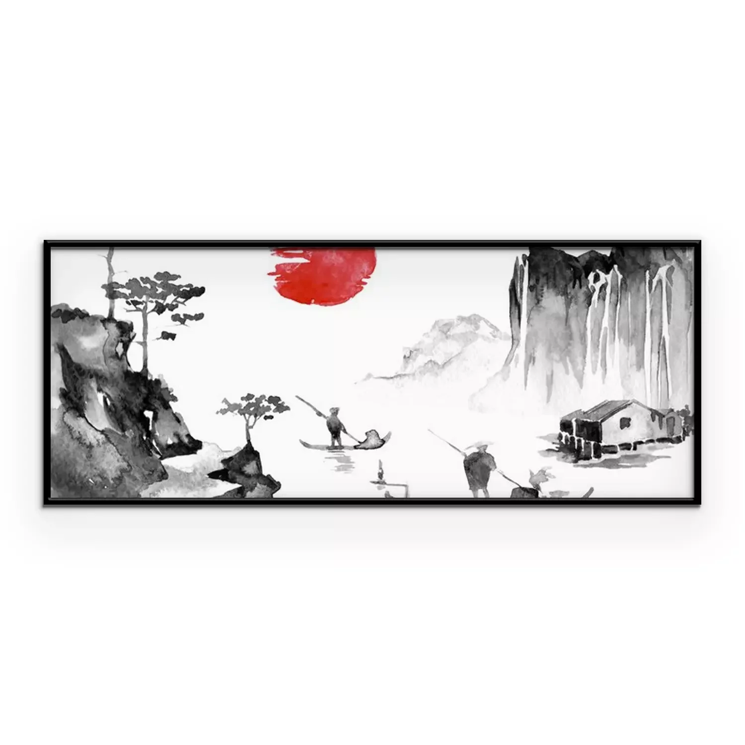 Poster : Japan traditional sumi-e painting. Indian ink illustration. Man and boat. Sunset, dusk. Japanese picture.
