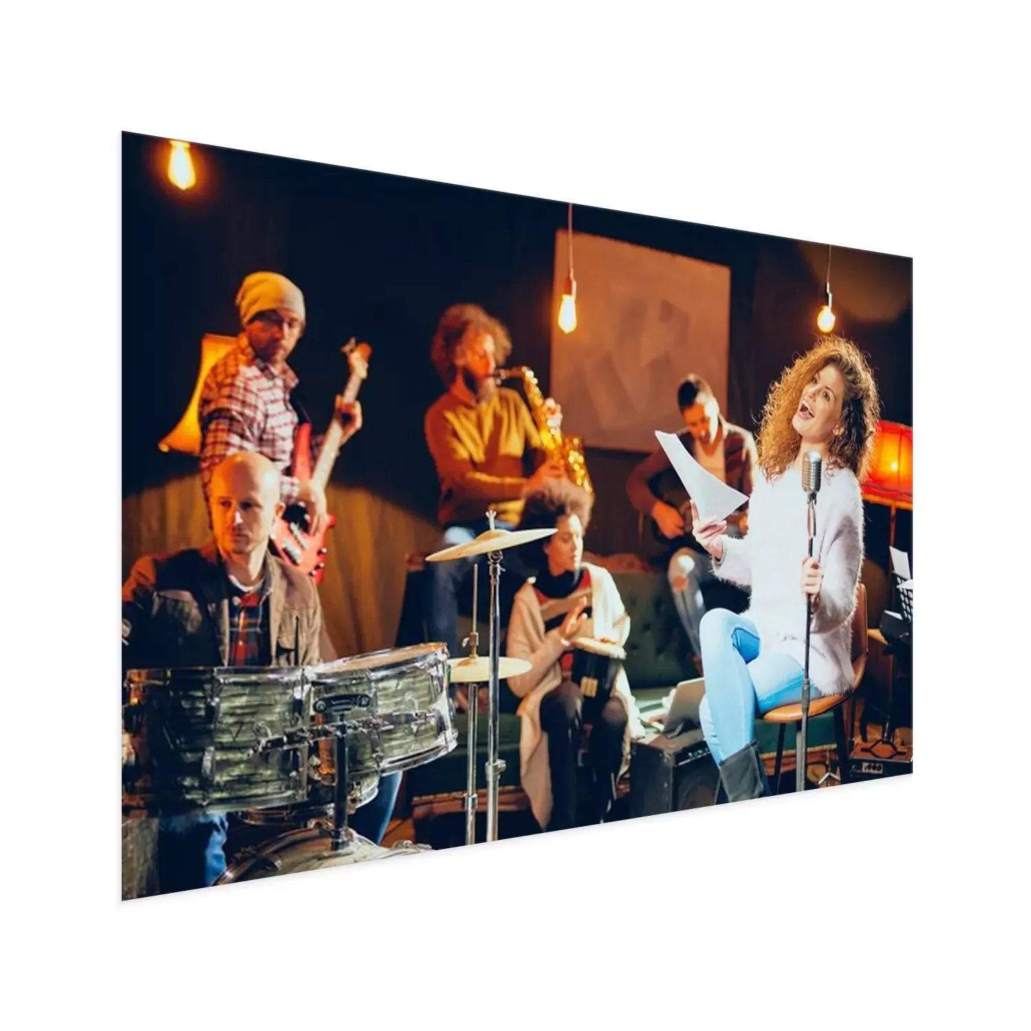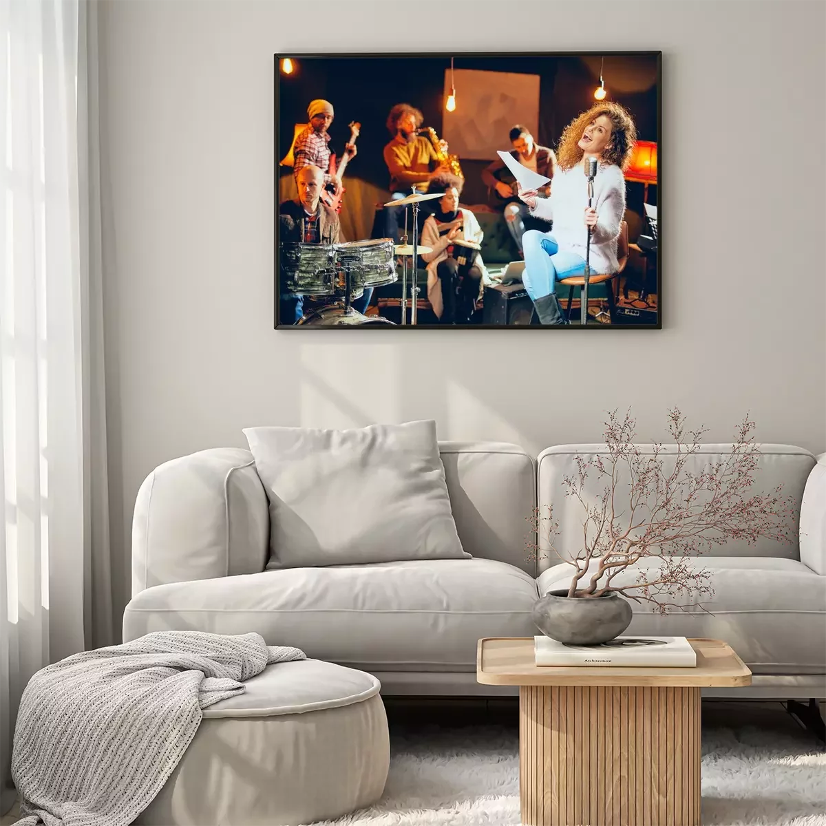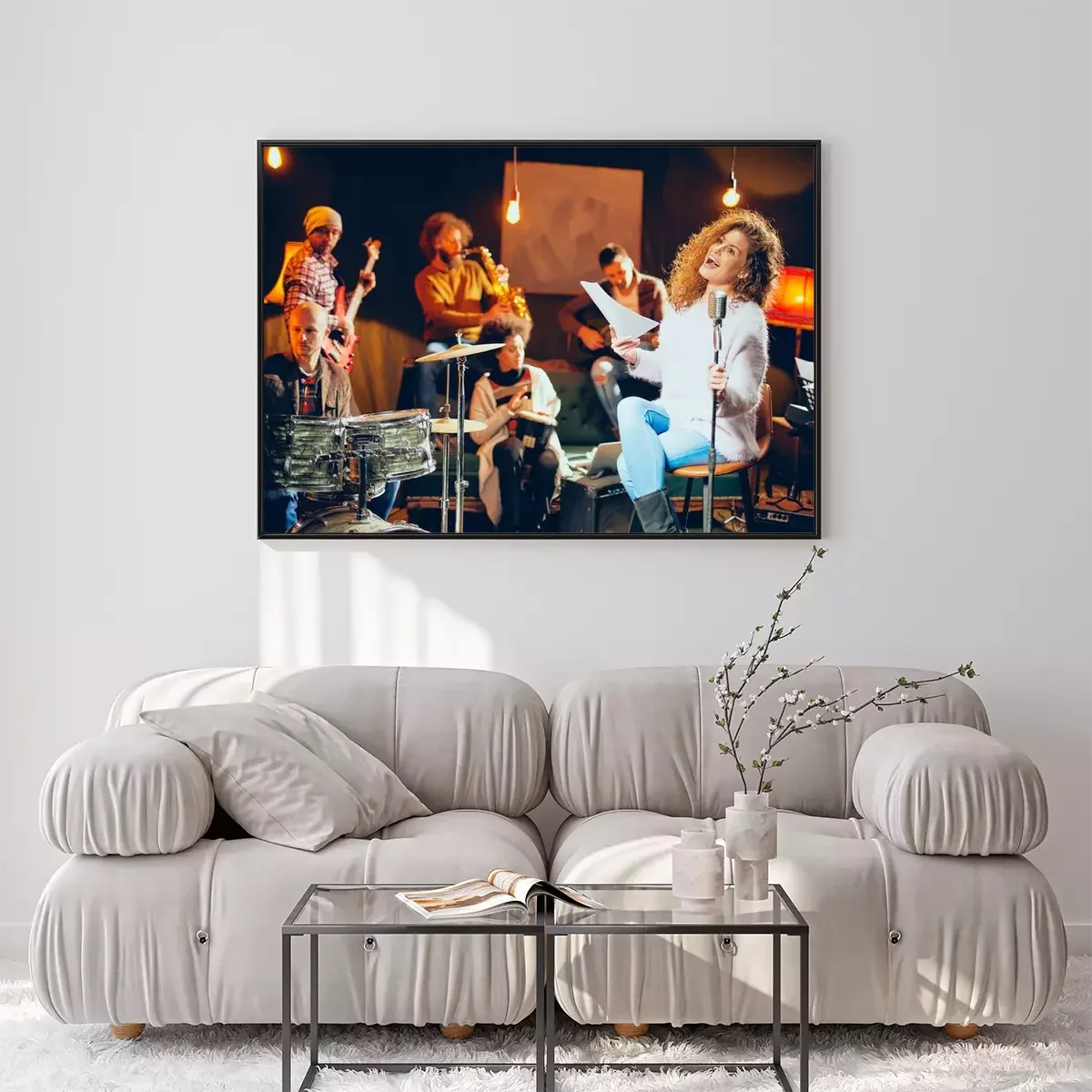 Poster  Jazz band preparing for the gig. In foreground woman singing while the rest of the band playing bass guitar, clavier and acoustic guitar. Home music studio interior.
