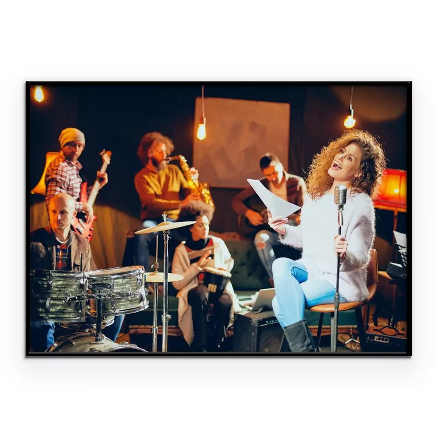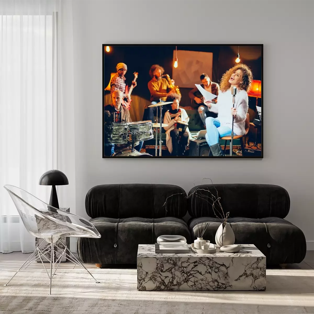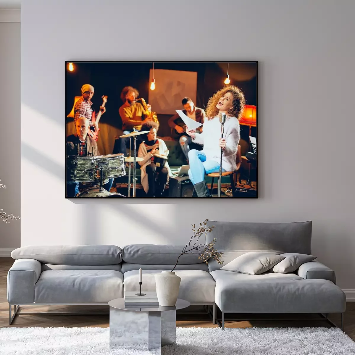 Poster  Jazz band preparing for the gig. In foreground woman singing while the rest of the band playing bass guitar, clavier and acoustic guitar. Home music studio interior.