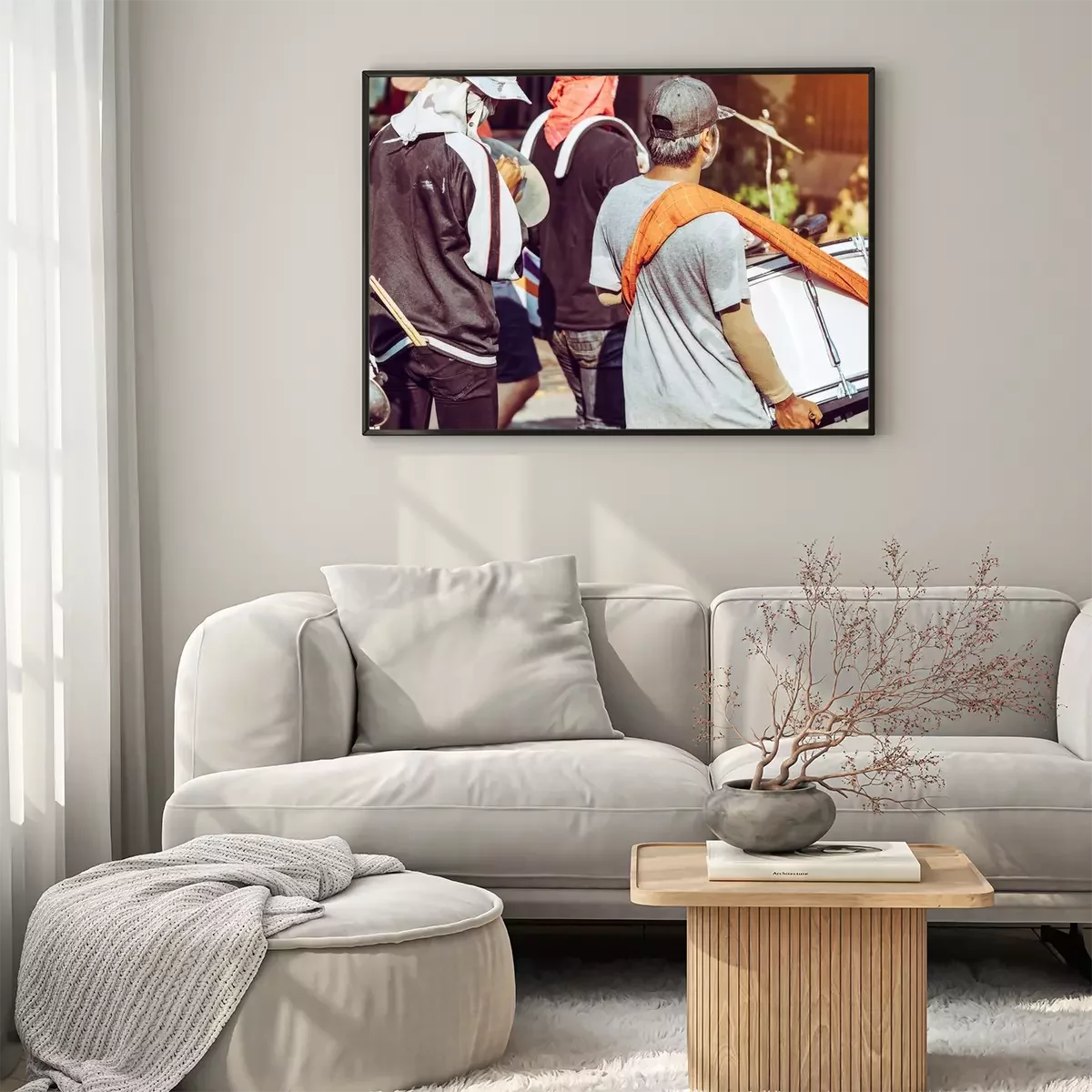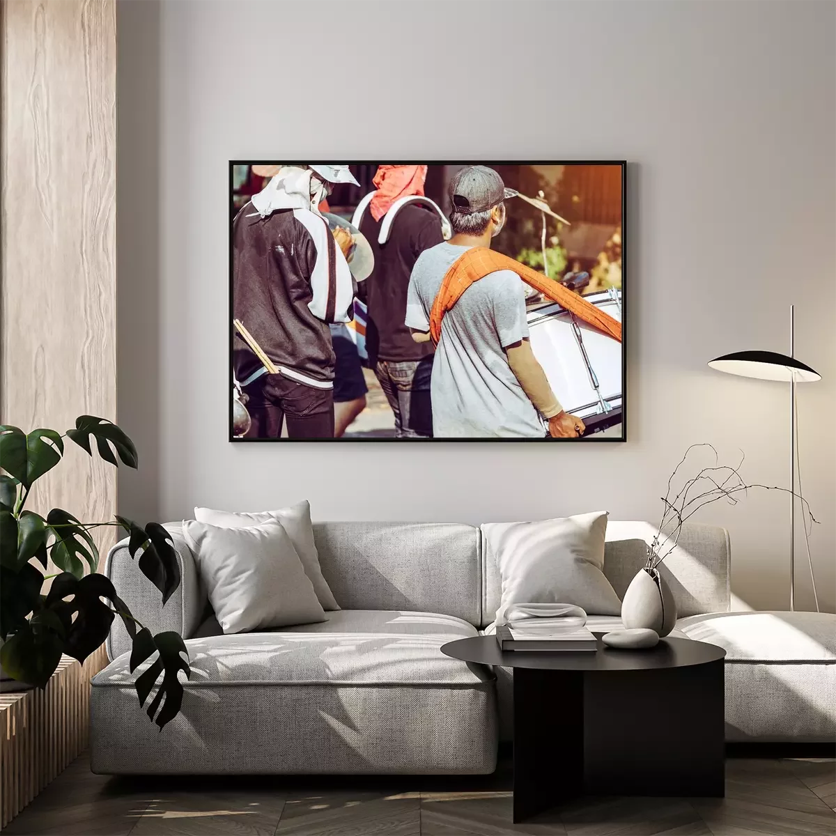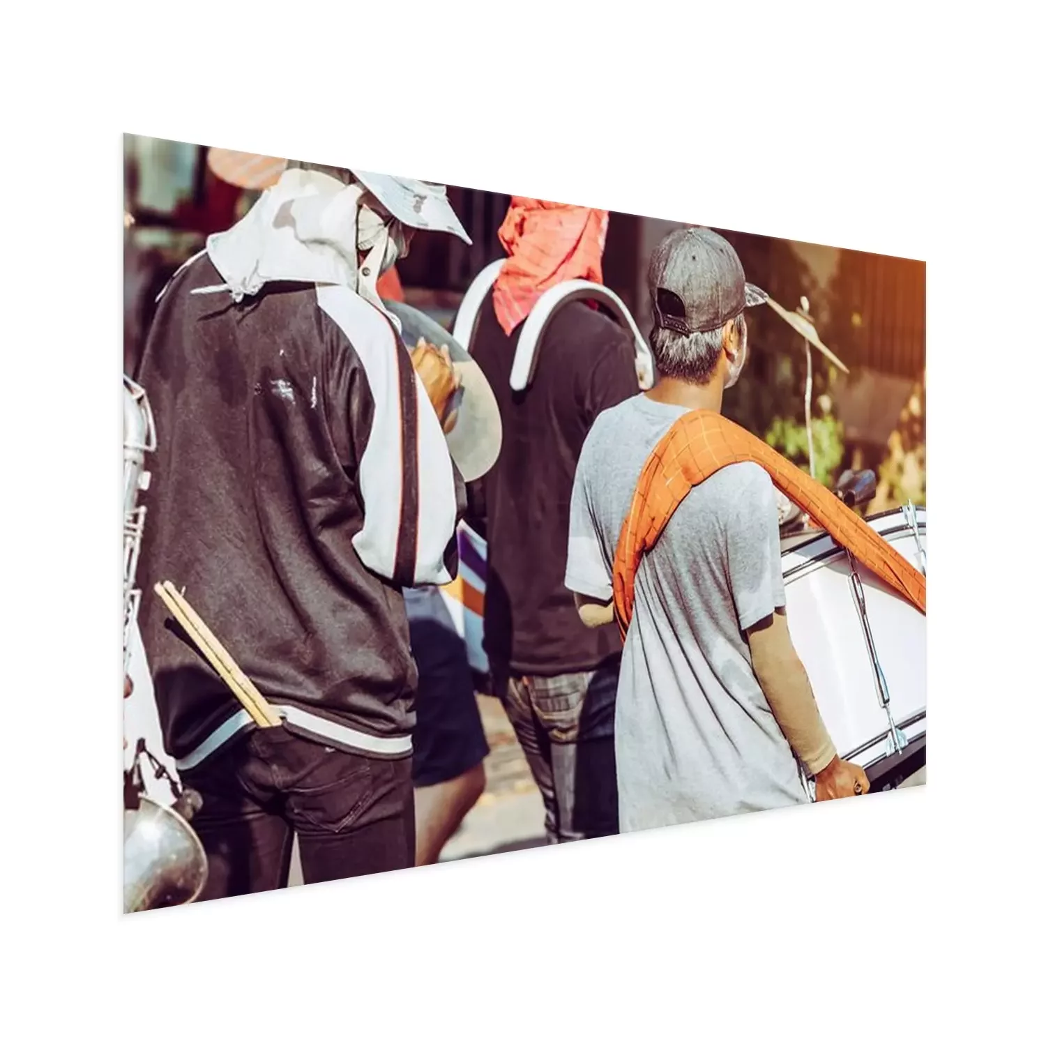 Poster  Jazz music parade of Thai happiness people wearing colorful clothes in famous Songkran Water Festival on street in Kanchanaburi, Thailand.