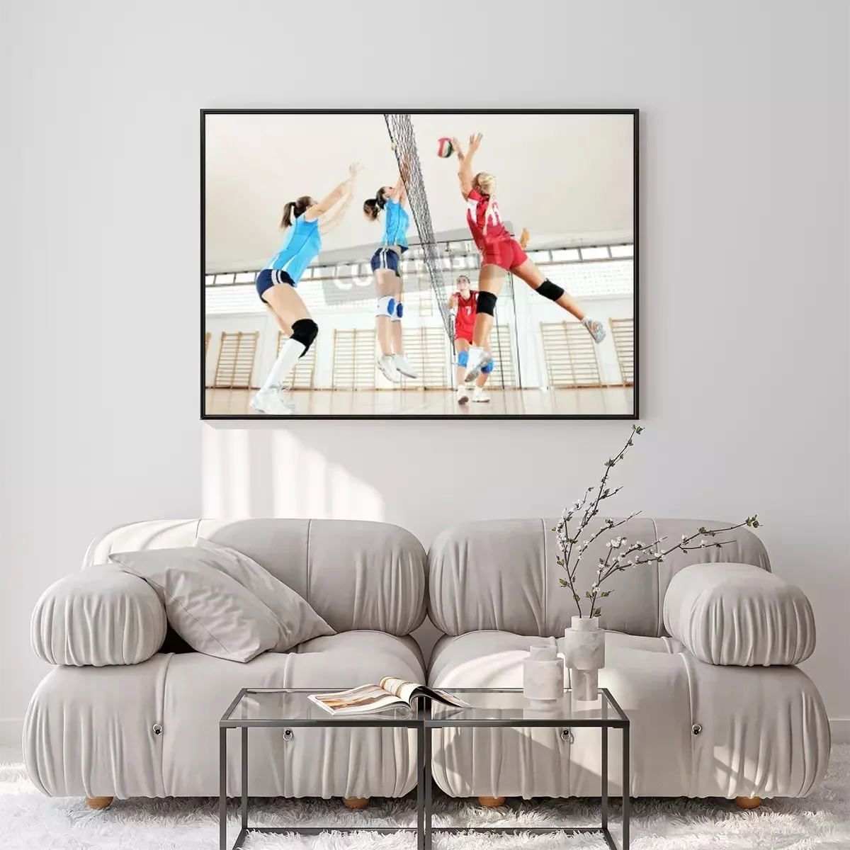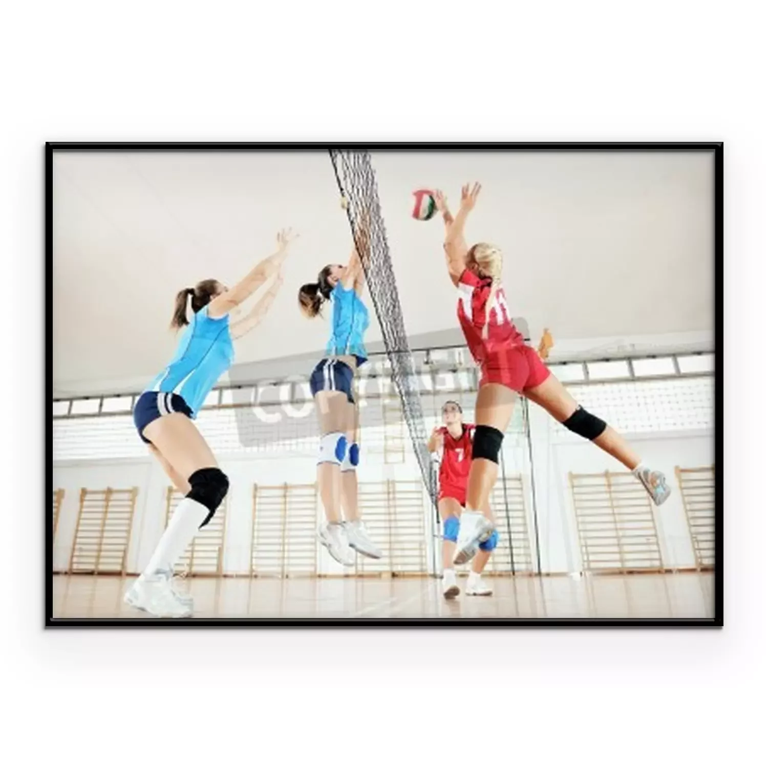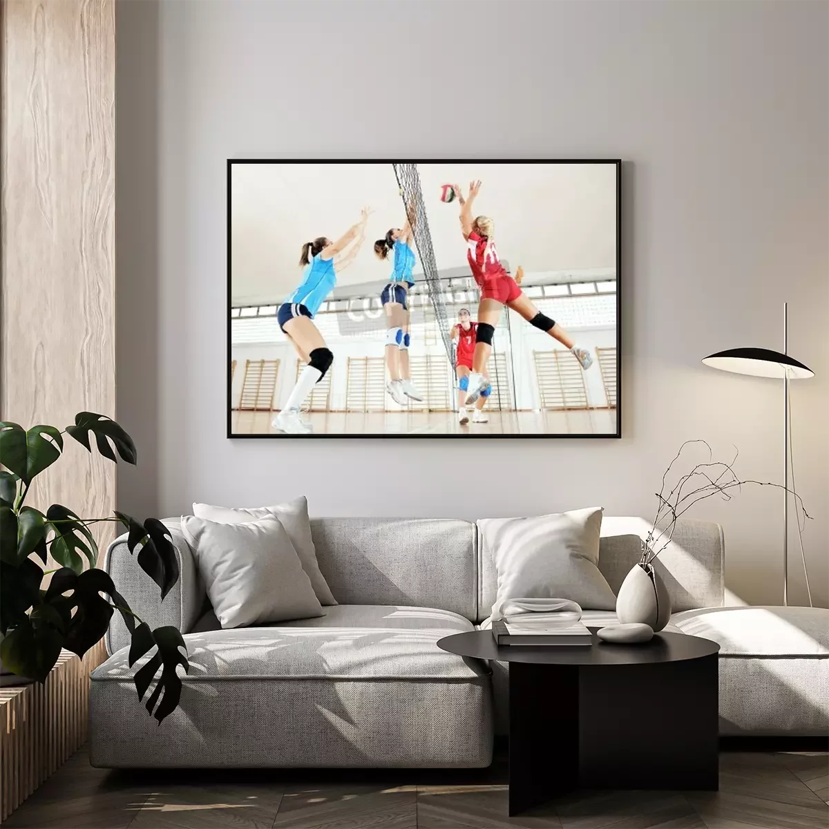 Poster : jeu de volley-ball du sport avec un groupe de belles jeunes filles à l'intérieur dans l'arène sportive