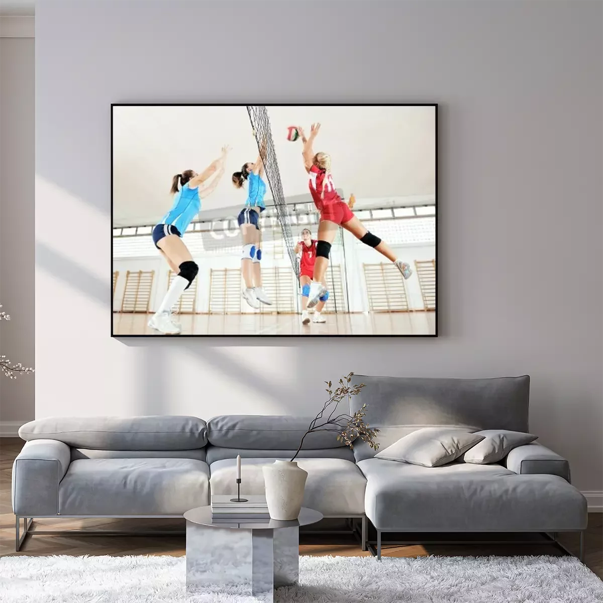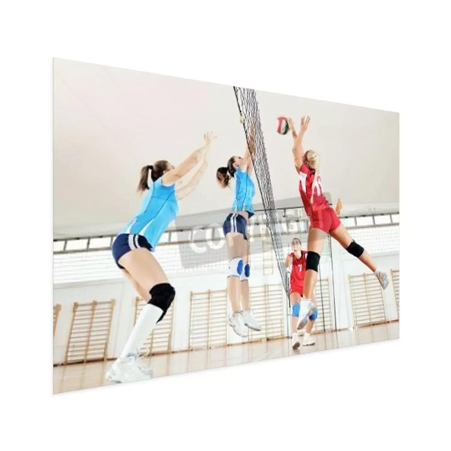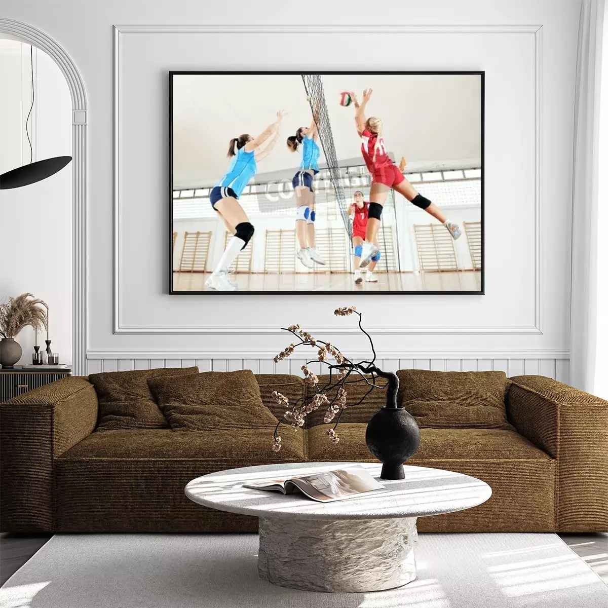 Poster : jeu de volley-ball du sport avec un groupe de belles jeunes filles à l'intérieur dans l'arène sportive