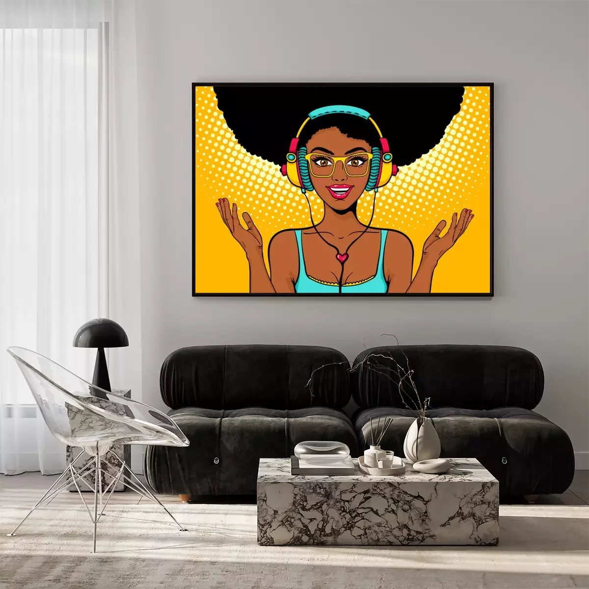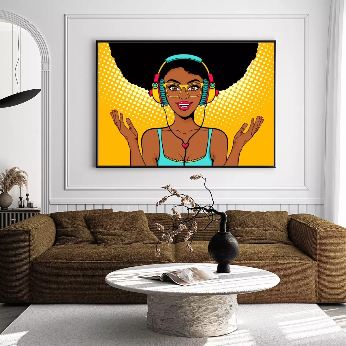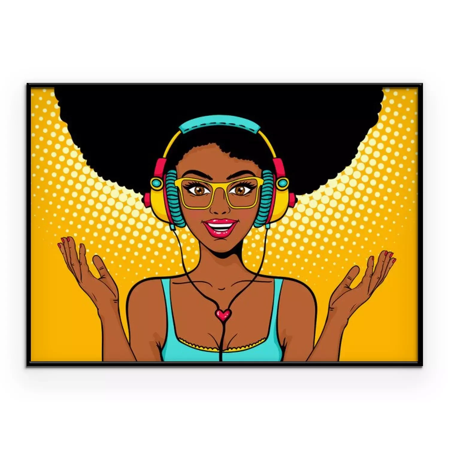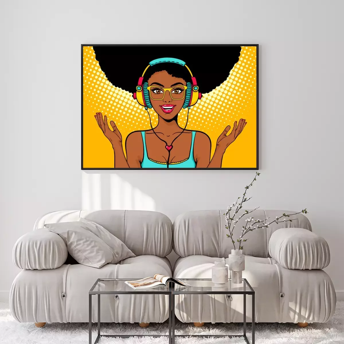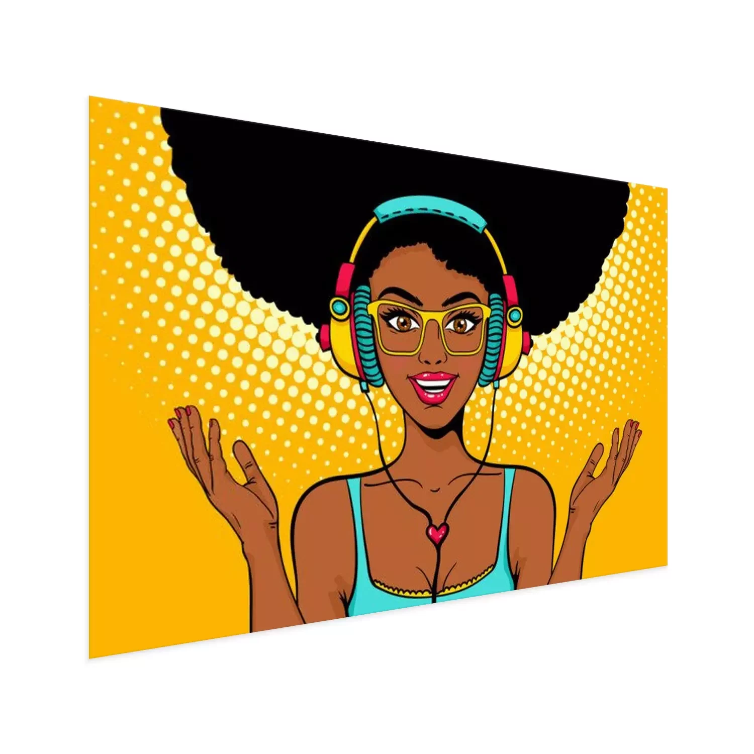 Poster  Jeune, africaine, Américain, noir, femme, ouvert, sourire, écouteurs, écoute, musique ... Vecteur, clair, fond, pop art, retro, comique, style Affiche d'invitation de partie.