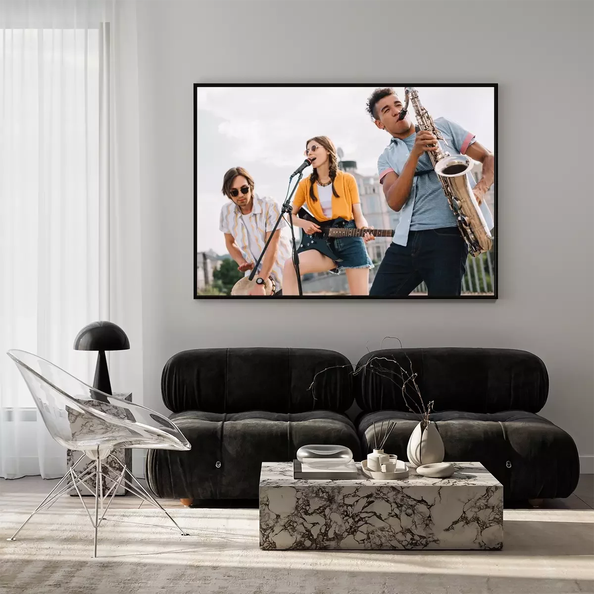 Poster  Jeunes multiraciales avec guitare, djembé et saxophone se produisant dans la rue