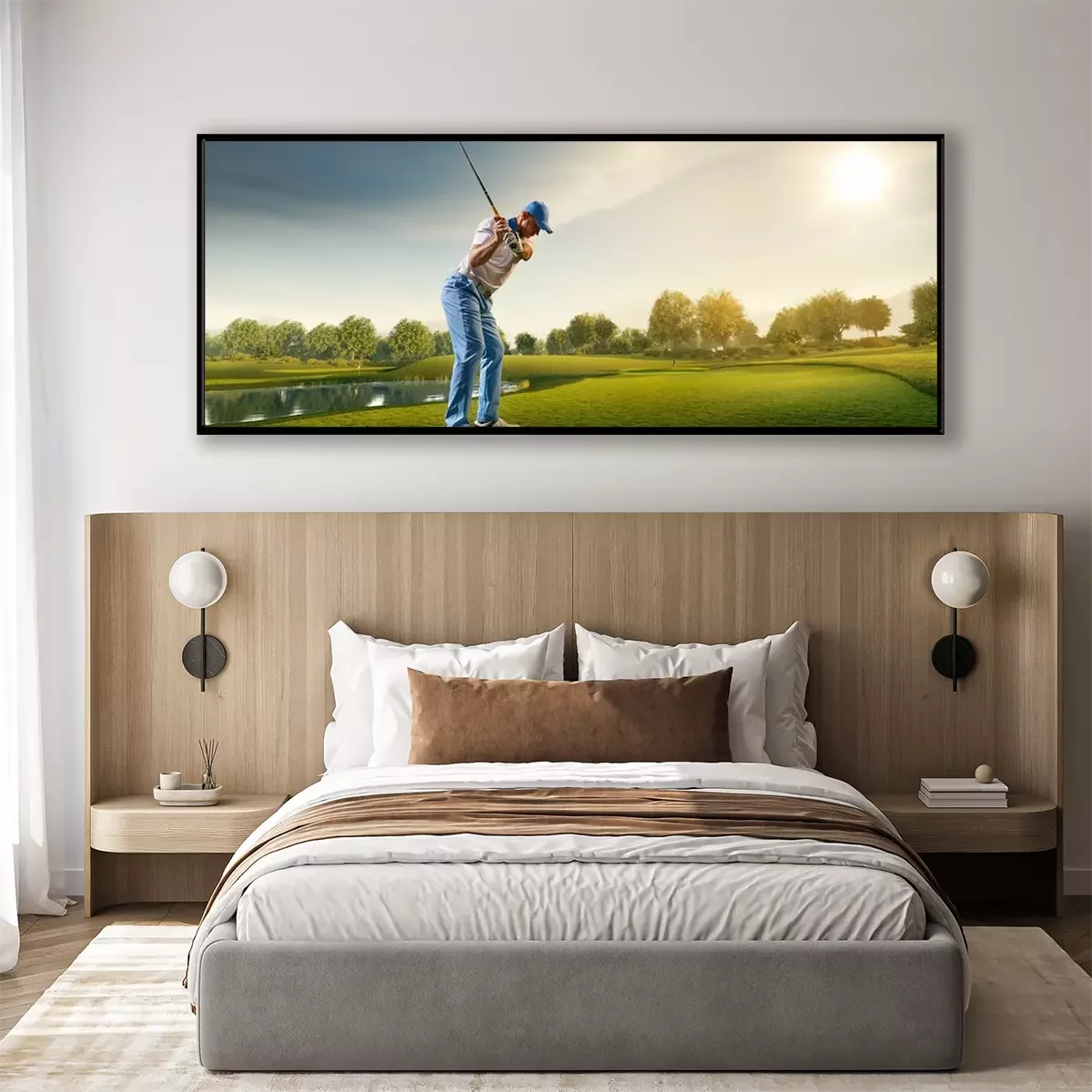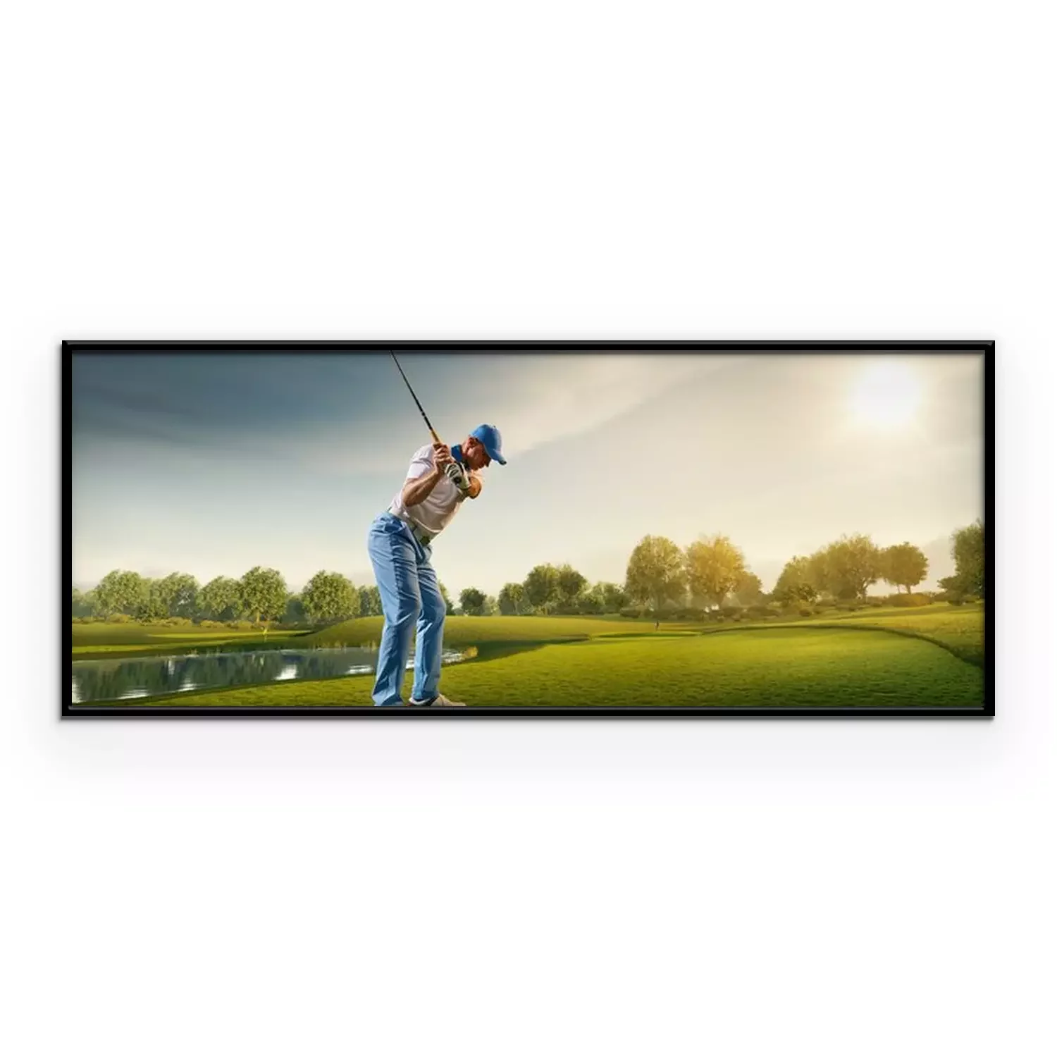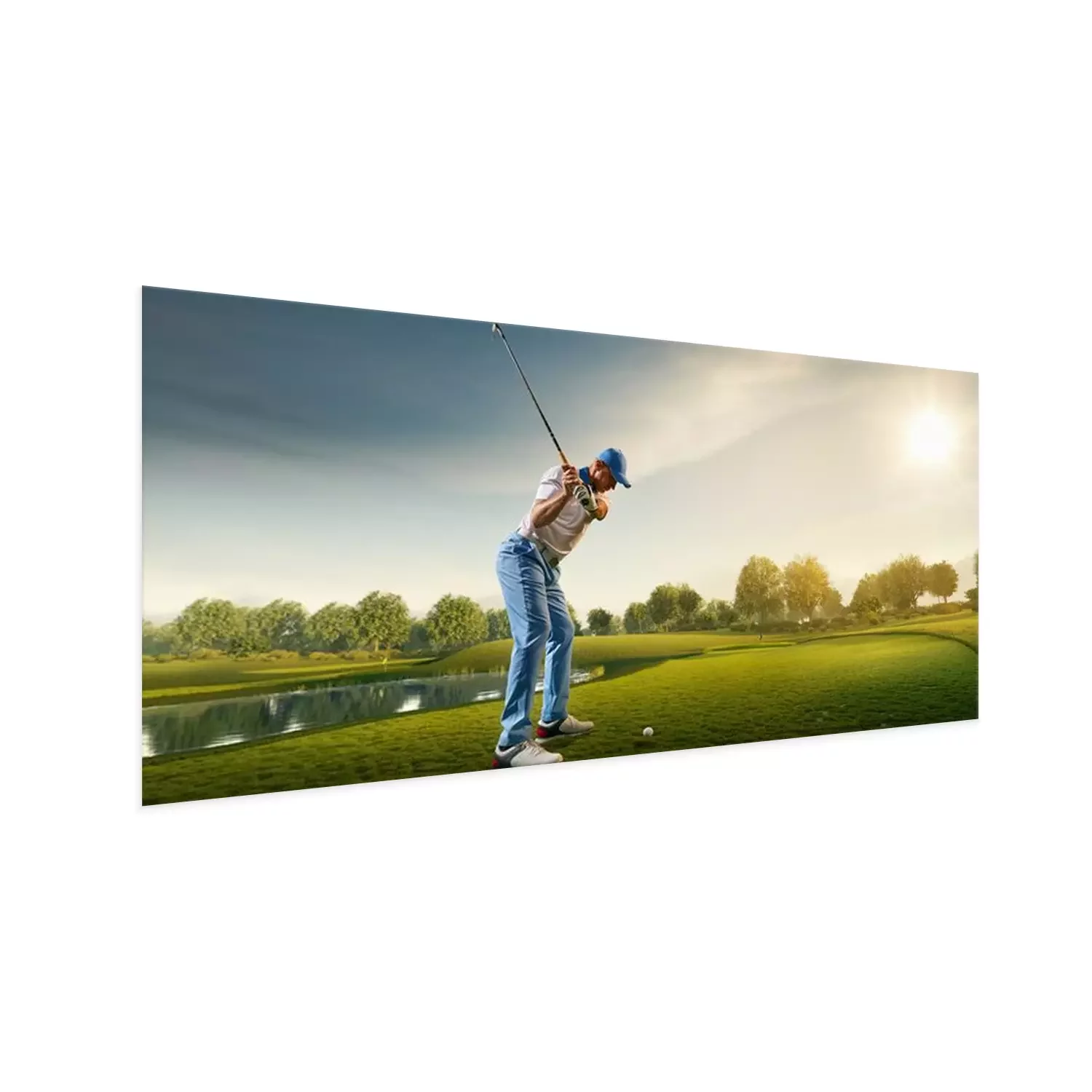 Poster  Joueur de golf masculin sur un parcours de golf professionnel. Golfeur avec club de golf prenant un coup