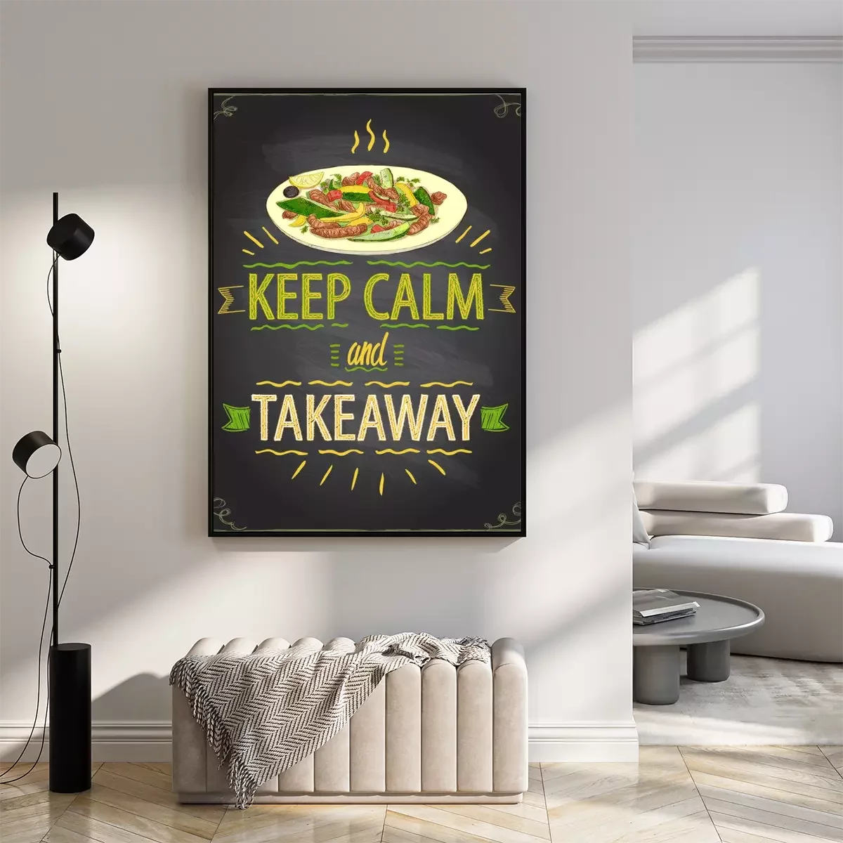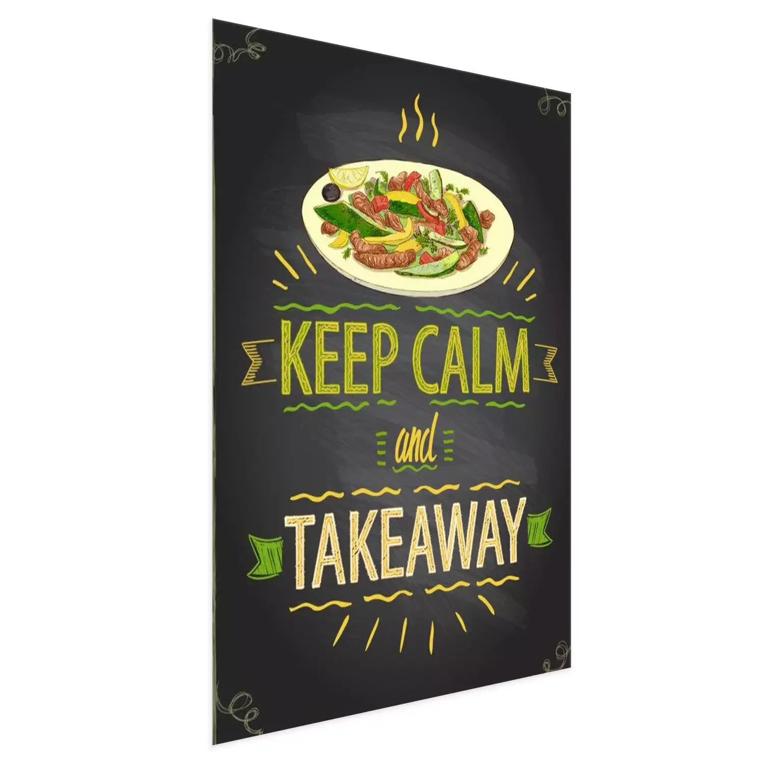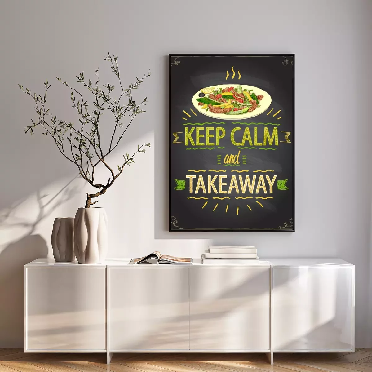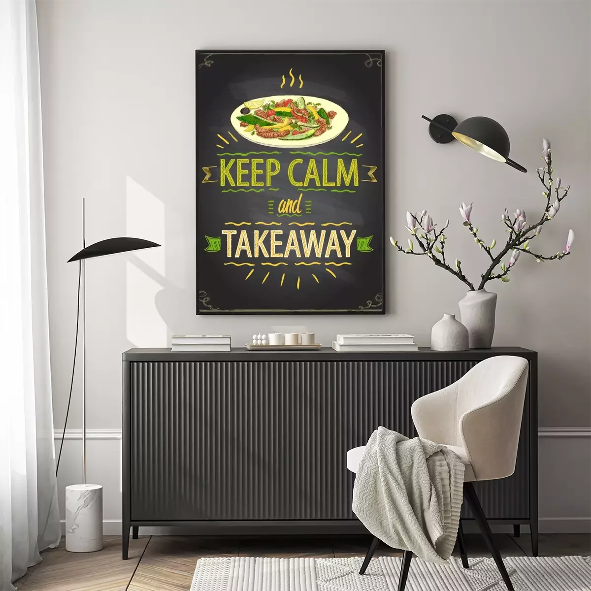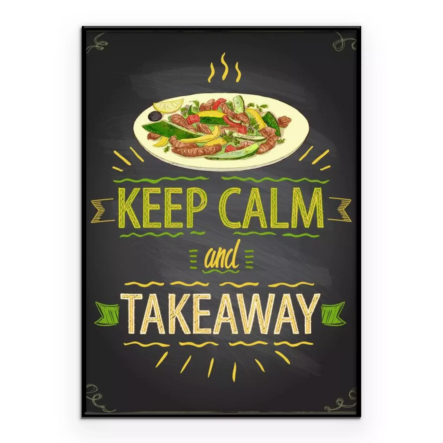 Poster : Keep calm and takeaway, chalk motivational card with warm salad takeout