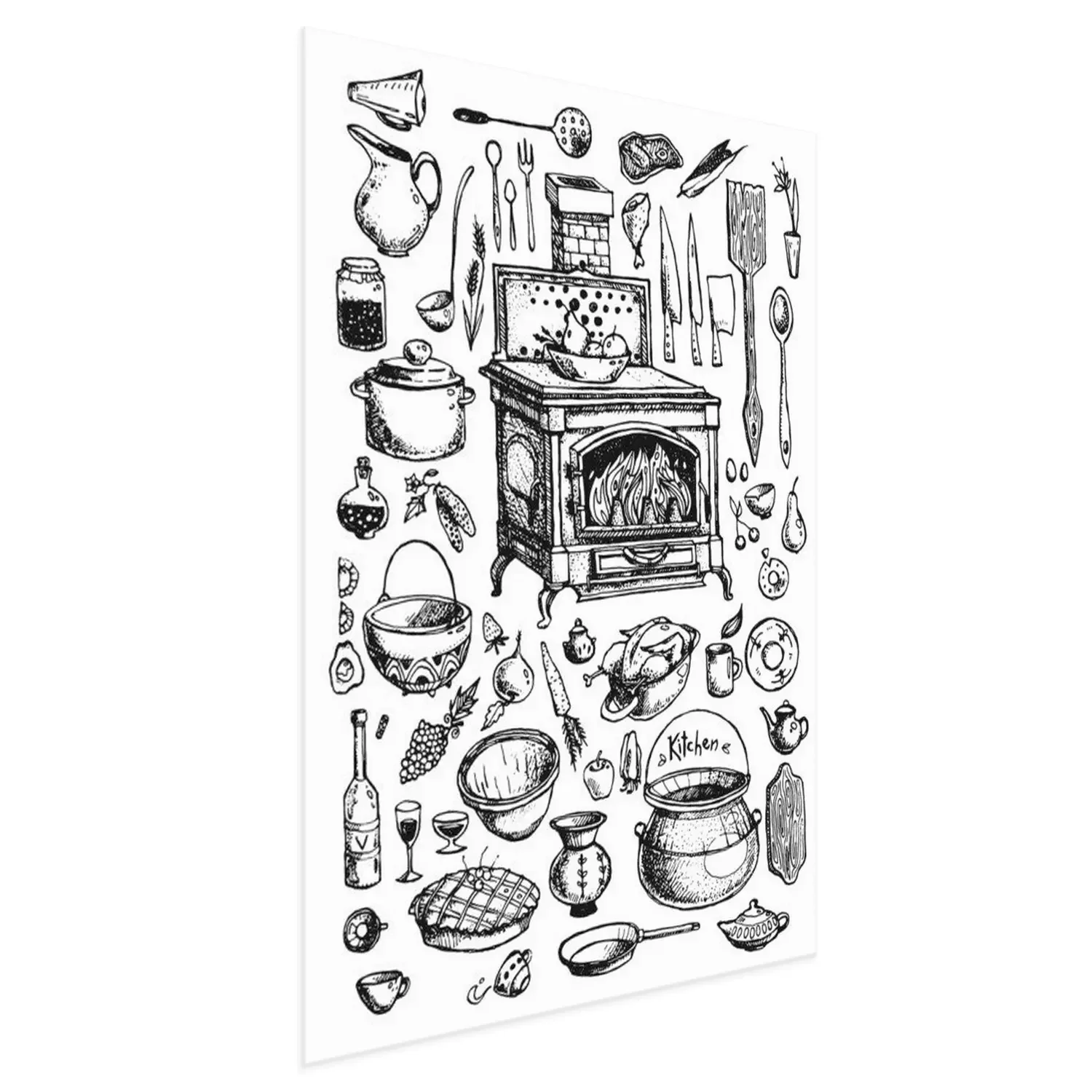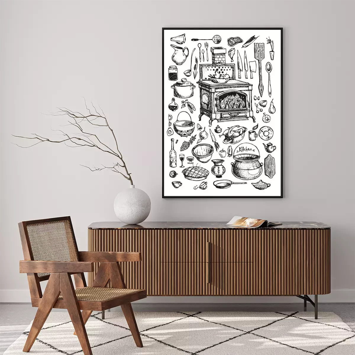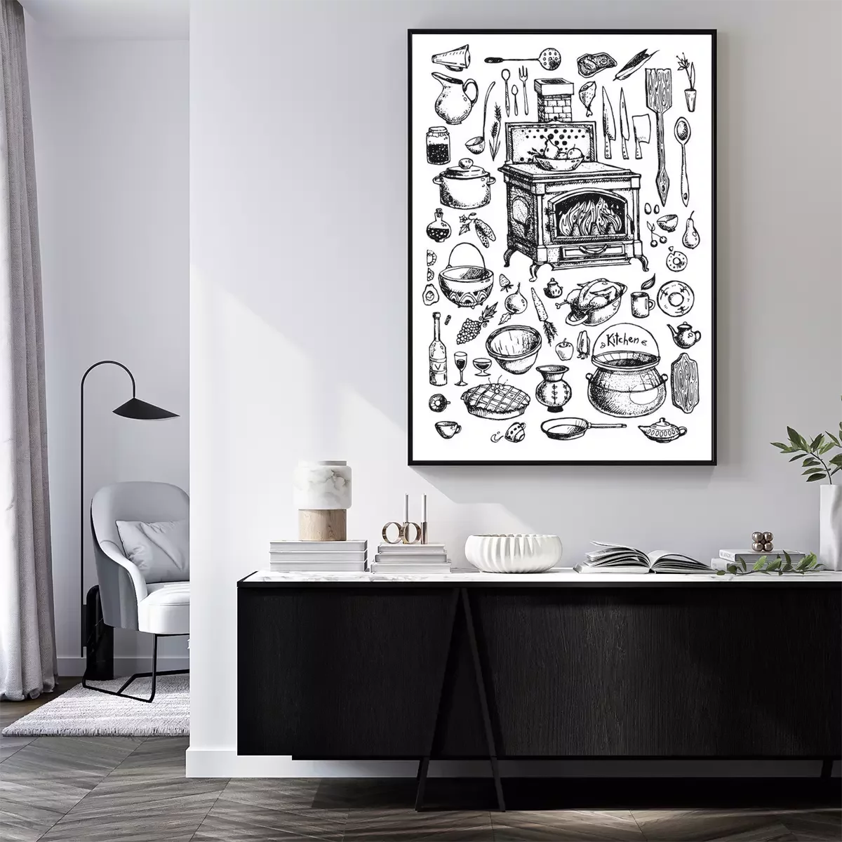 Poster  L'ensemble des ustensiles de cuisine vintage. Collection de vieux trucs de cuisine. Illustration de dessinés à la main d'encre. Four ancien, assiettes, cuillères, couteaux, casseroles, bouilloires, et