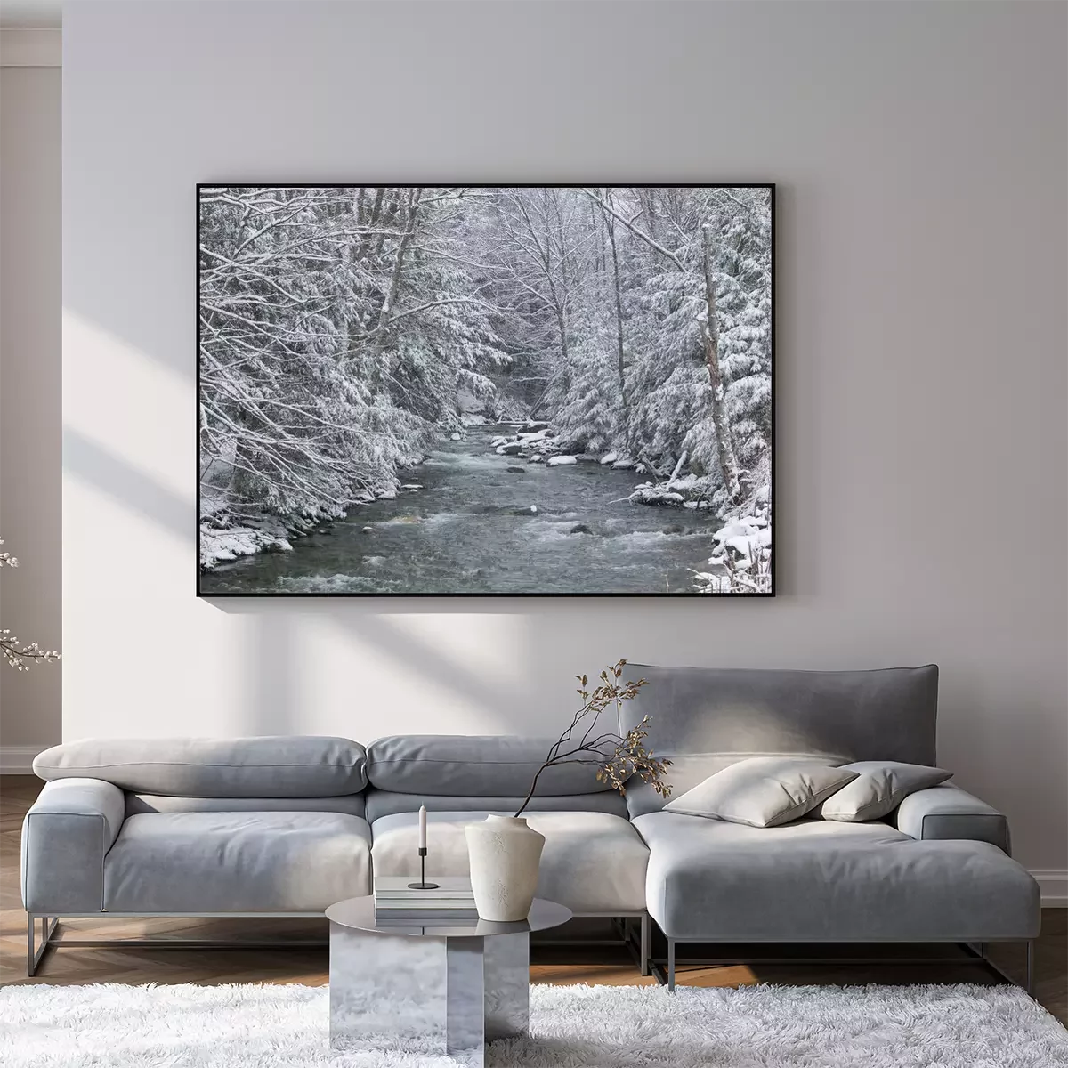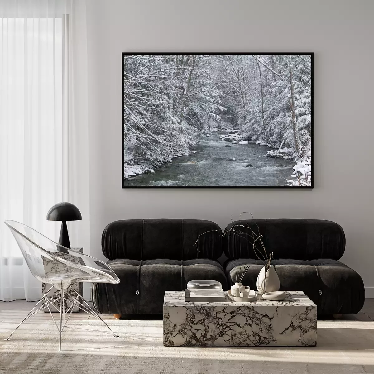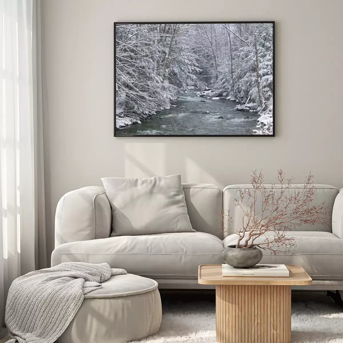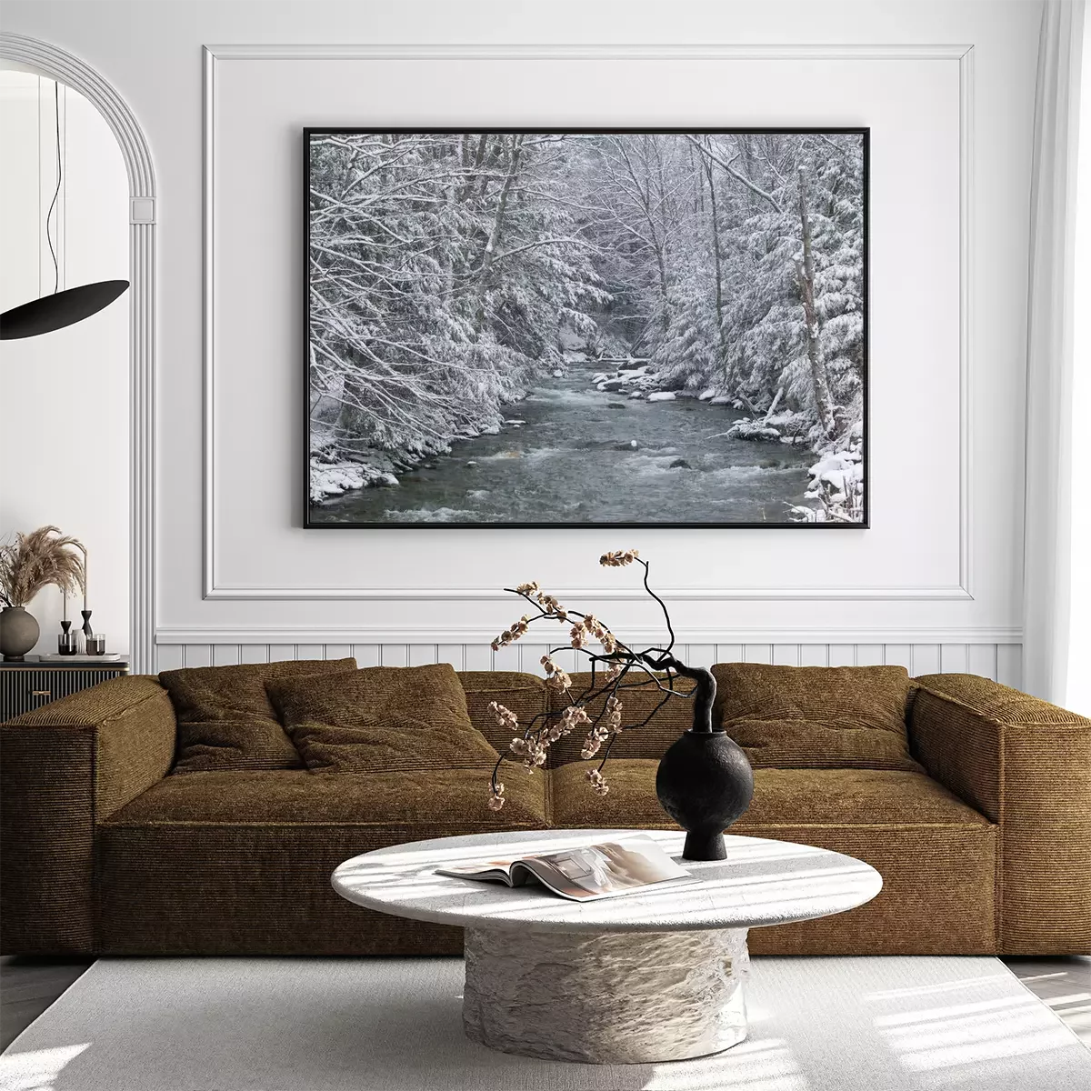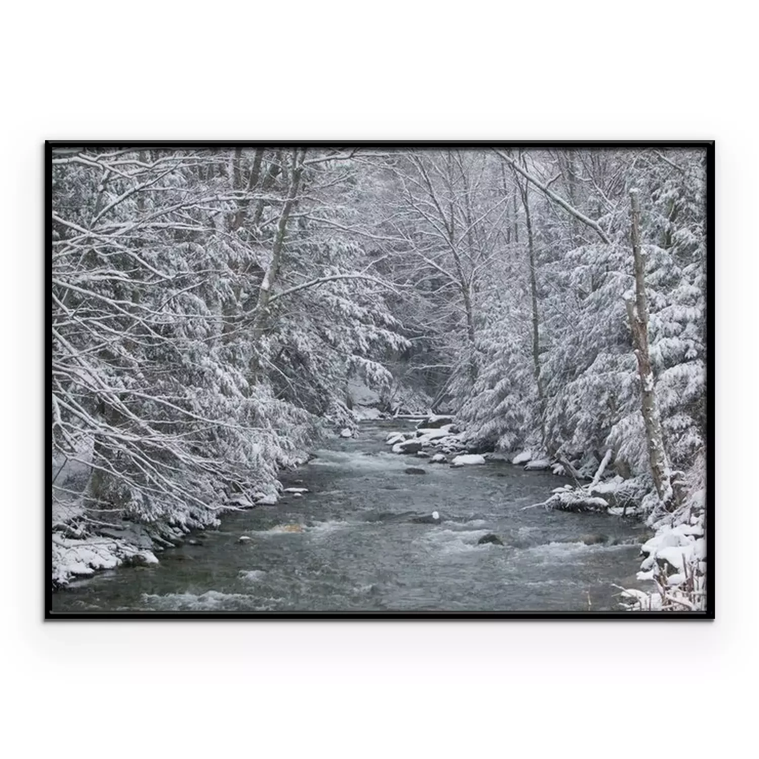 Poster : La neige recouvre les arbres de pins sur le côté d'une rivière en hiver.