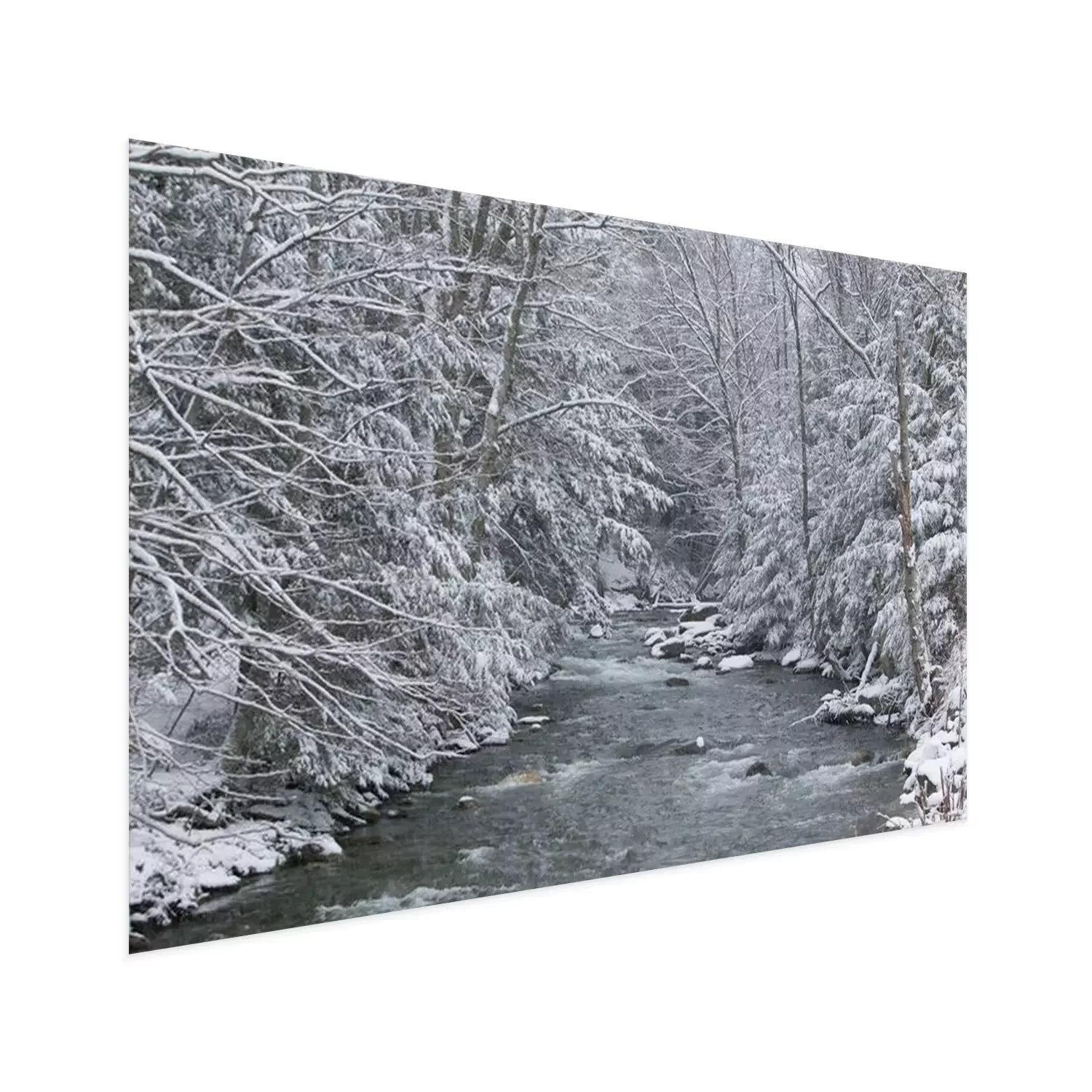 Poster  La neige recouvre les arbres de pins sur le côté d'une rivière en hiver.