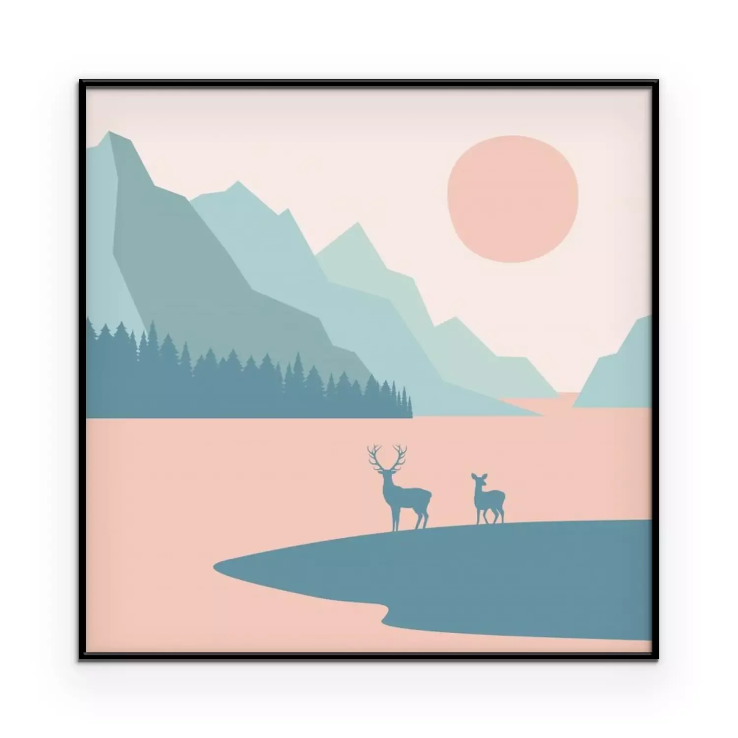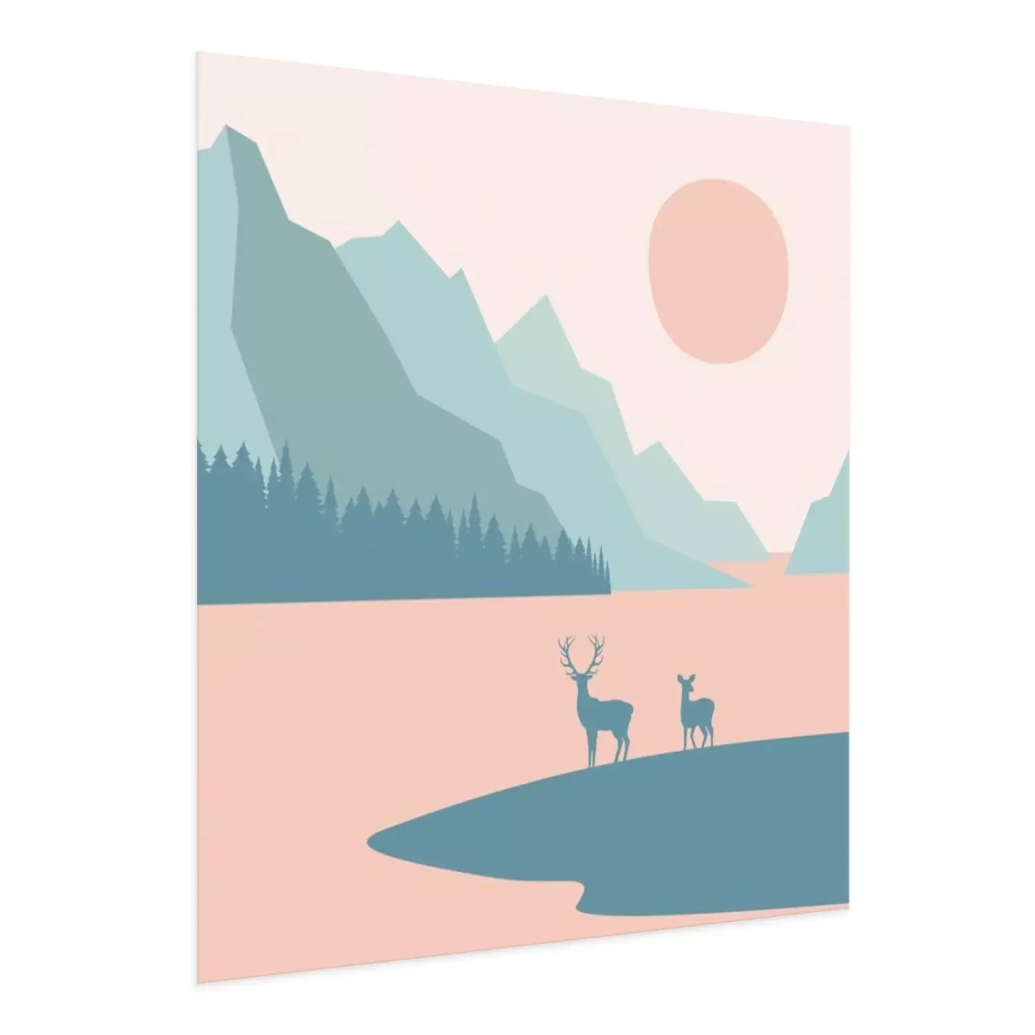 Poster : Landscape, Deers on a background of mountains, forests and a lake