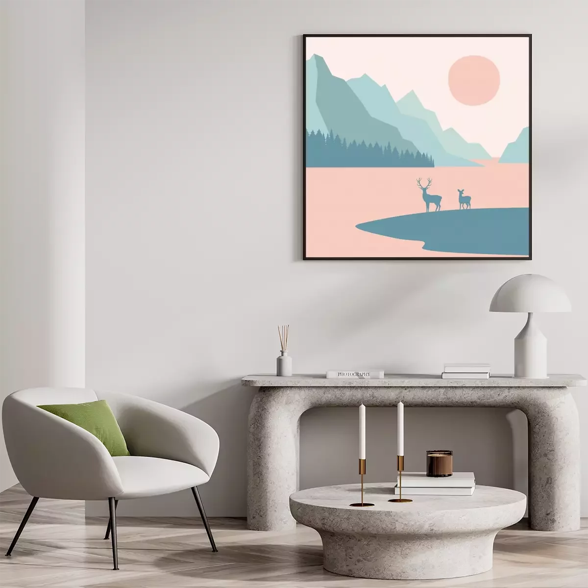 Poster  Landscape, Deers on a background of mountains, forests and a lake