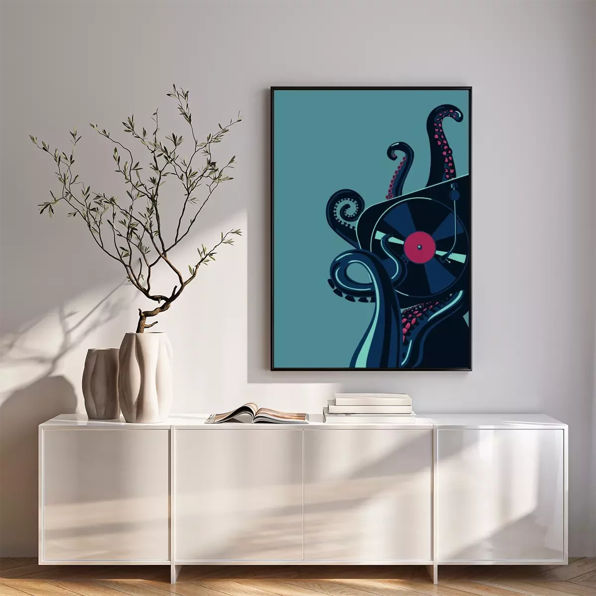 Poster : Les tentacules d'Octopus avec plateau tournant vinyle. Modèle d'affiche de fête.