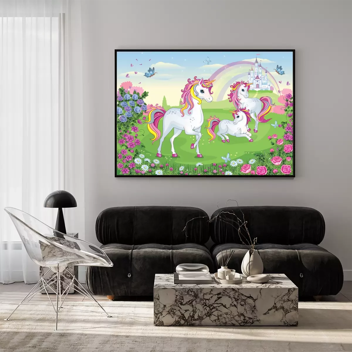 Poster  Licornes féeriques parmi les fleurs avec un château et un arc-en-ciel