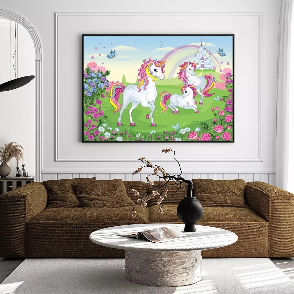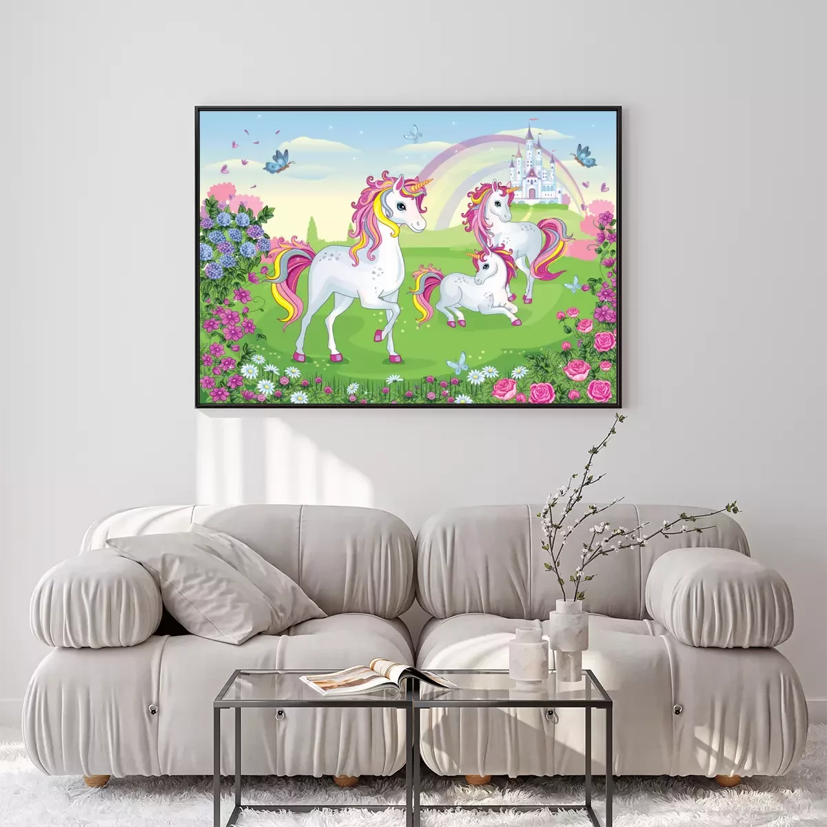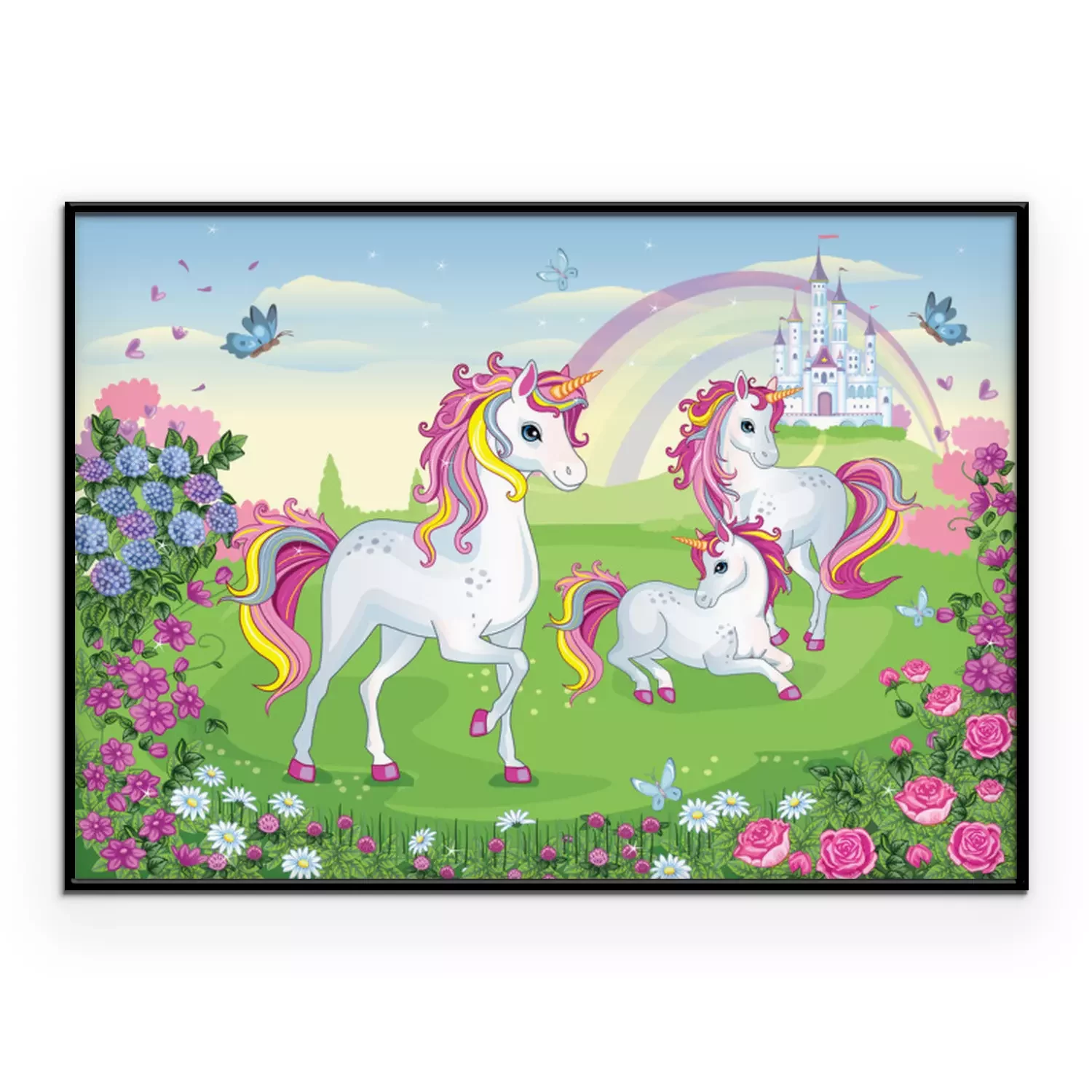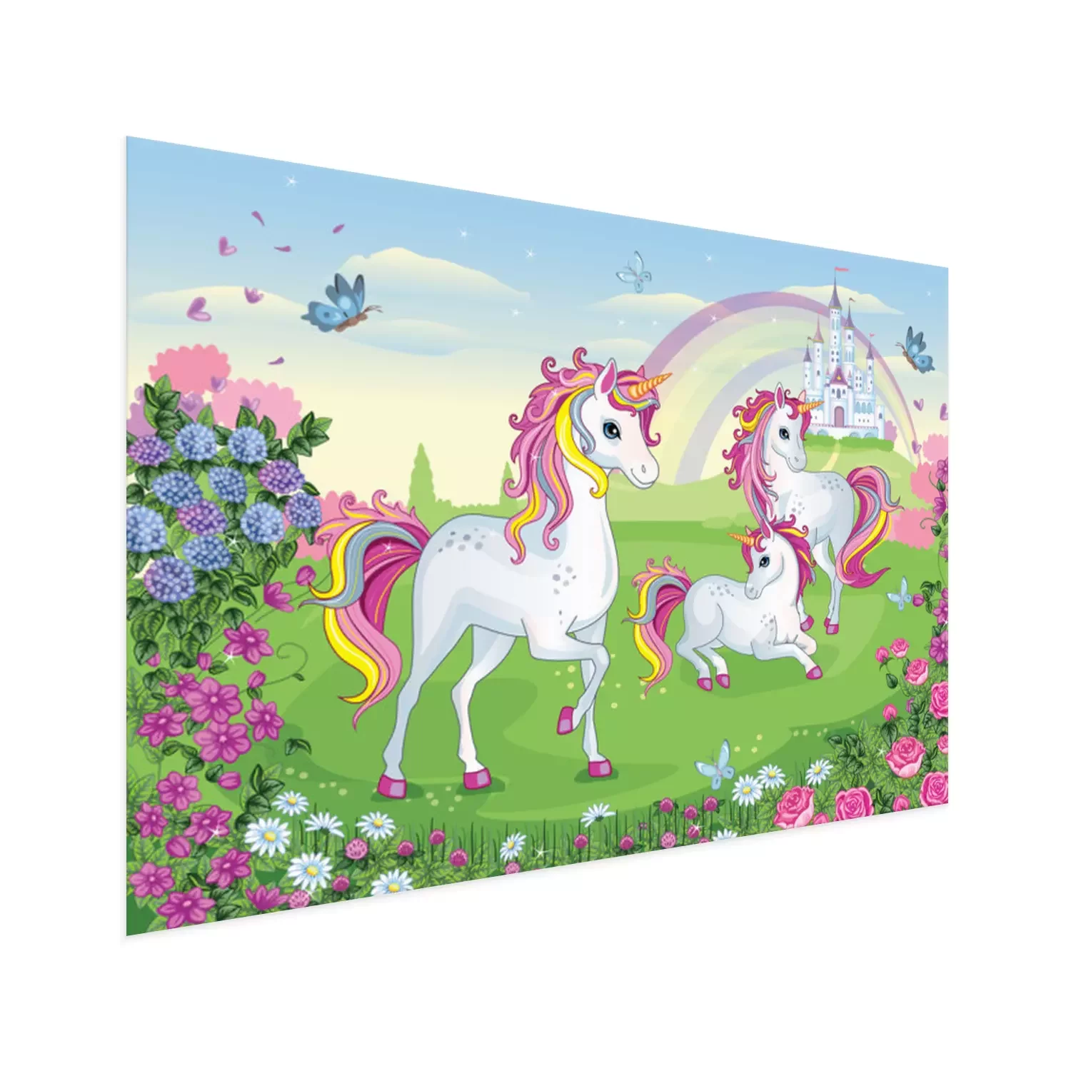 Poster : Licornes féeriques parmi les fleurs avec un château et un arc-en-ciel