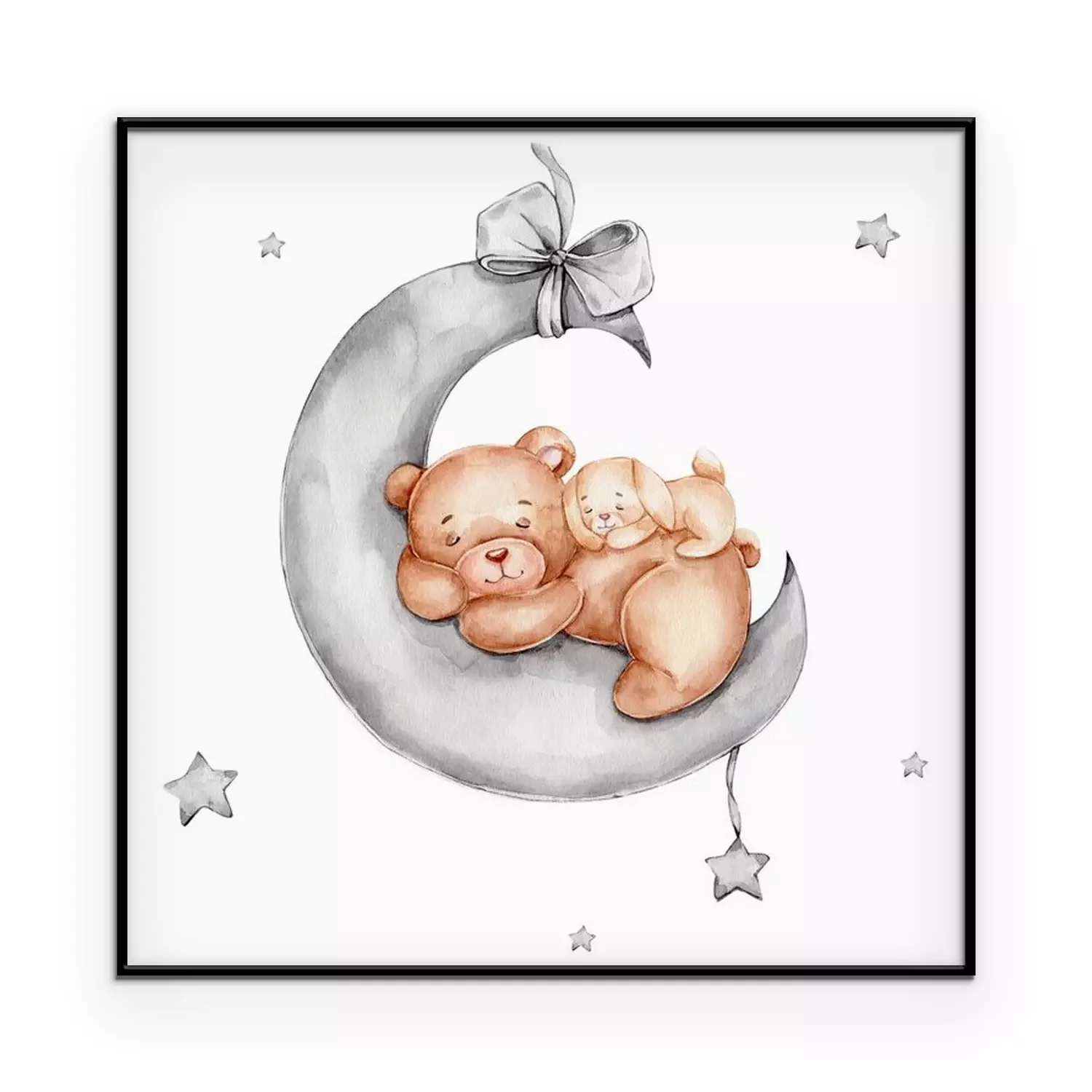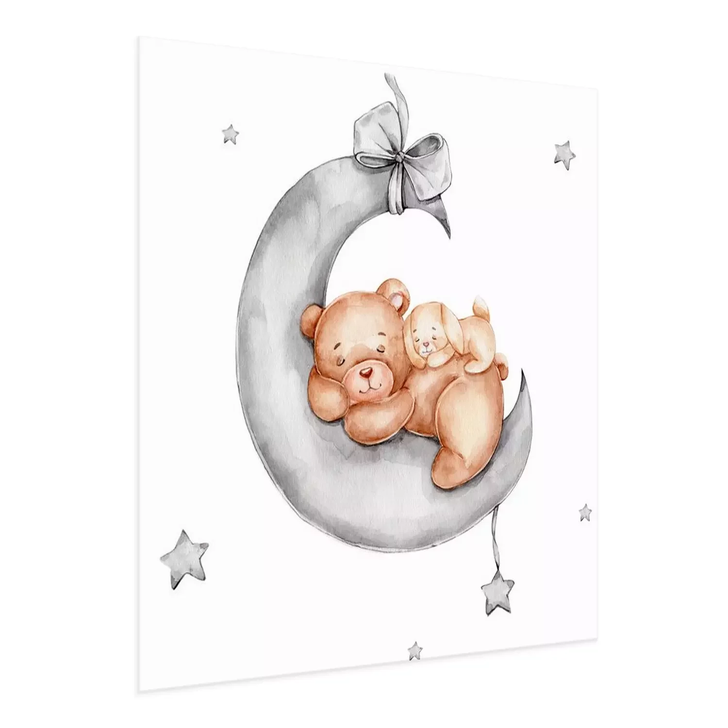 Cute sleeping teddy bear on the silver moon; watercolor hand draw illustration; with white isolated background