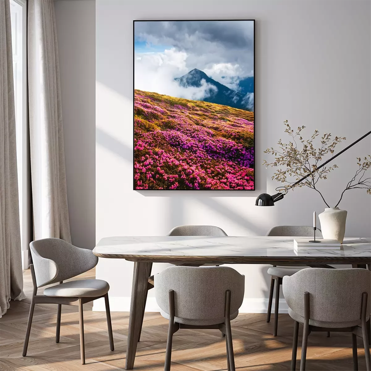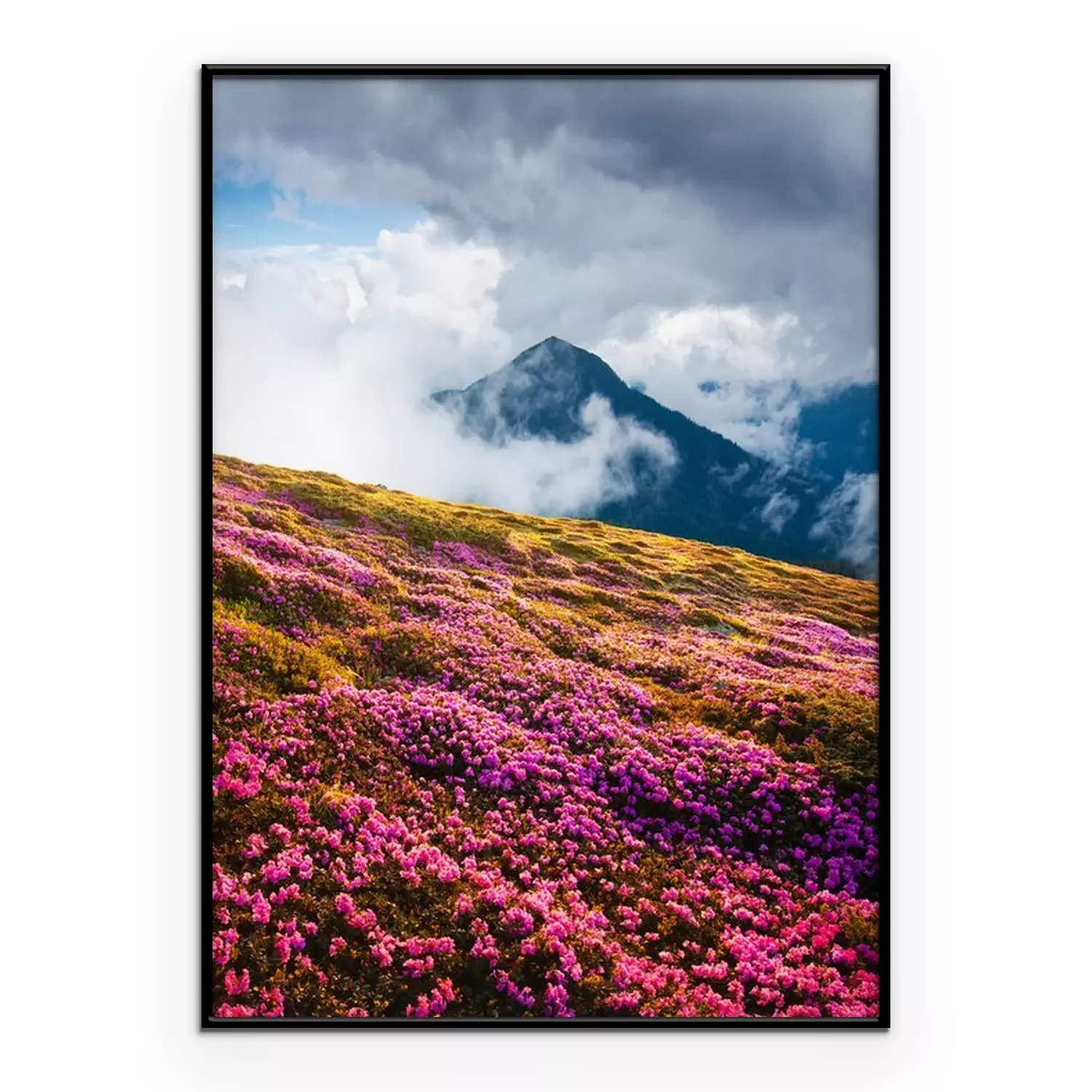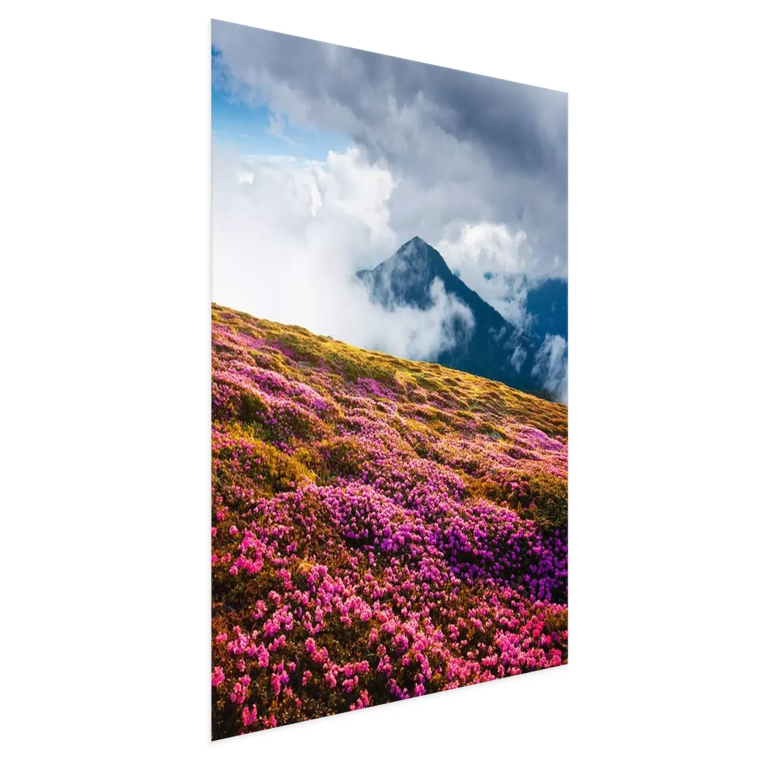 Poster  Magic pink rhododendron flowers on summer mountains. Dramatic cloudy sky and foggy meadow