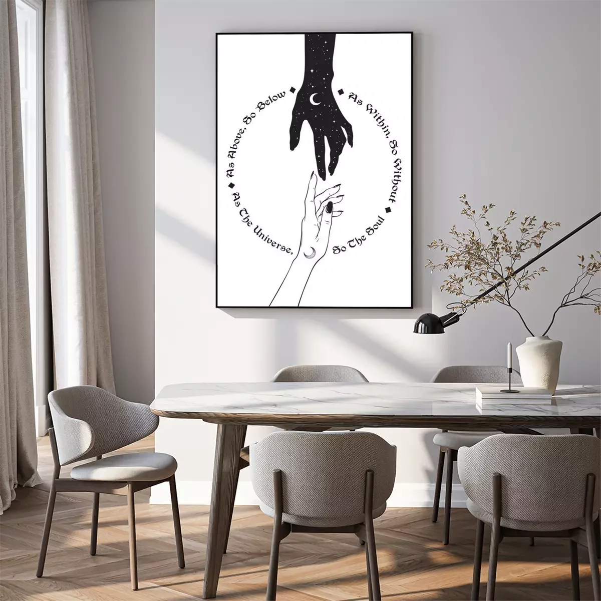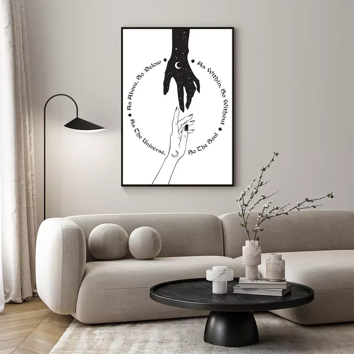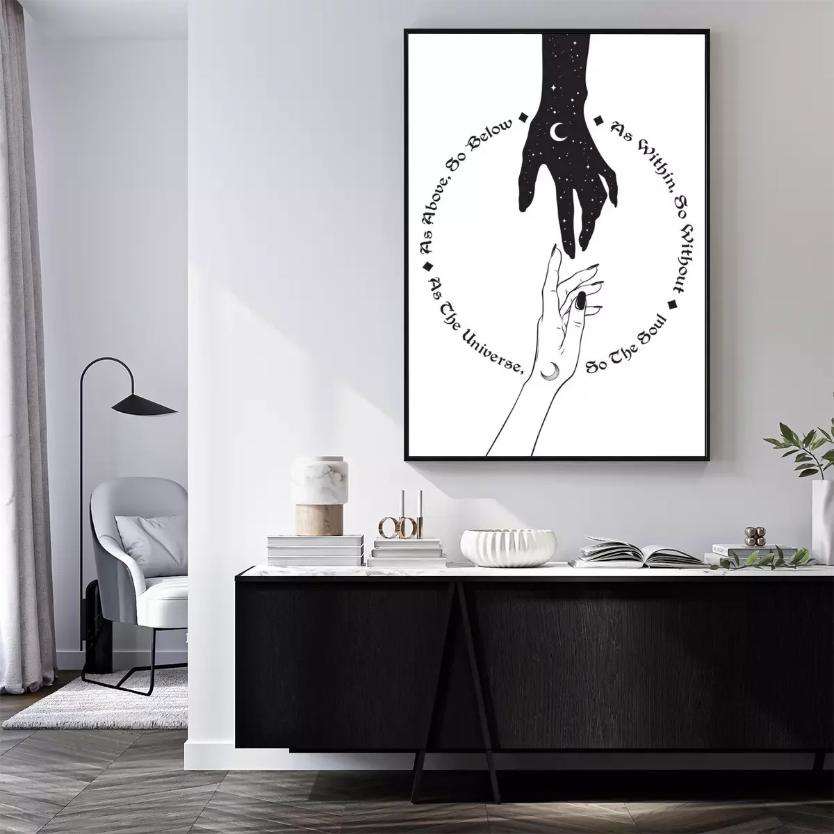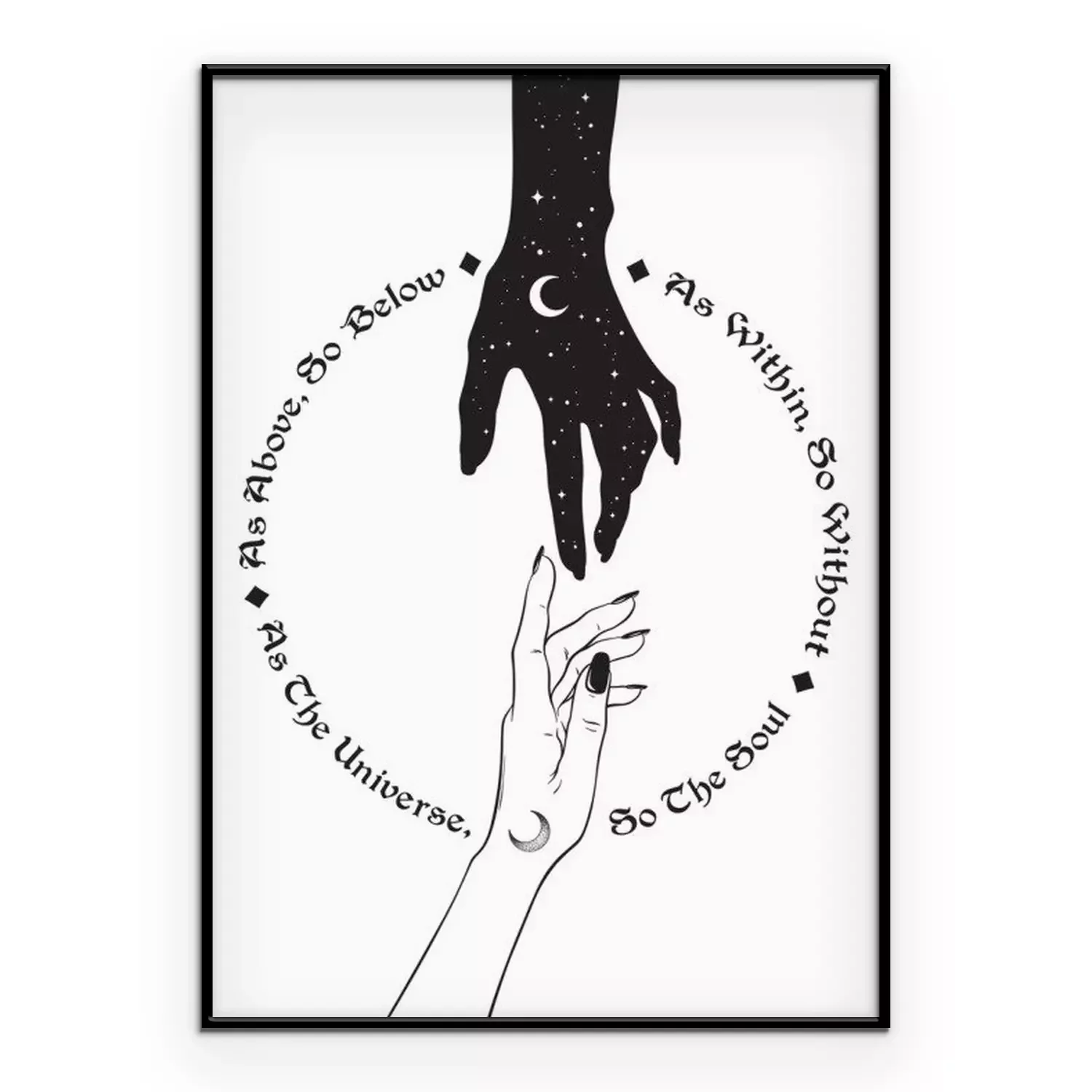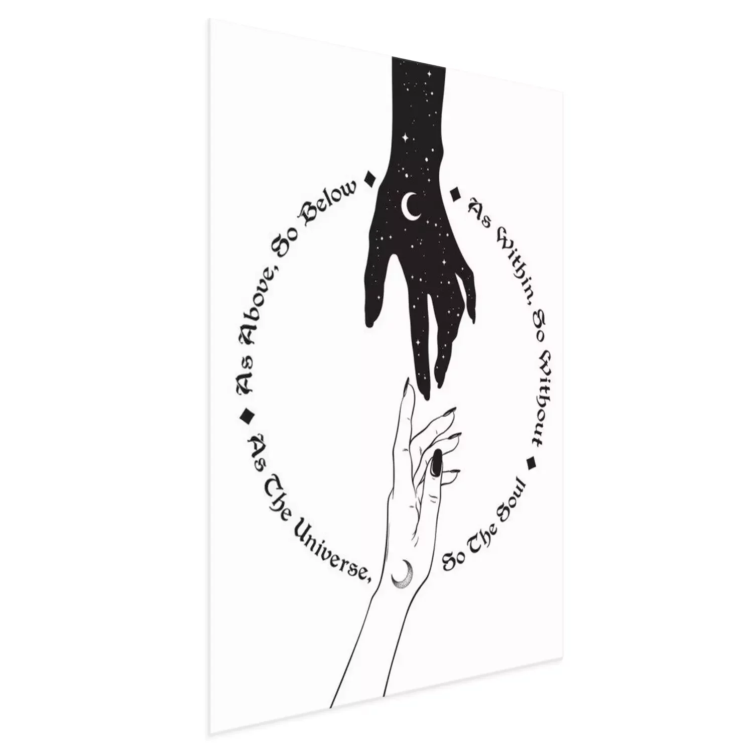 Poster  Main de l'univers tendre la main à l'homme. L'inscription est une maxime en hermétisme et en géométrie sacrée. Comme ci-dessus, donc ci-dessous. Travail noir, tatouage flash ou illustration vectoriell