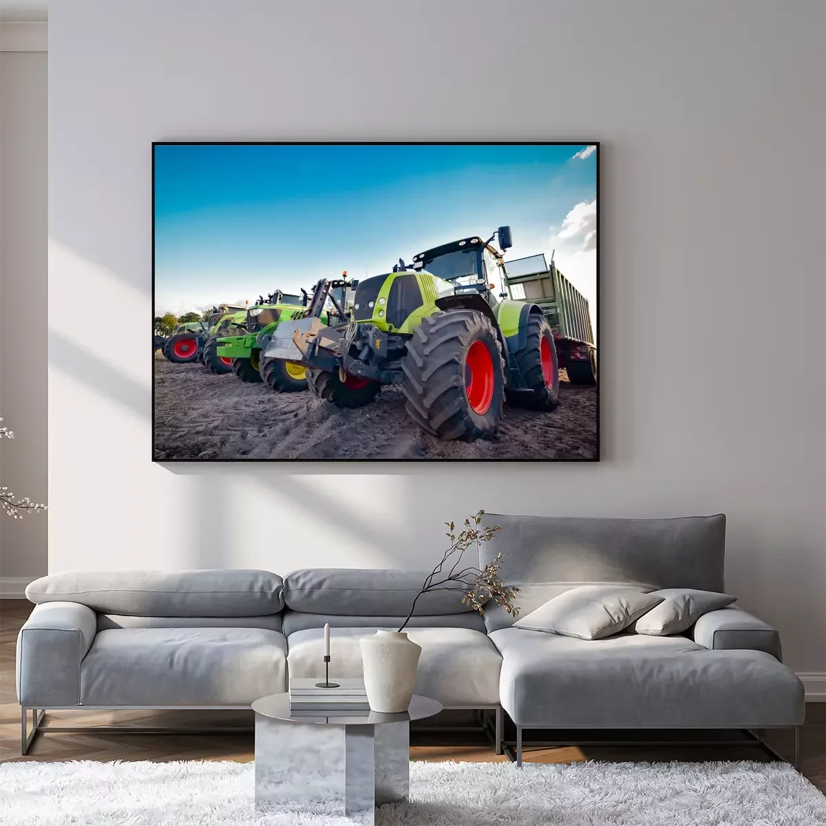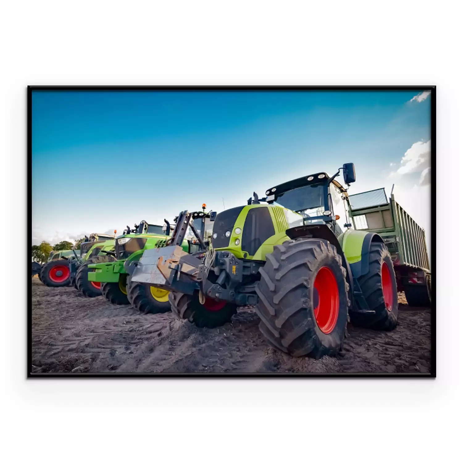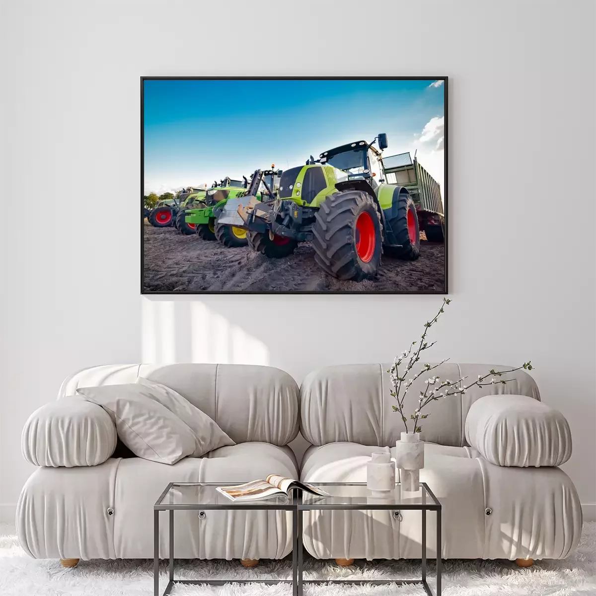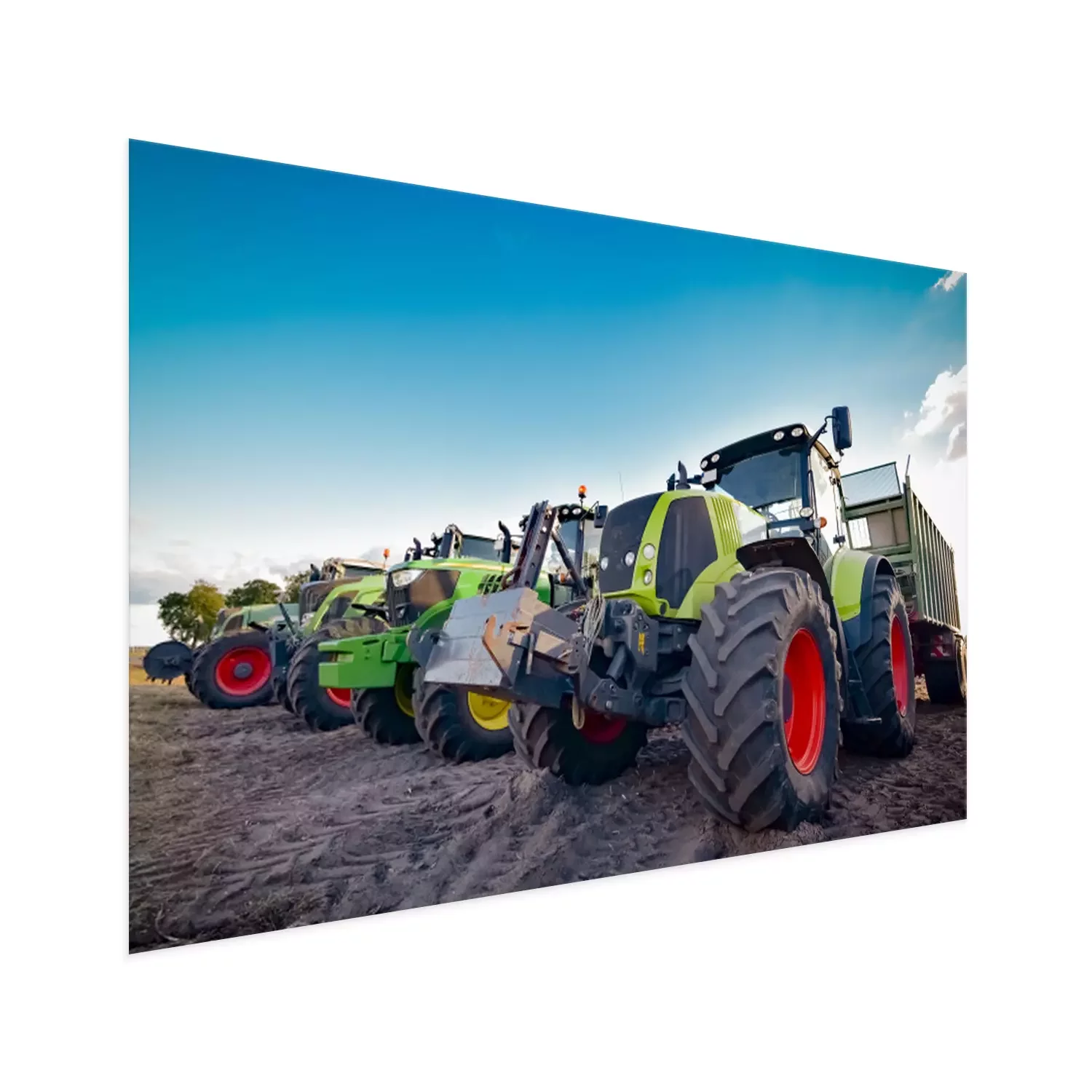 Poster  Maïs récolté, tracteurs et wagons placés côte à côte