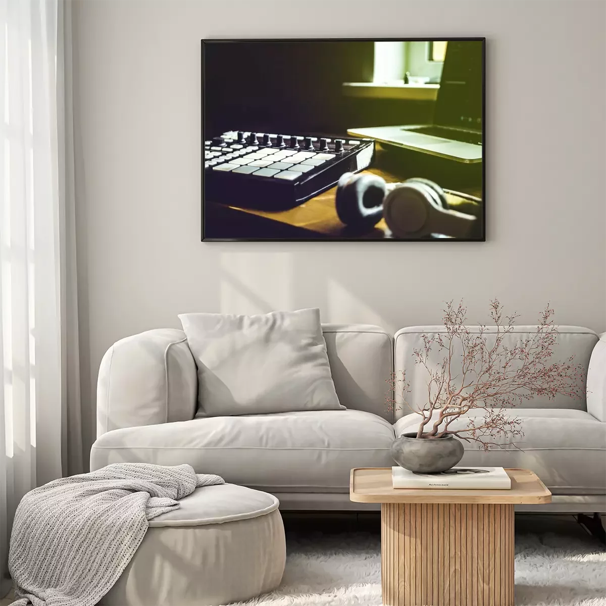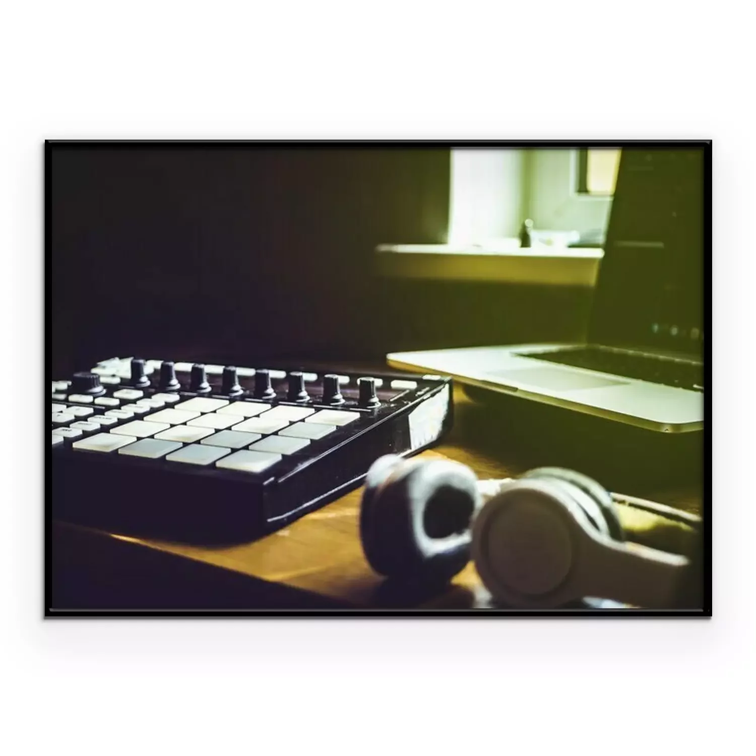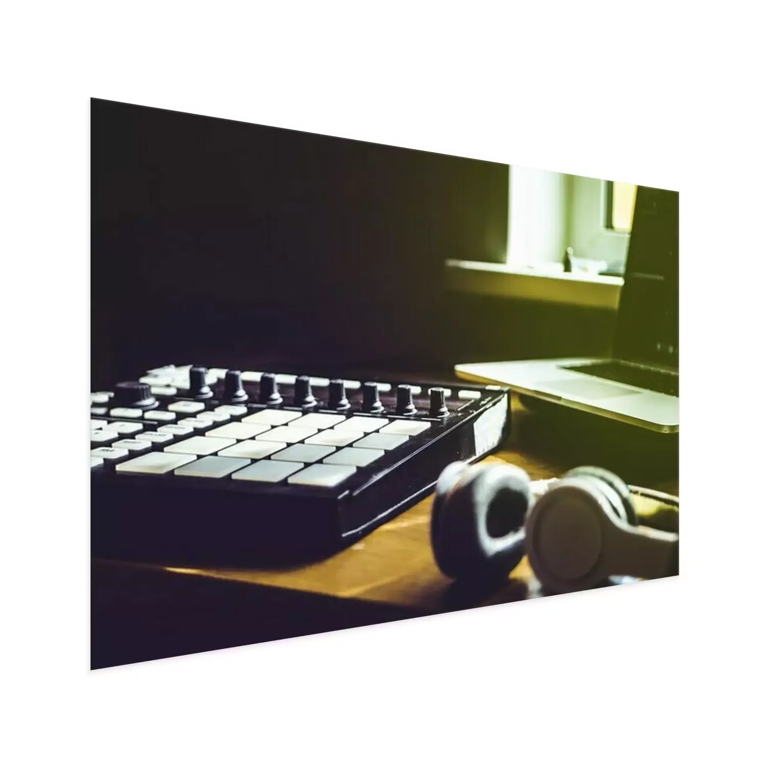 Poster  making hip hop beats on the drum machine controller at the home studio