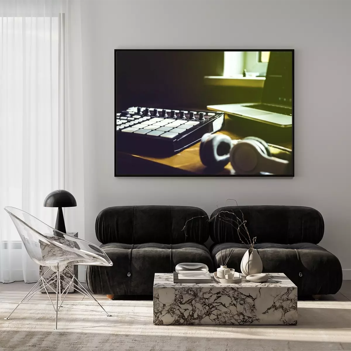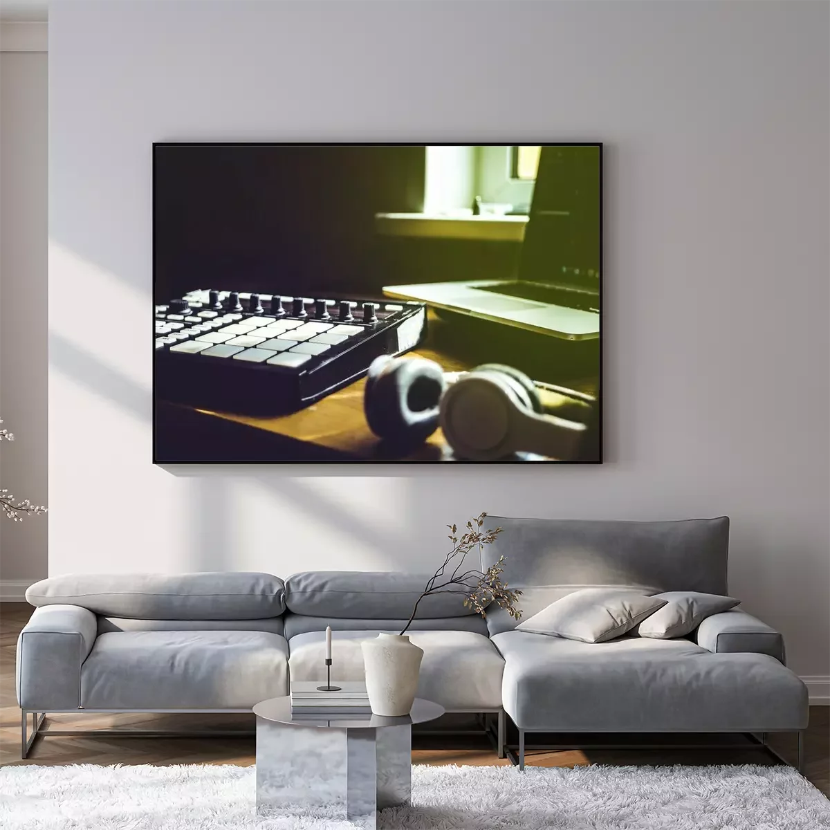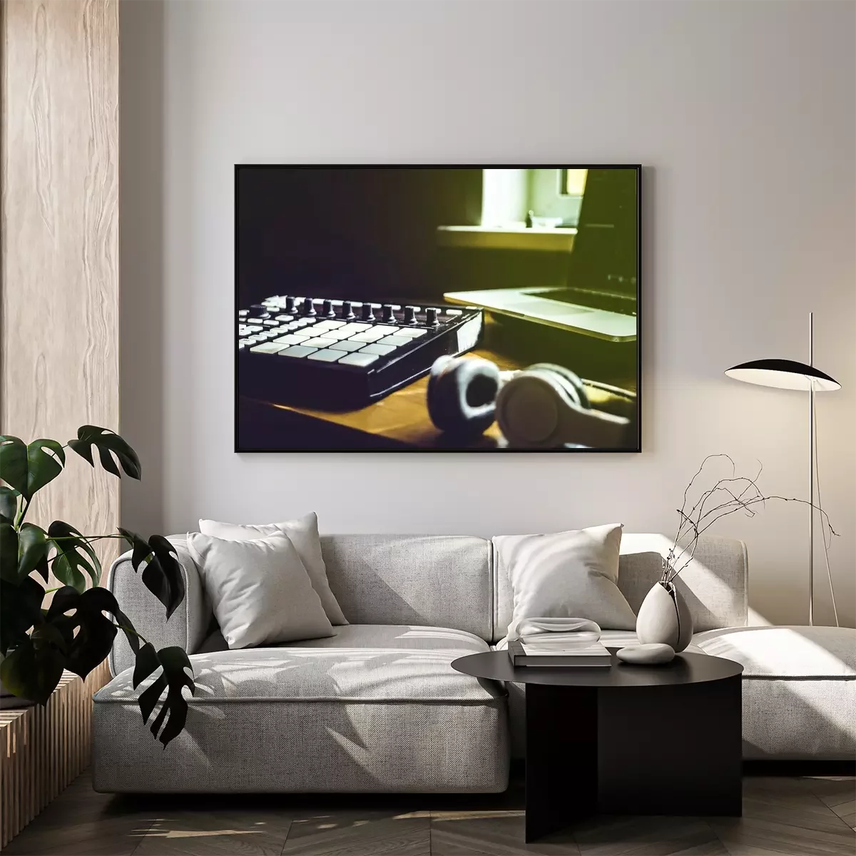 Poster  making hip hop beats on the drum machine controller at the home studio