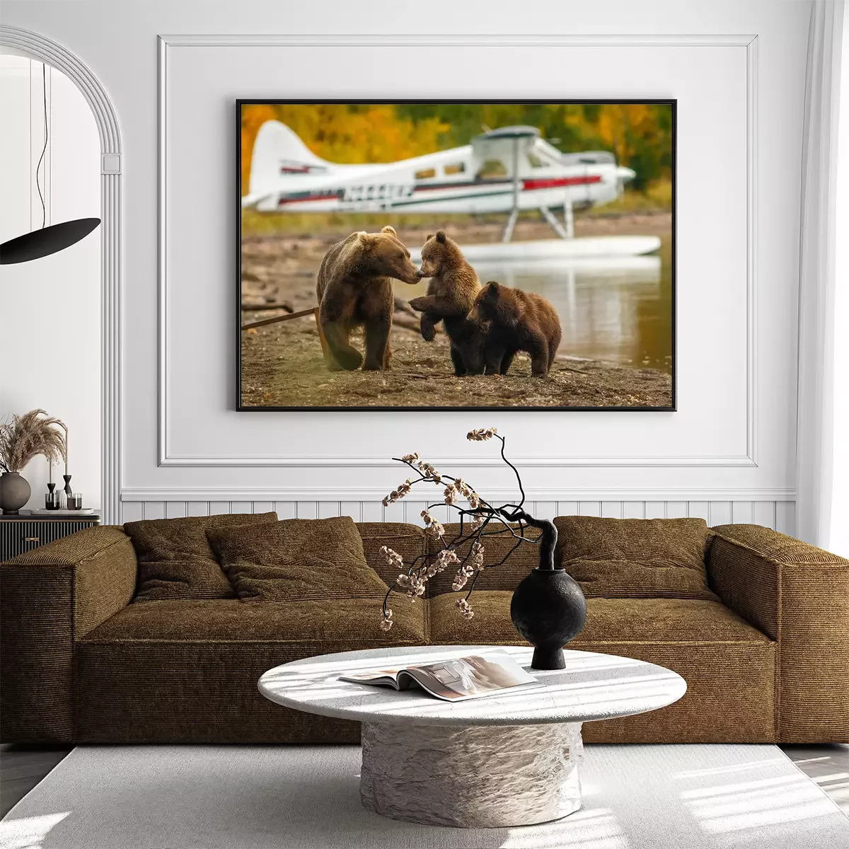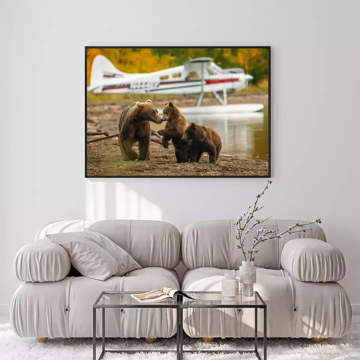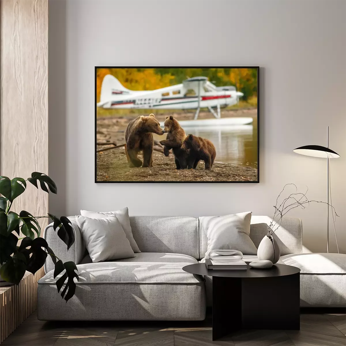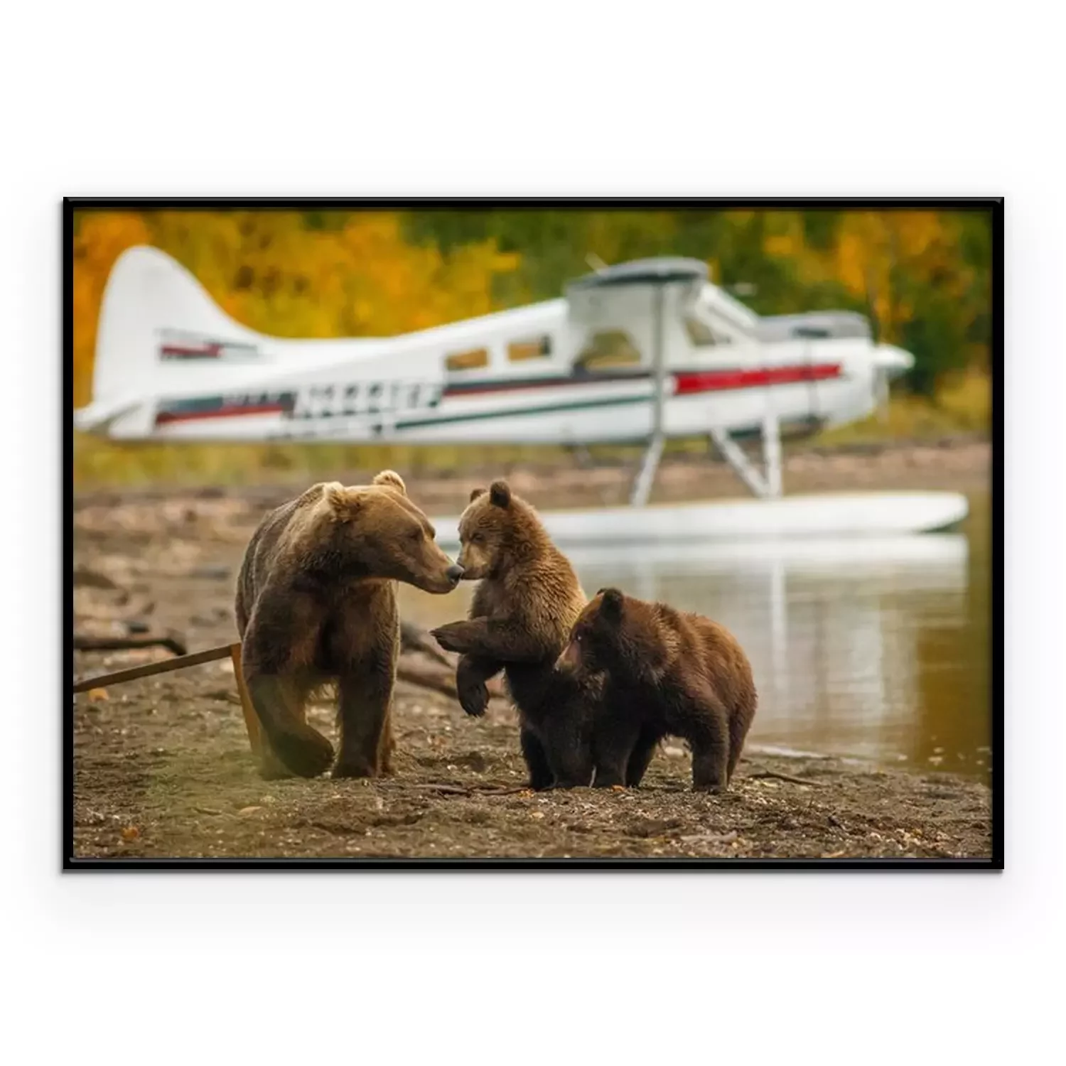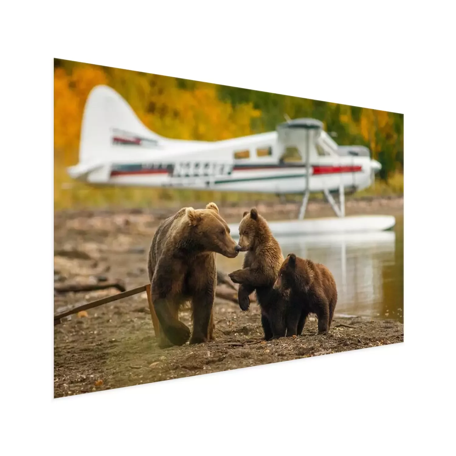 Poster  Mama bear walking with her two cubs on the beach of Naknak lake, Alaska