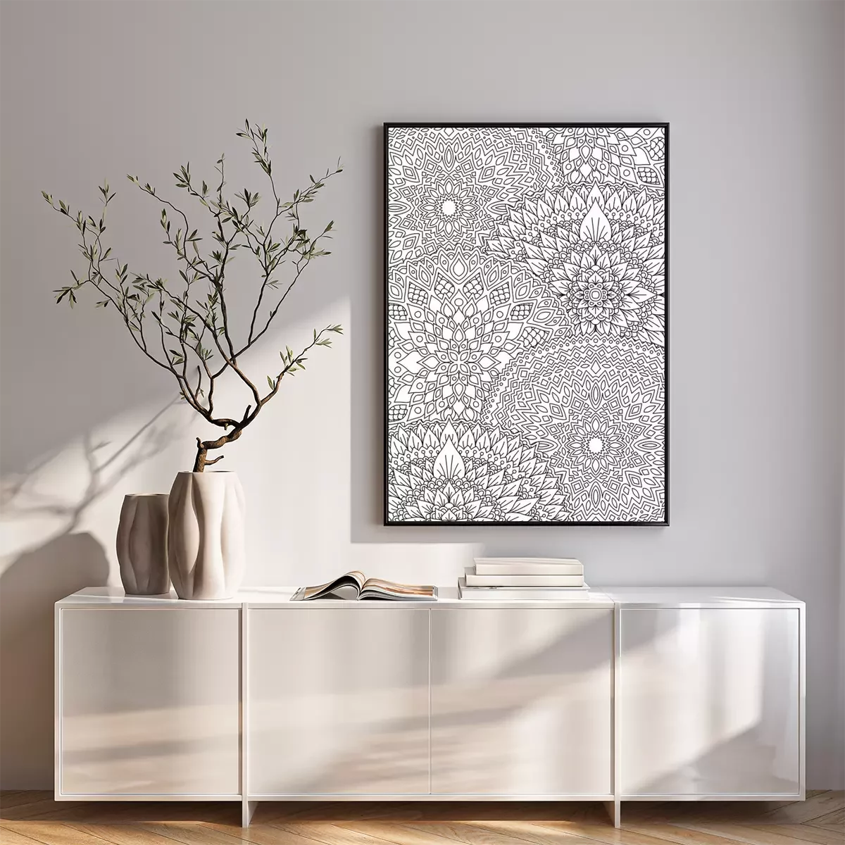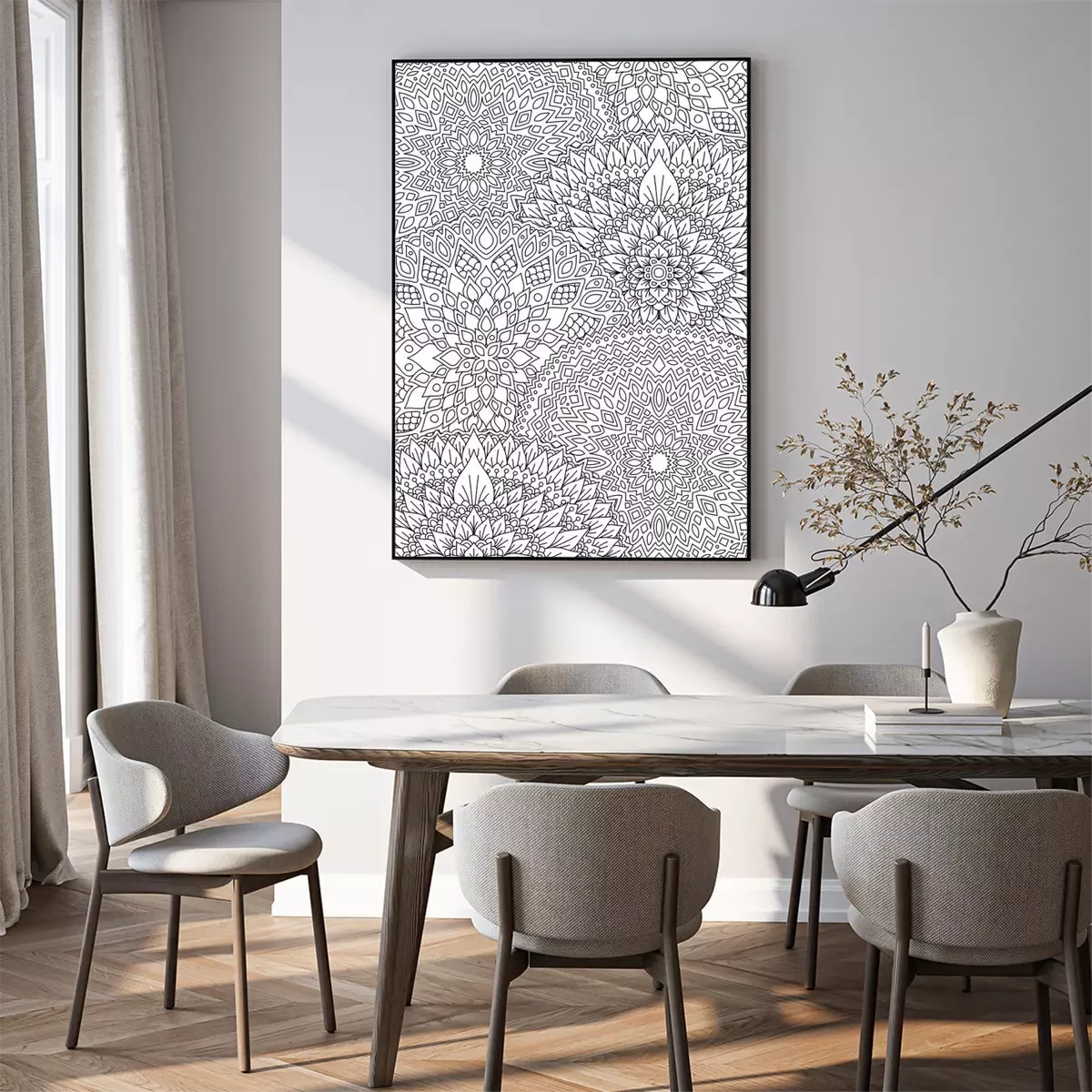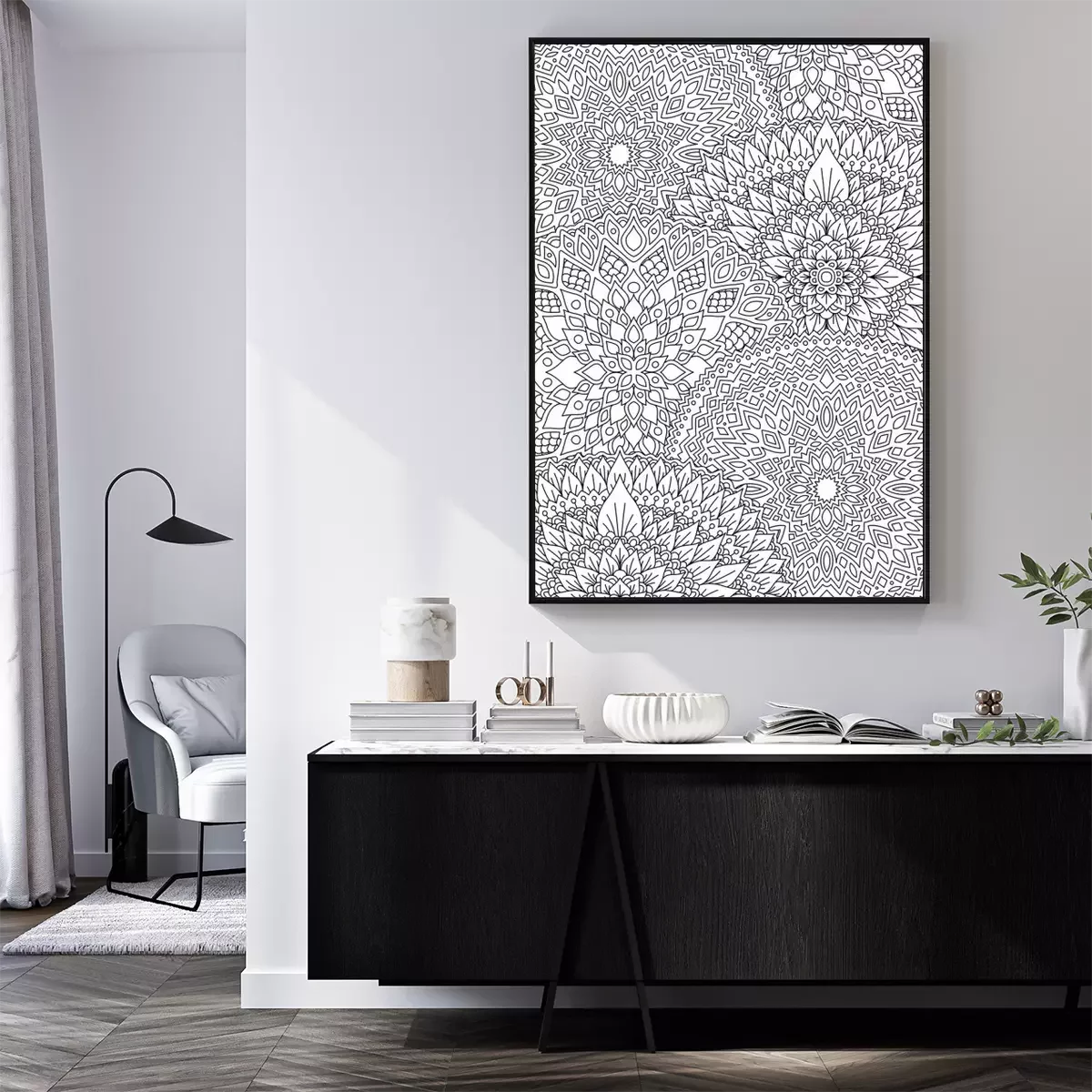 Graphiques de fleurs en noir et blanc ressemblant à un mandala