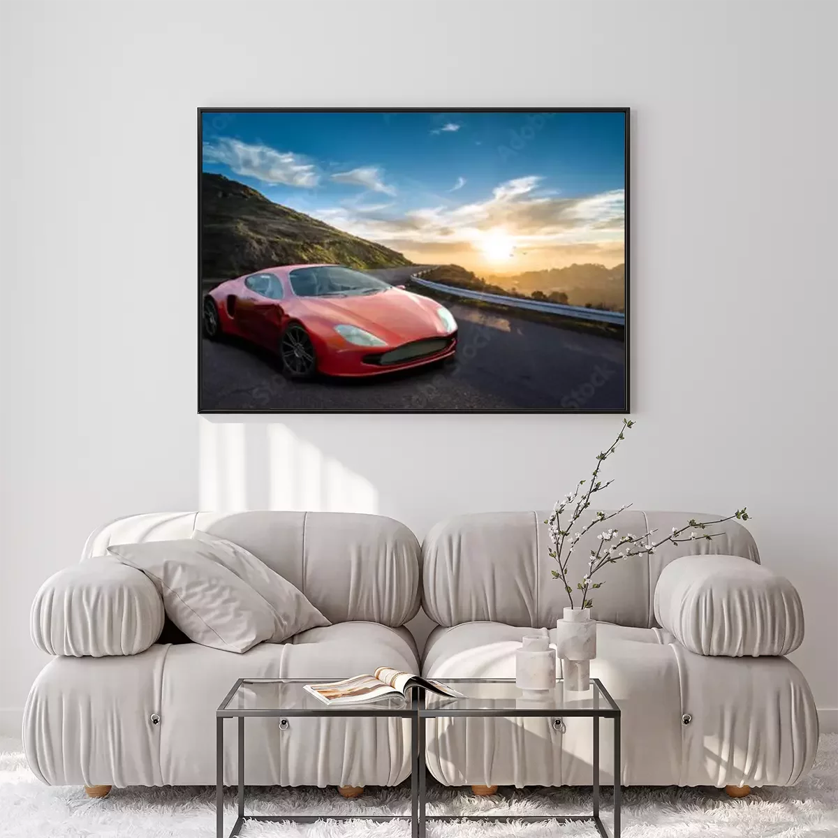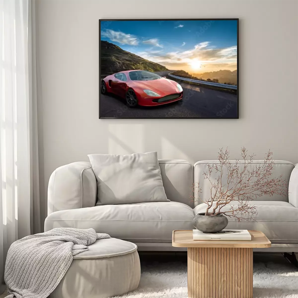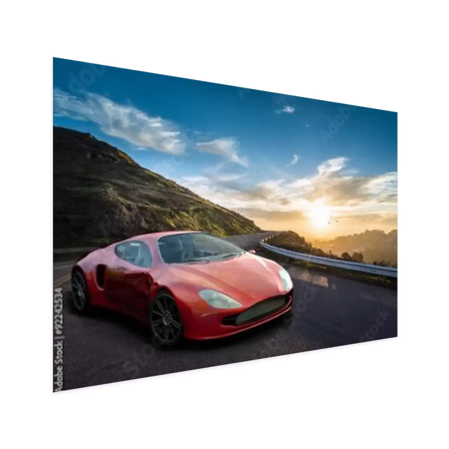Poster  Marque Free voiture de sport concept contre le coucher du soleil dans les montagnes