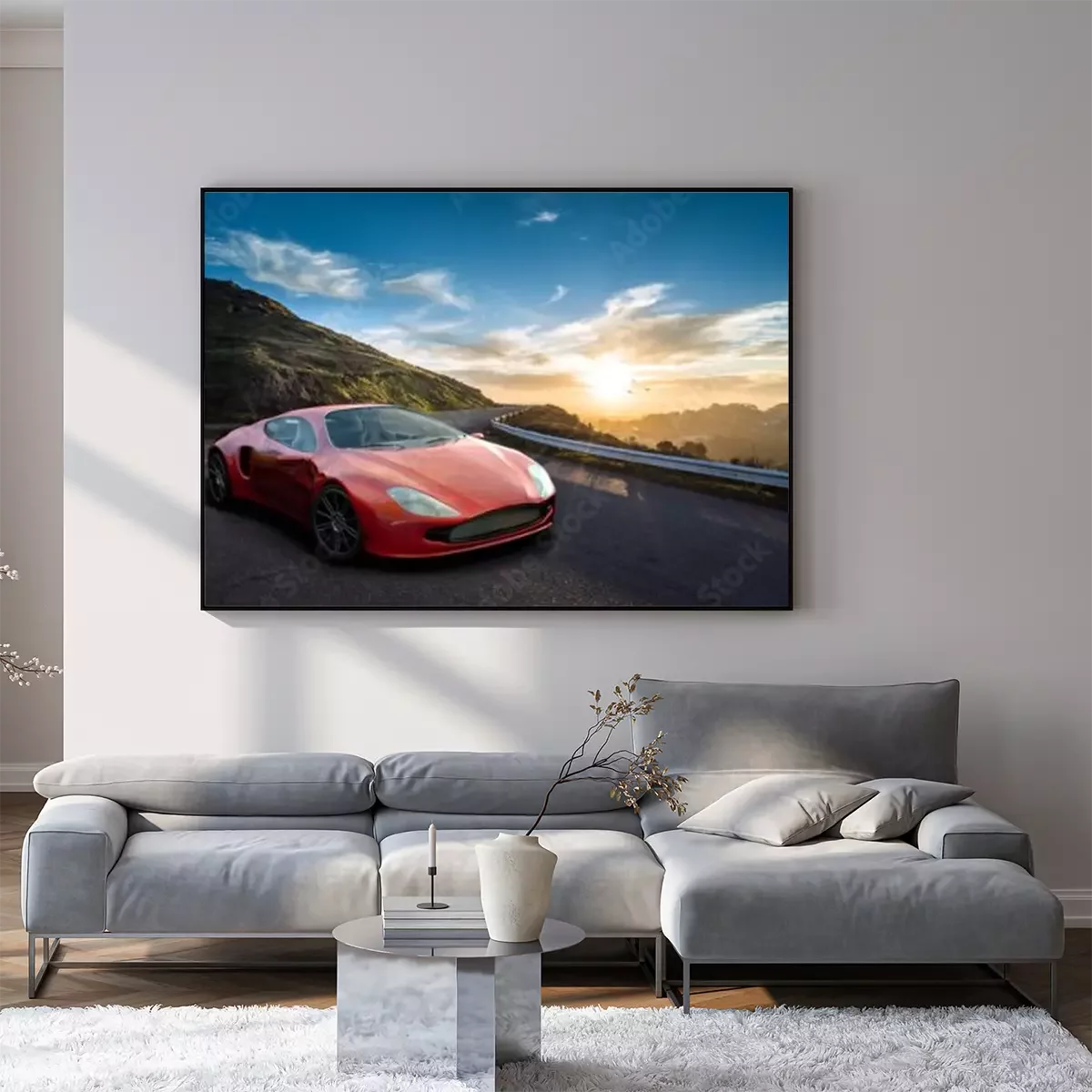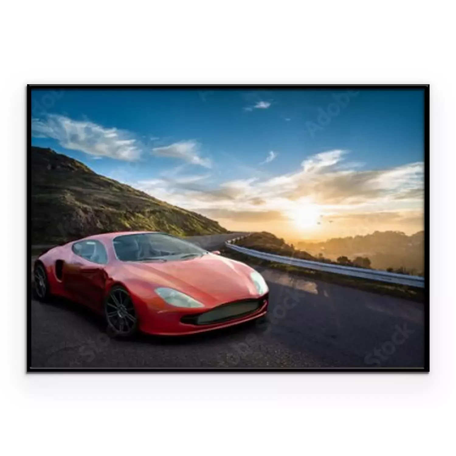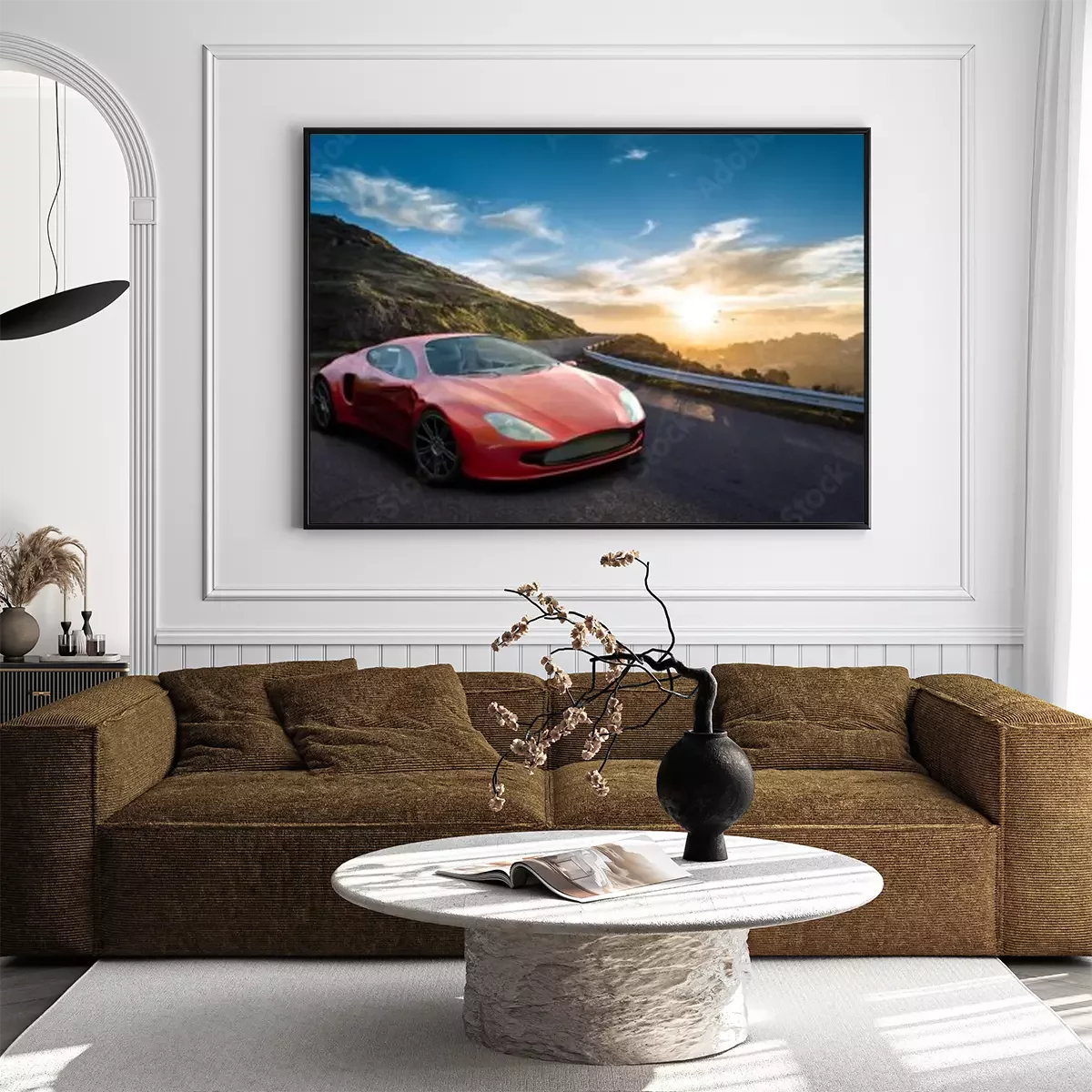 Poster  Marque Free voiture de sport concept contre le coucher du soleil dans les montagnes