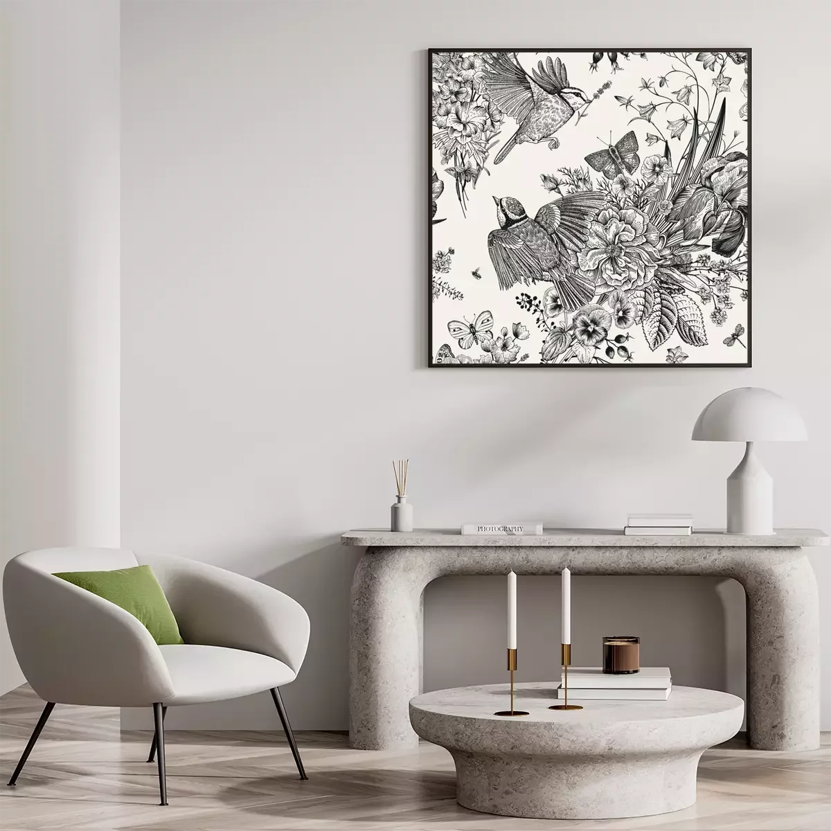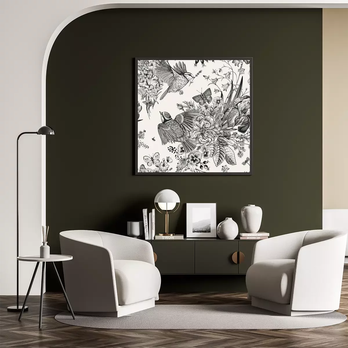 Poster : Mésange et bouquets de fleurs