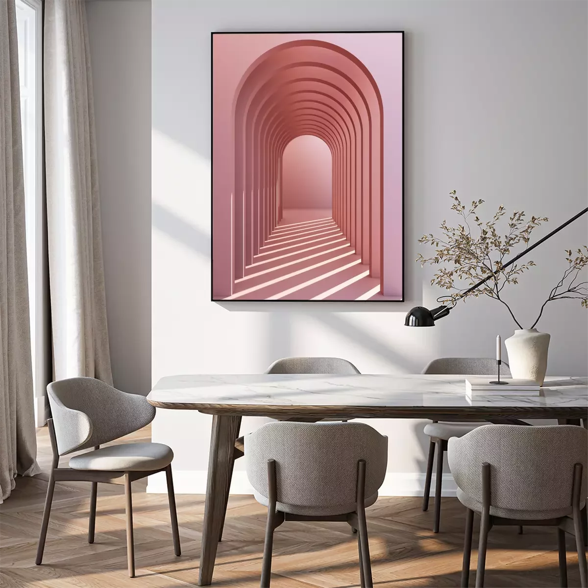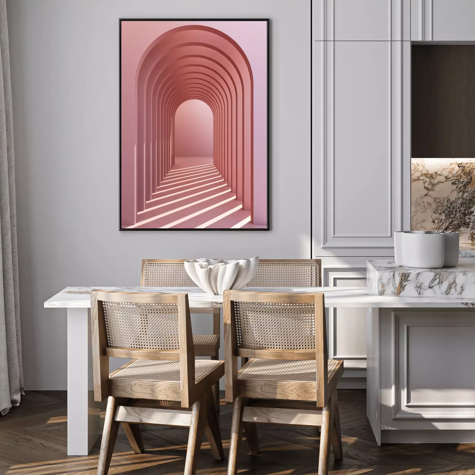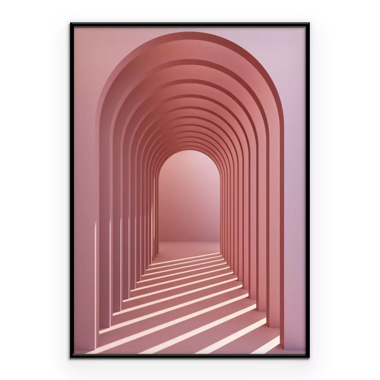 Poster : Minimalistic, pinkpastel arch hallway architectural corridor with empty wall. 3d render, minimal.