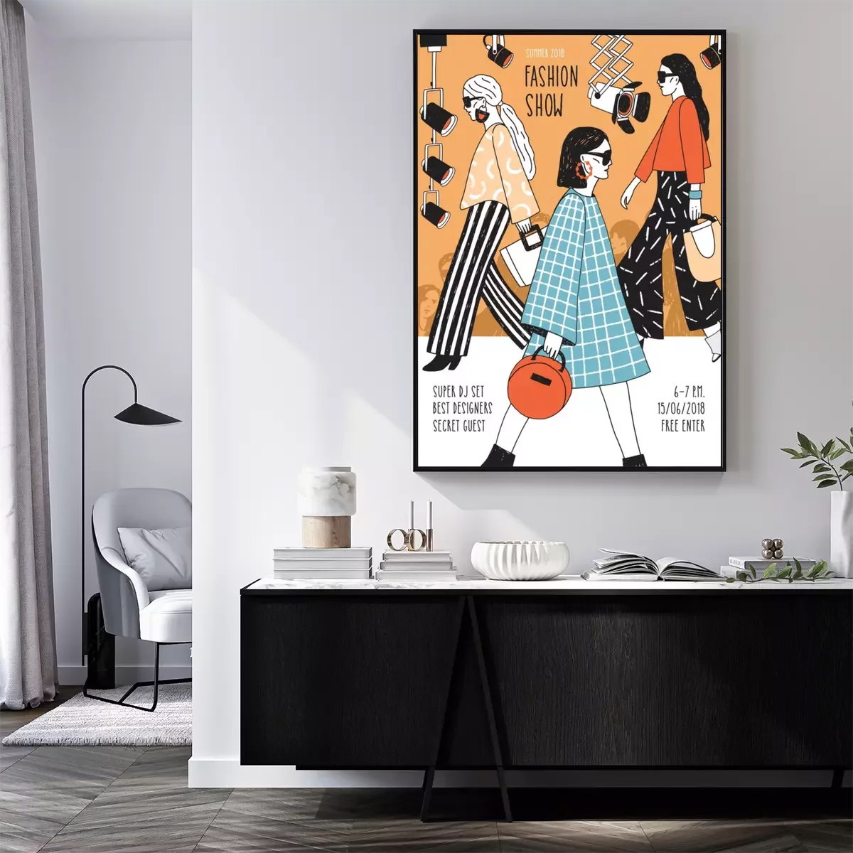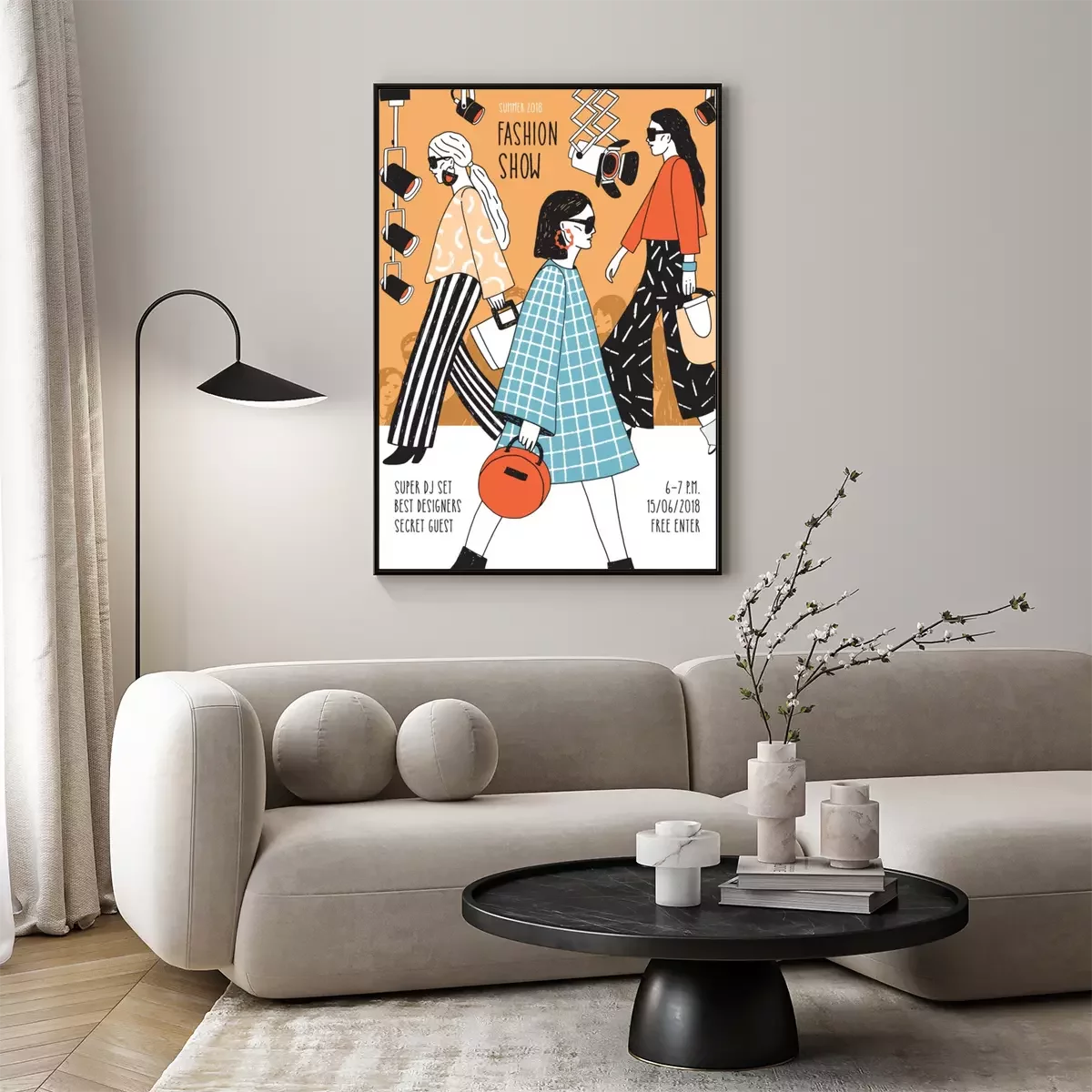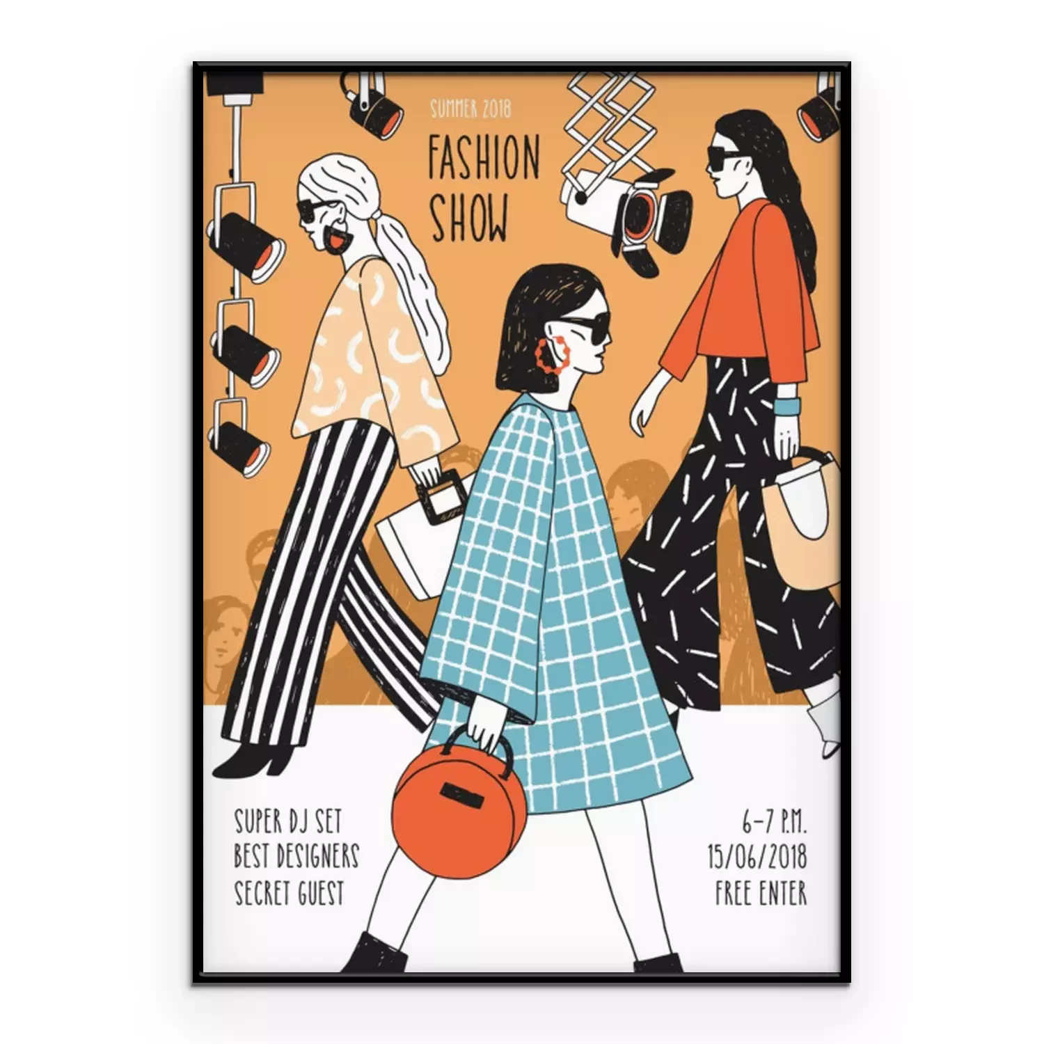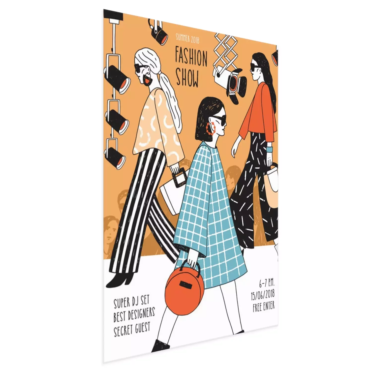 Poster  Modèle moderne de flyer ou d’affiche pour le défilé de mode avec les meilleurs mannequins portant des vêtements de haute couture à la mode et en faire la démonstration. Illustration vectorielle coloré
