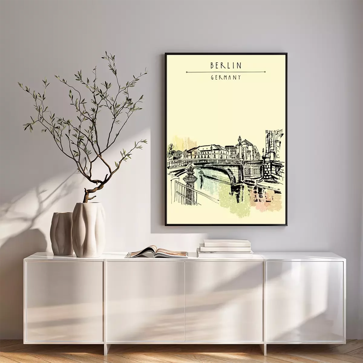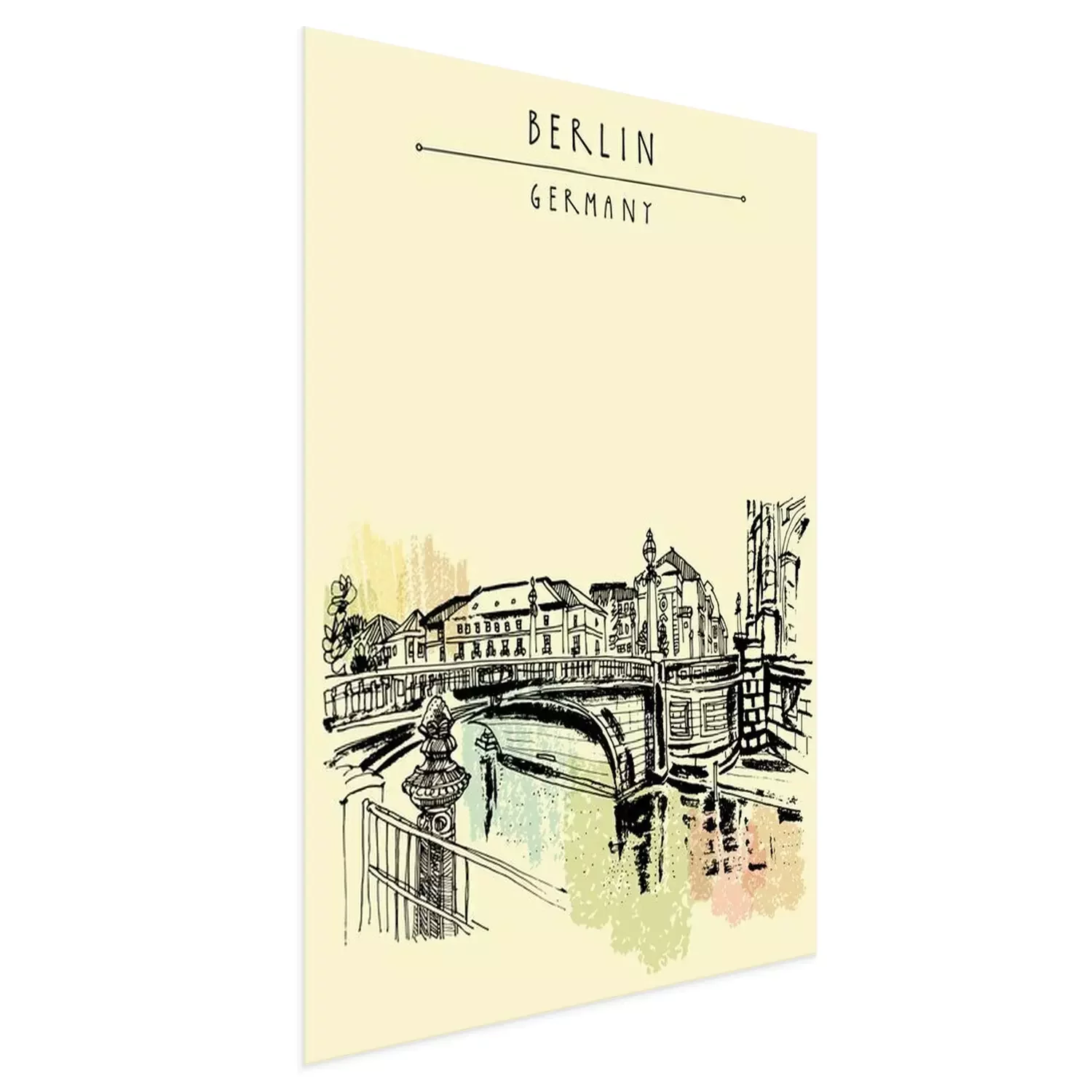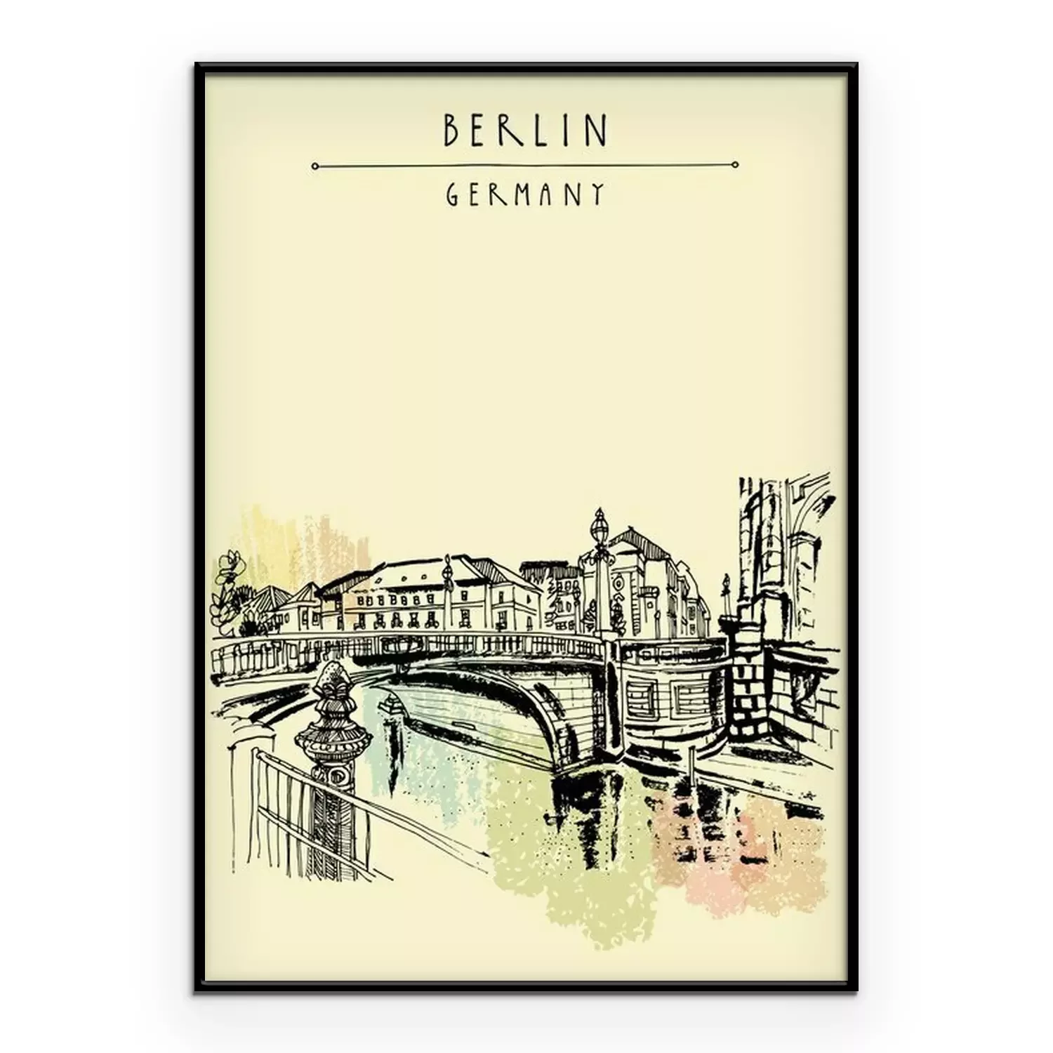 Poster  Monbijou pont à Berlin, Allemagne, Europe. Rivière Spree, rivière. Dessin à main levée. Croquis de voyage. Vintage touristique carte postale, affiche, livre illustration
