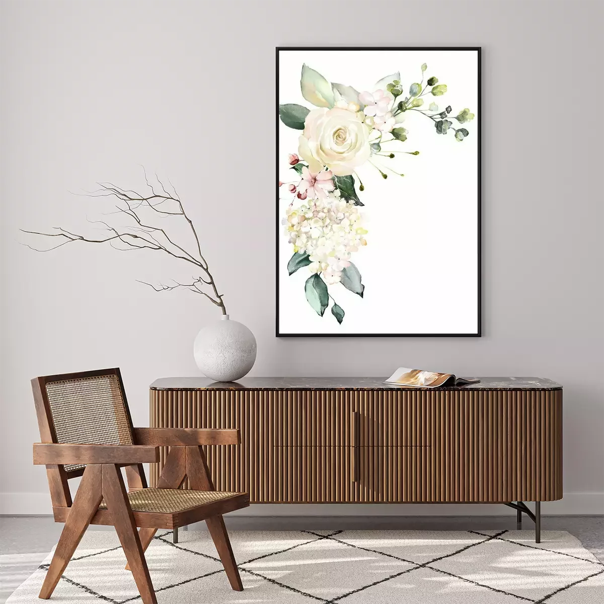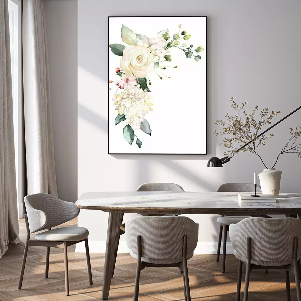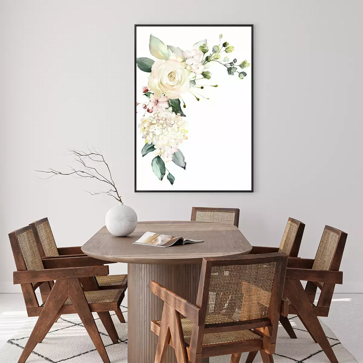 Poster : Motif éthéré de roses blanches avec des feuilles