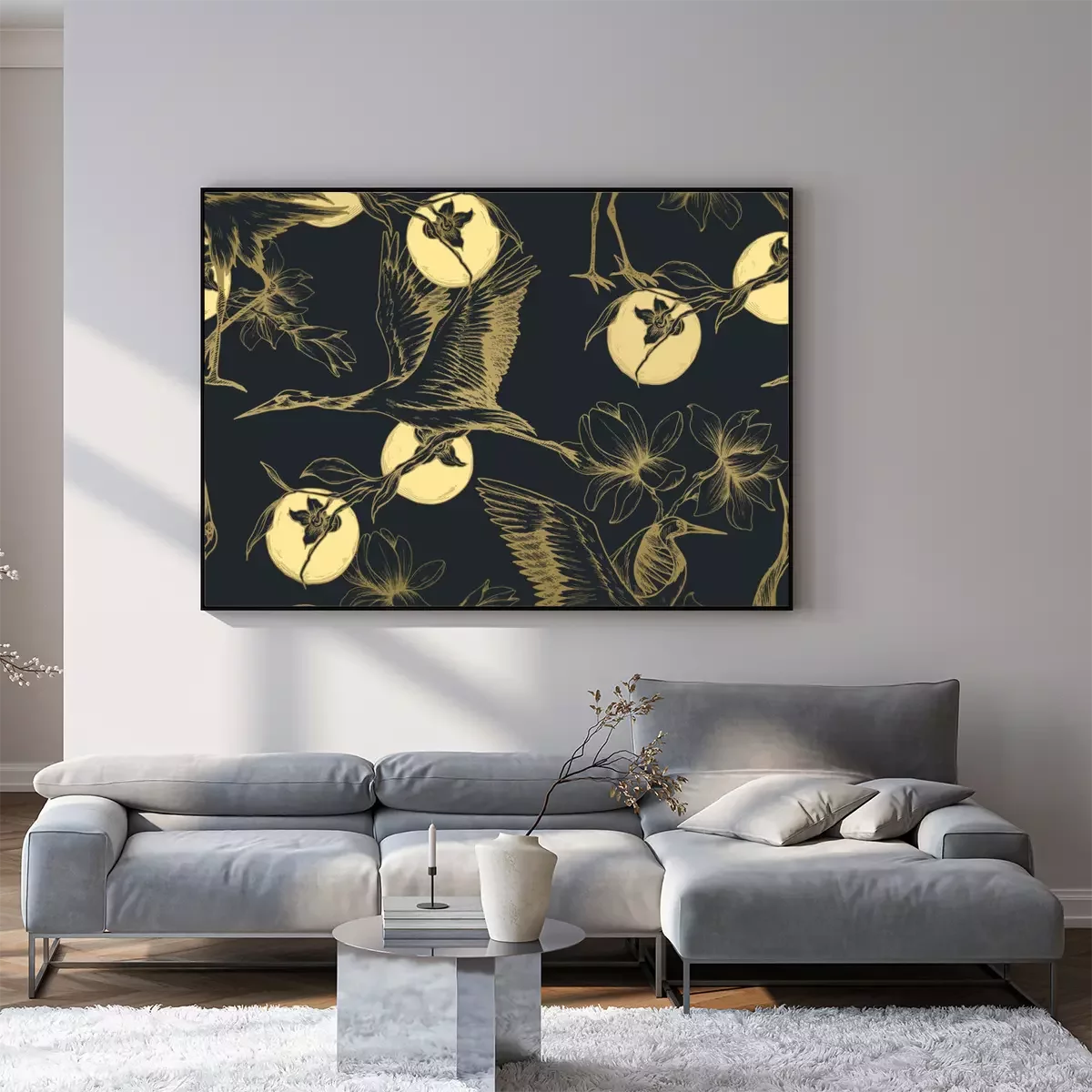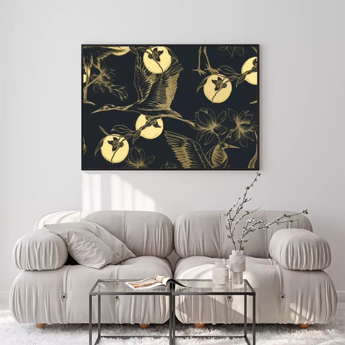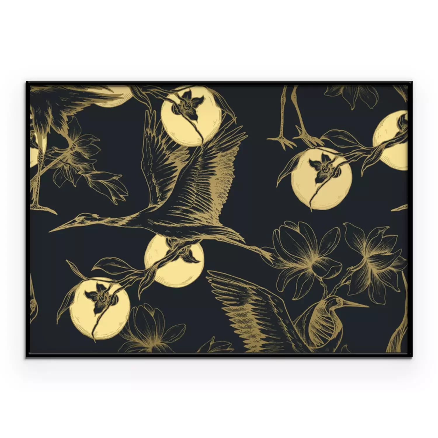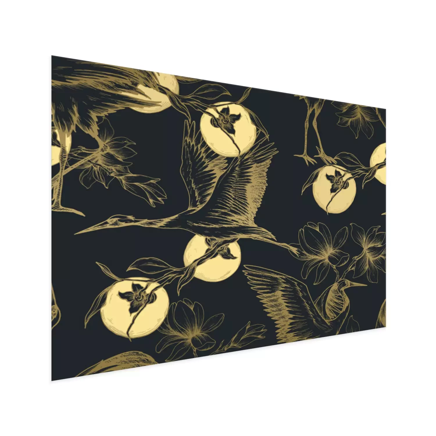 Poster : Motif oriental avec des grues et des fleurs dorées