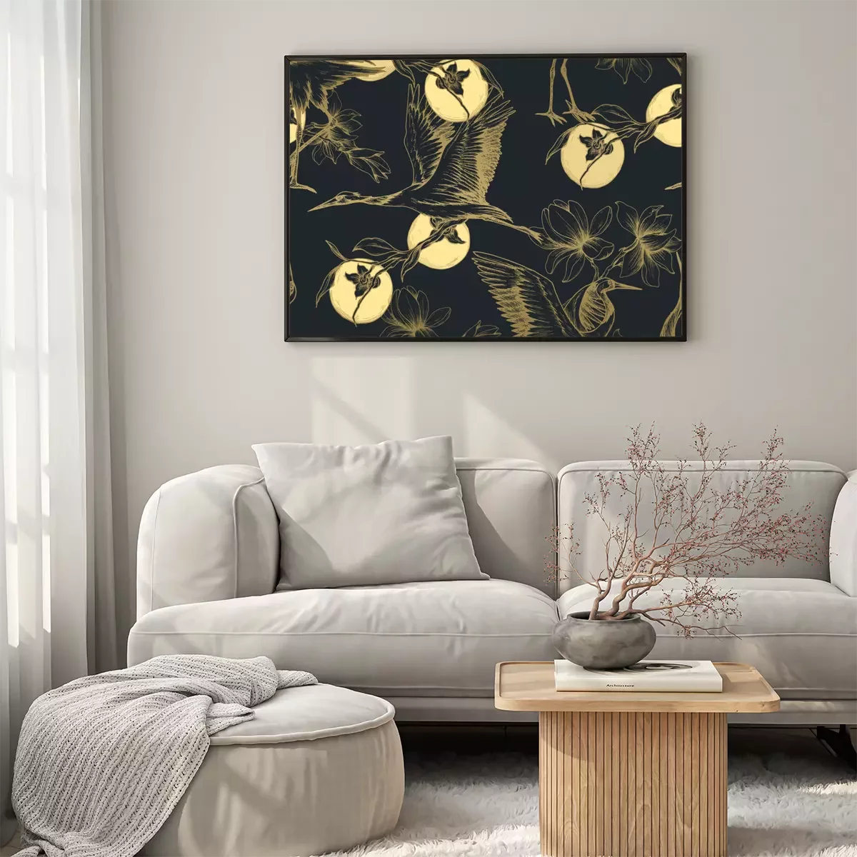 Poster  Motif oriental avec des grues et des fleurs dorées