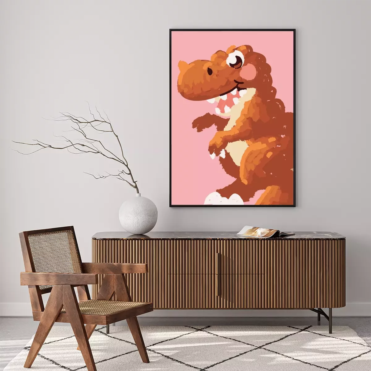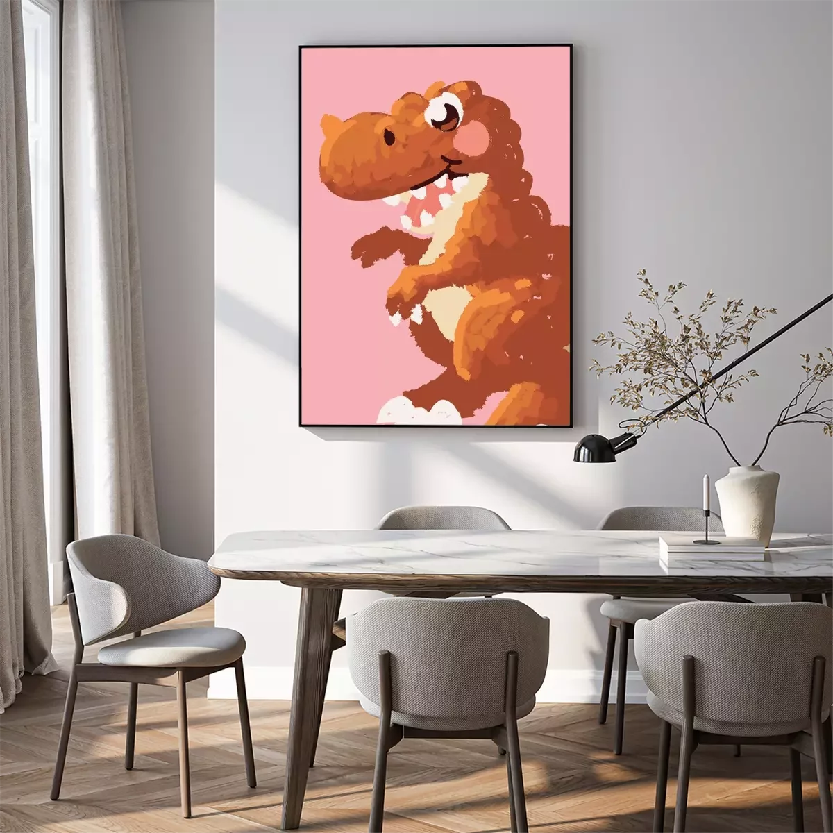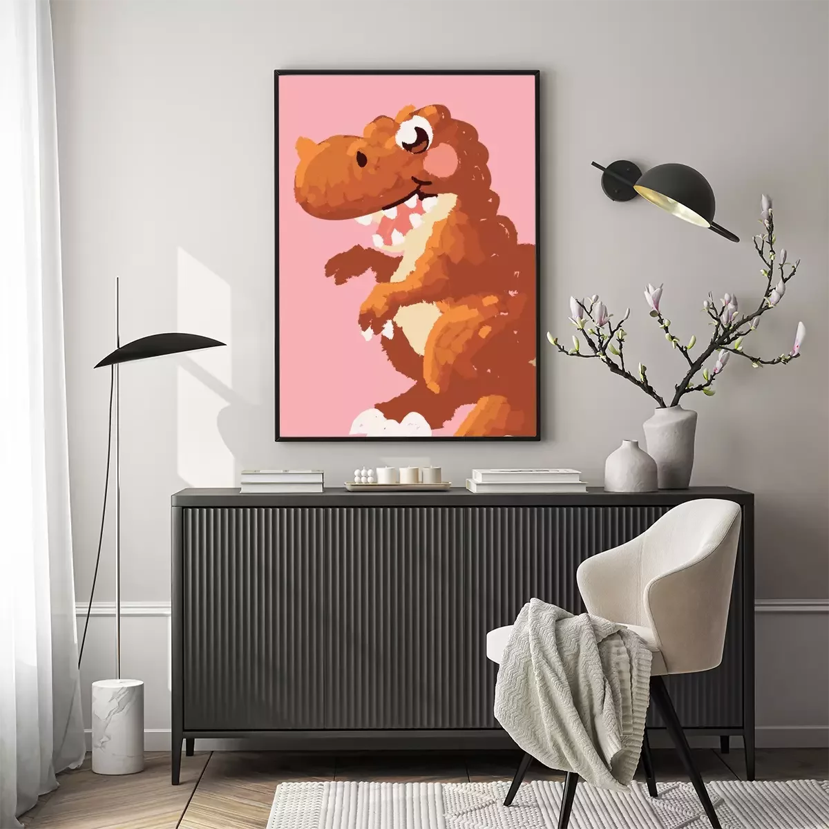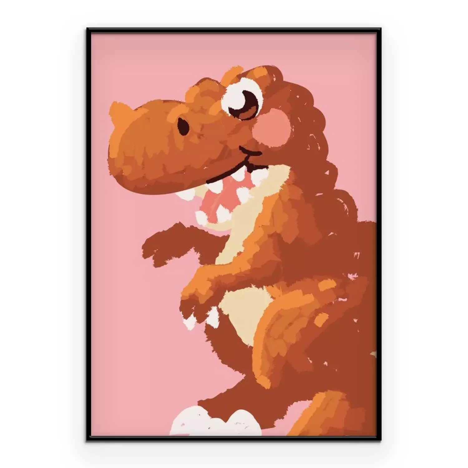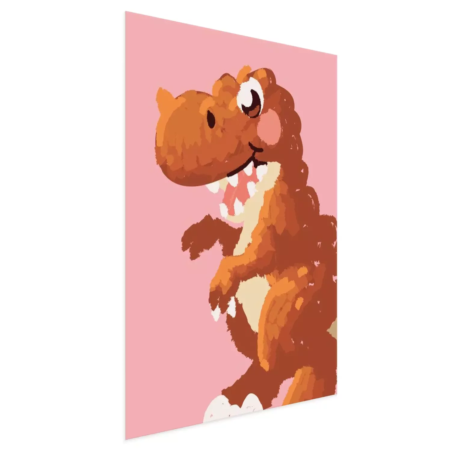 Poster : Motif version dessin animé avec un dinosaure sur un fond rose