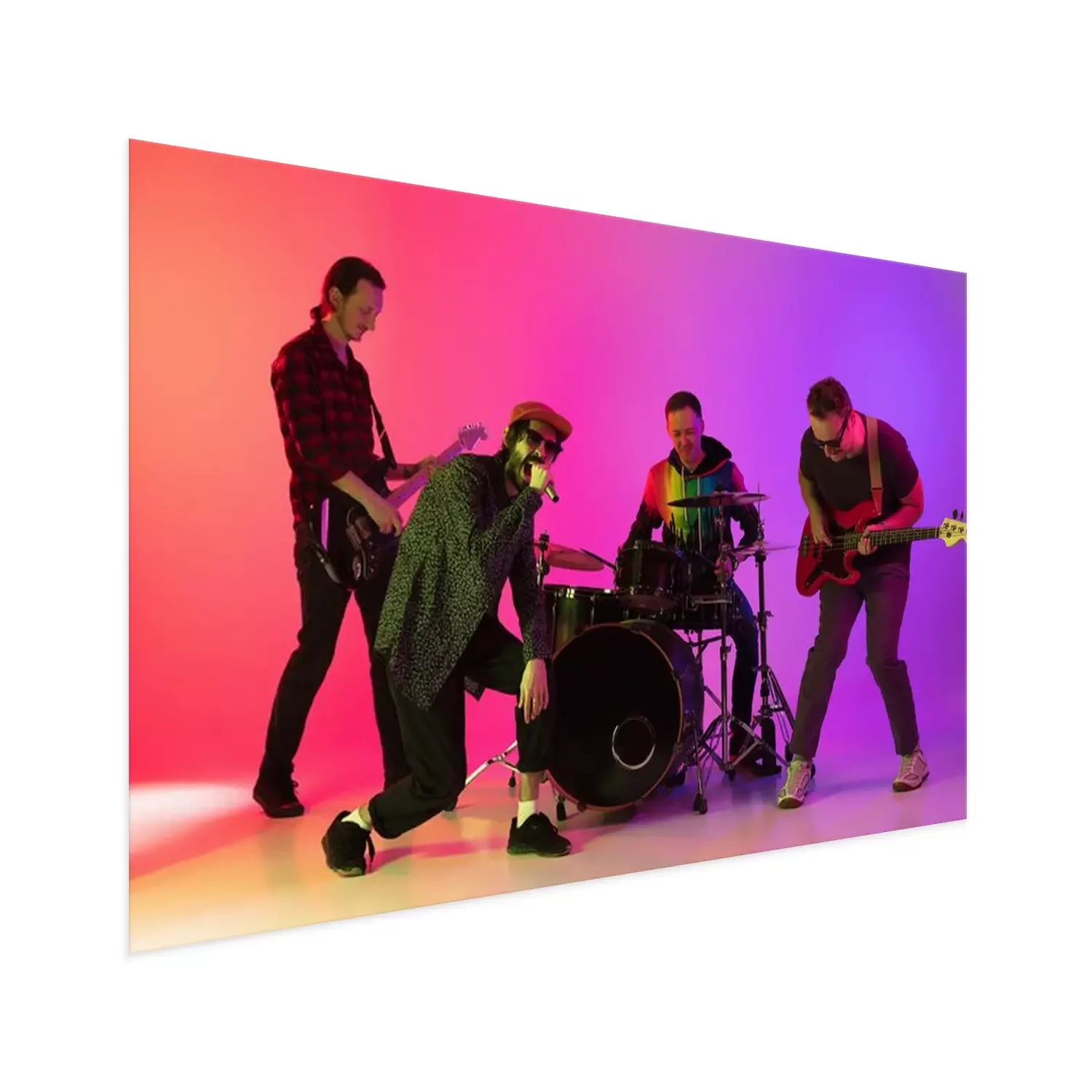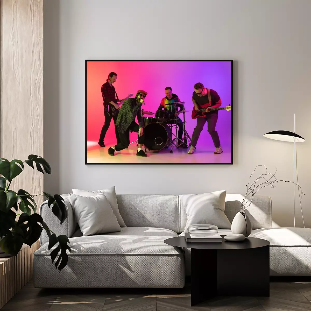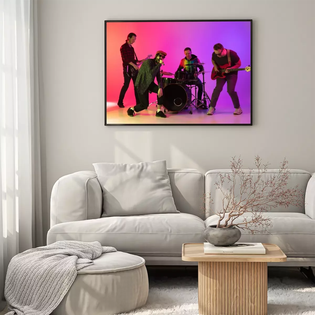 Poster : Motion. Young inspired and expressive music band performing on gradient colored background in neon light. Concept of music, hobby, festival, art. Joyful artist, colorful, bright portrait.