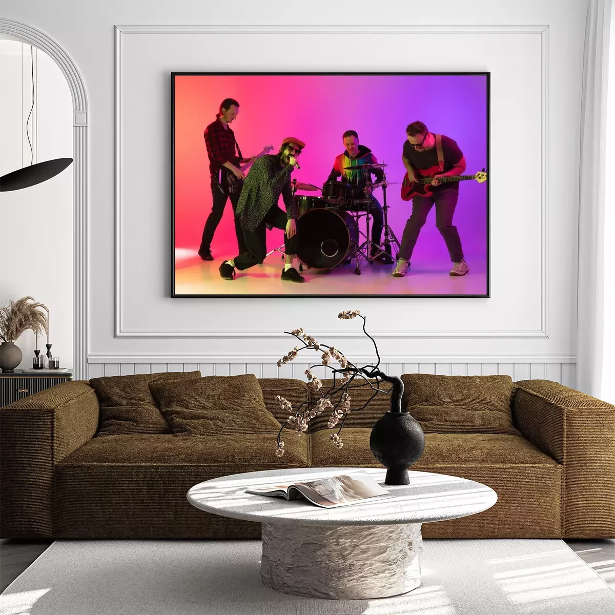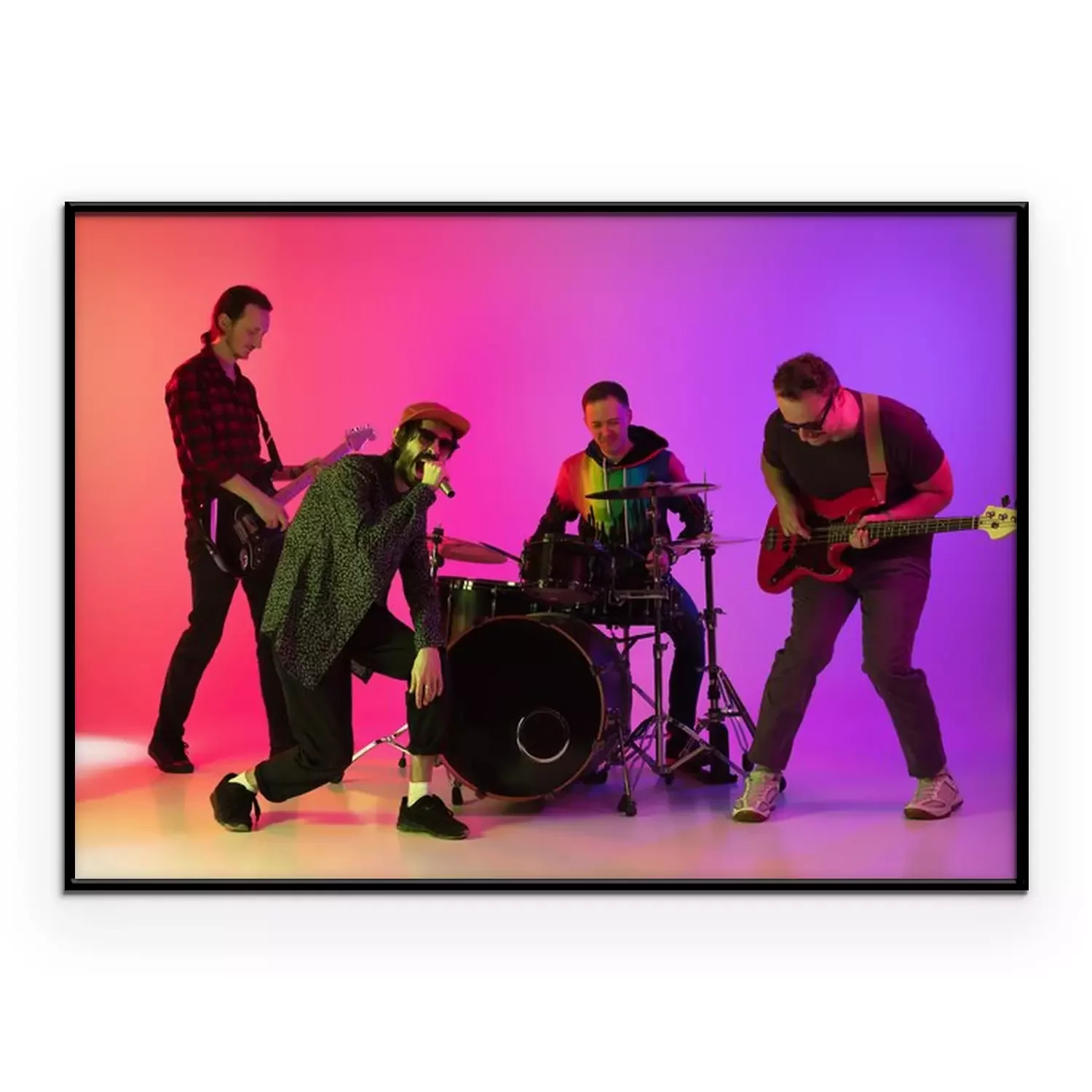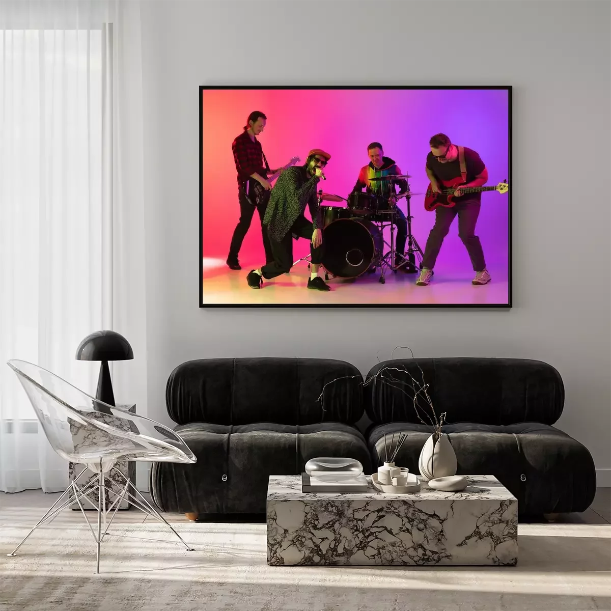 Poster : Motion. Young inspired and expressive music band performing on gradient colored background in neon light. Concept of music, hobby, festival, art. Joyful artist, colorful, bright portrait.