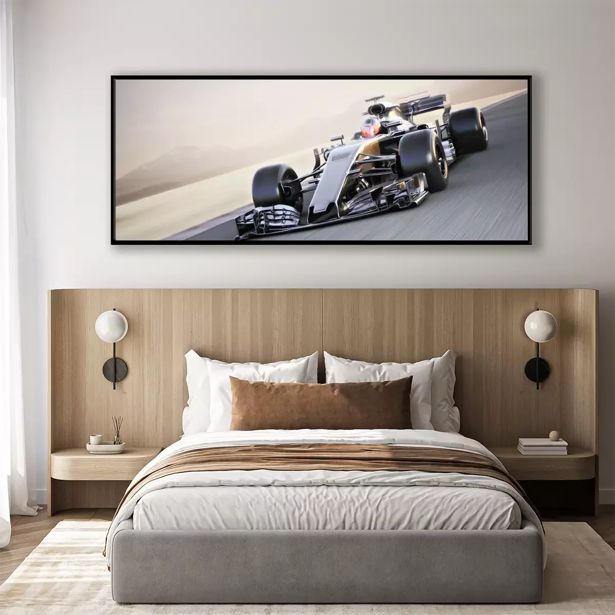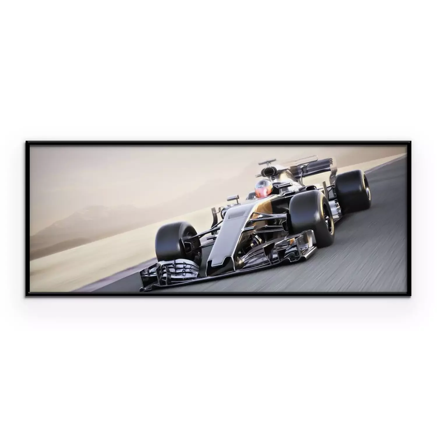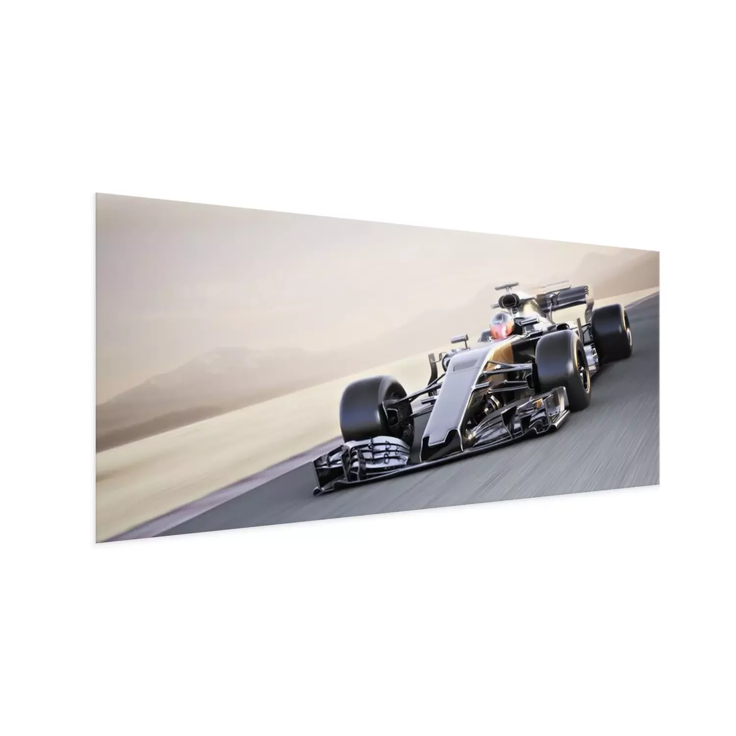 Poster  Motor sports competitive team racing. Fast moving generic race car racing down the track with motion blur. 3d rendering with room for text or copy space