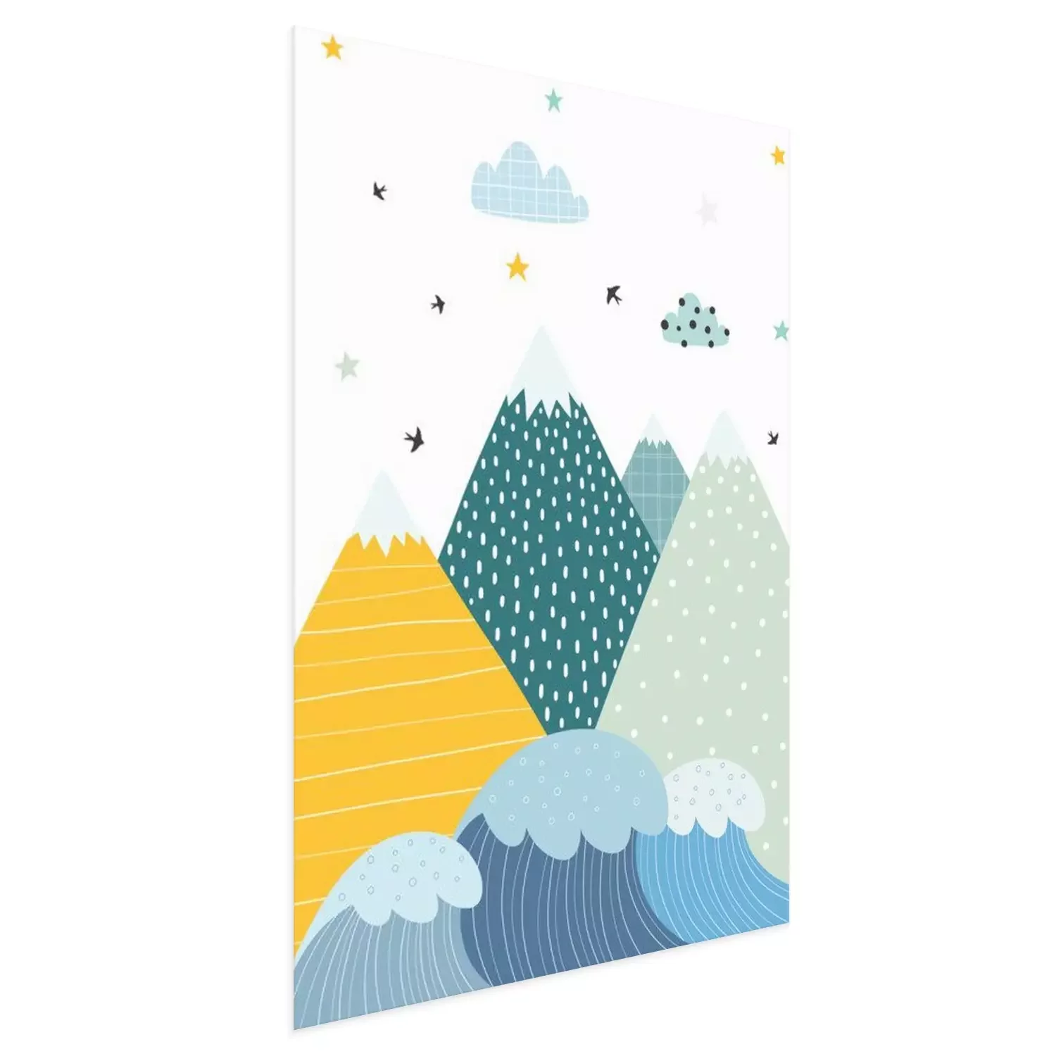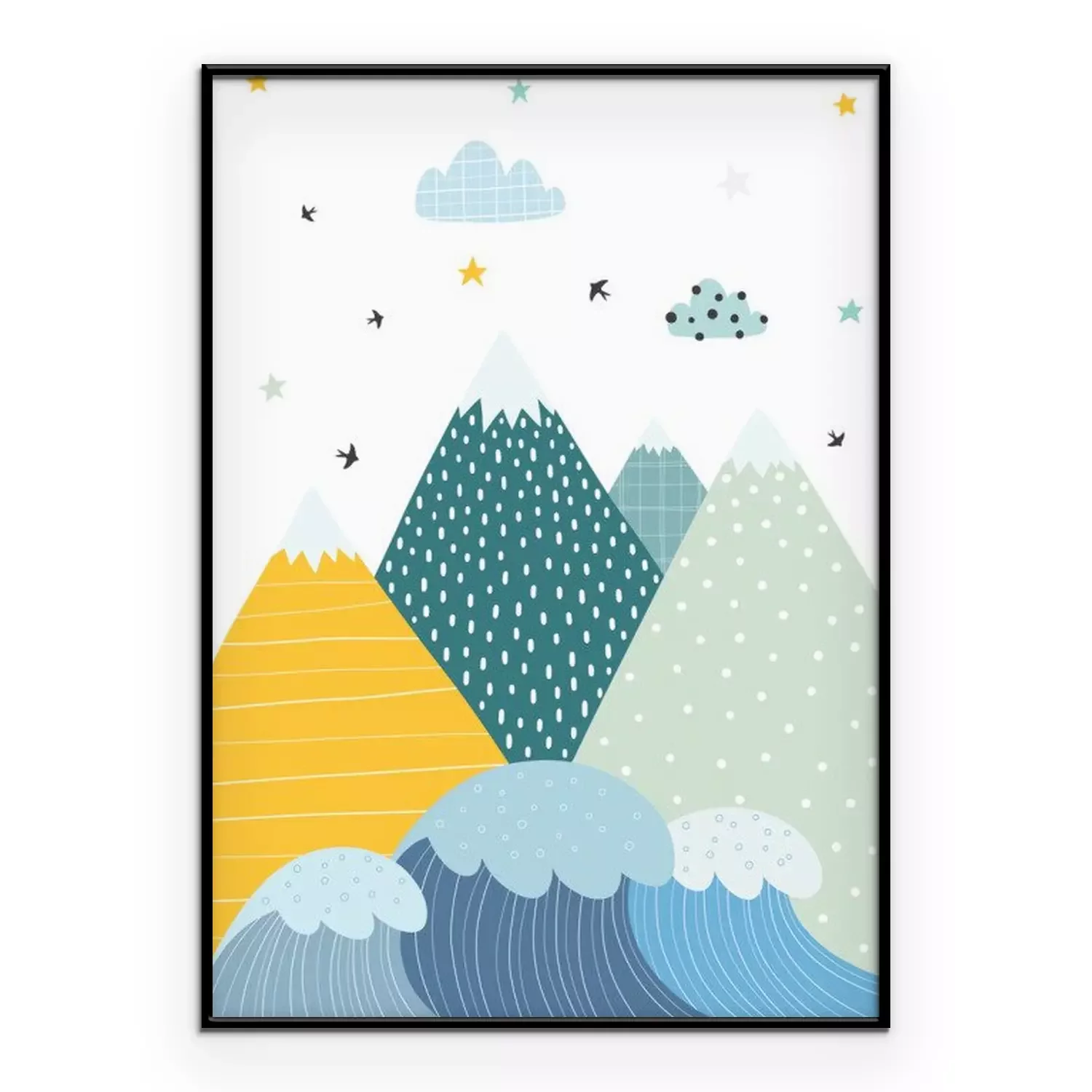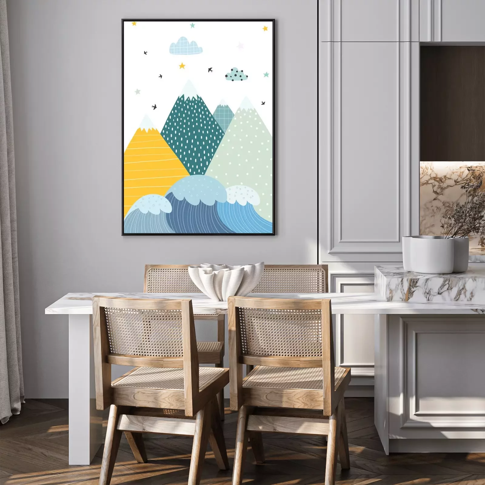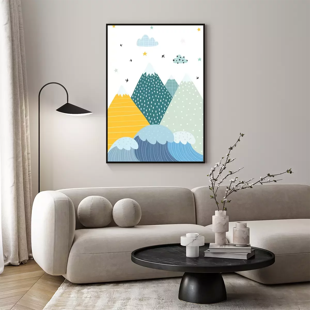 Poster  Mountains and waves in a scandinavian style. Illustration of nature for children. Vector illustration with a simple objects.