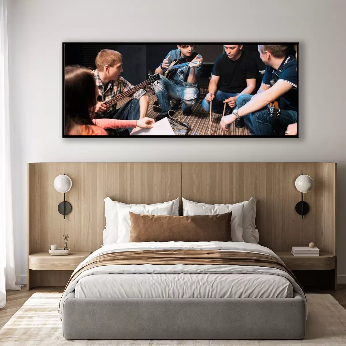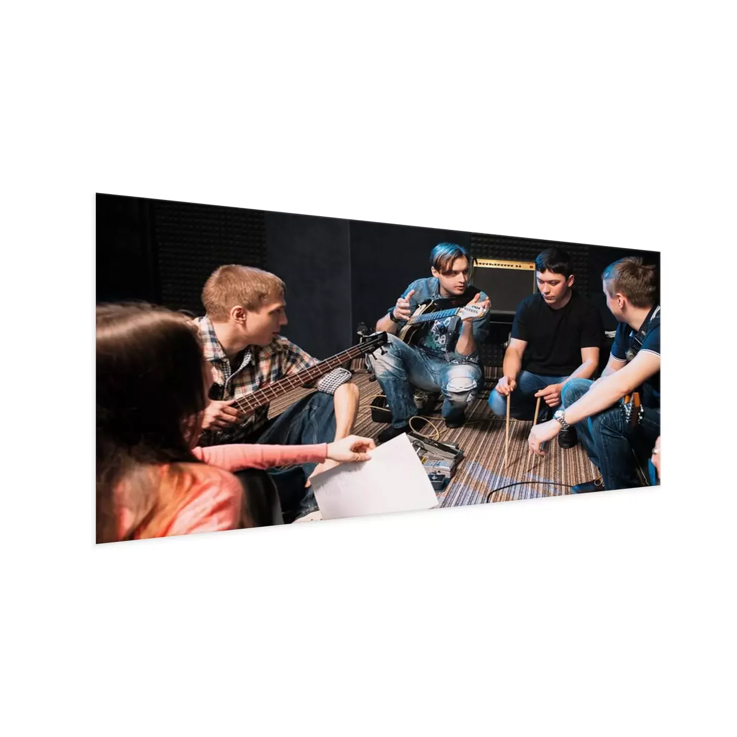 Poster : Musique, bande, discuter, batteurs, fête, chanson. Vue de face sur les jeunes musiciens assis sur le sol, tout le monde regardant le gars avec des pilons.