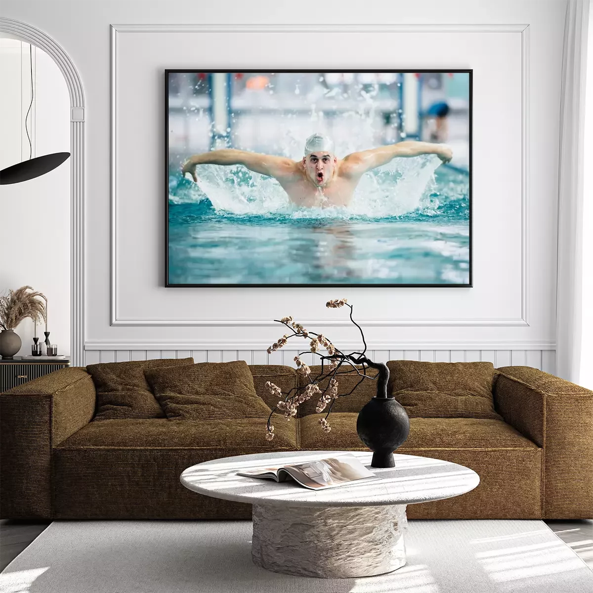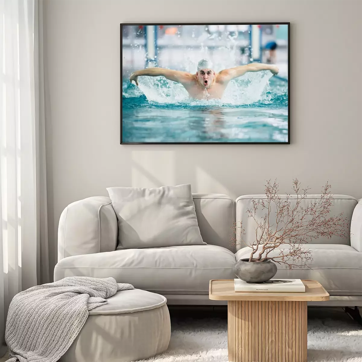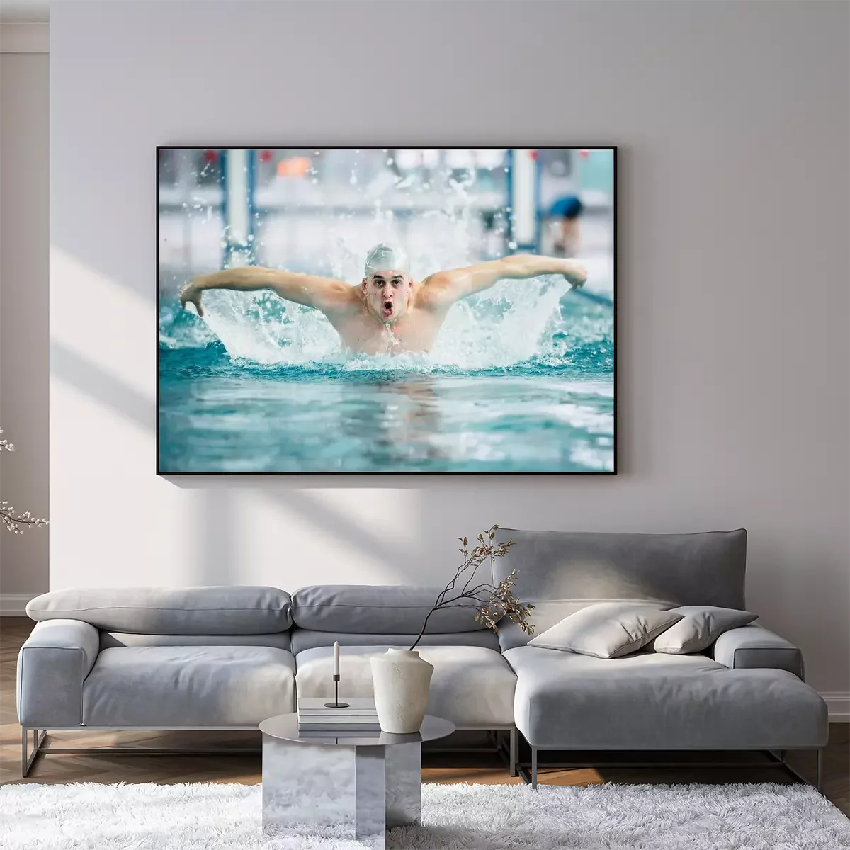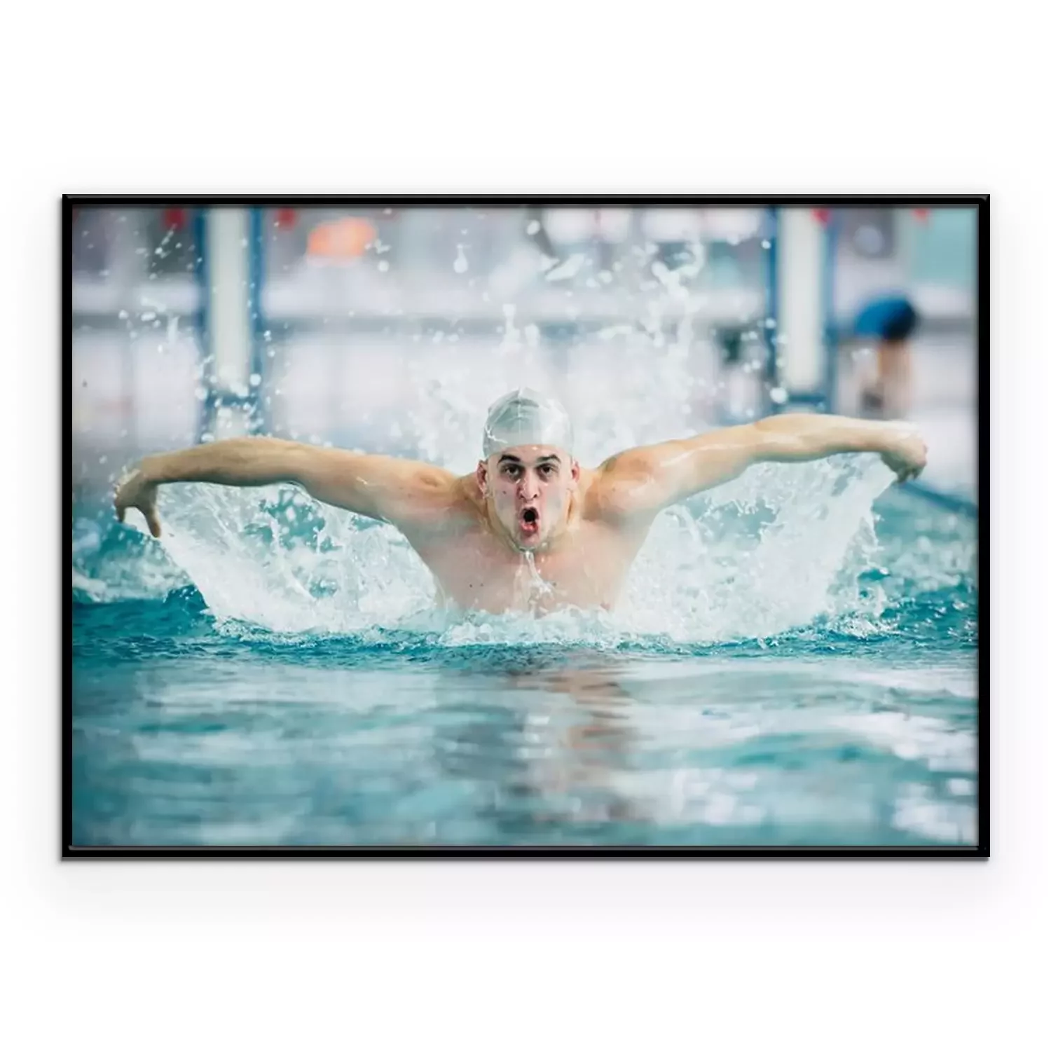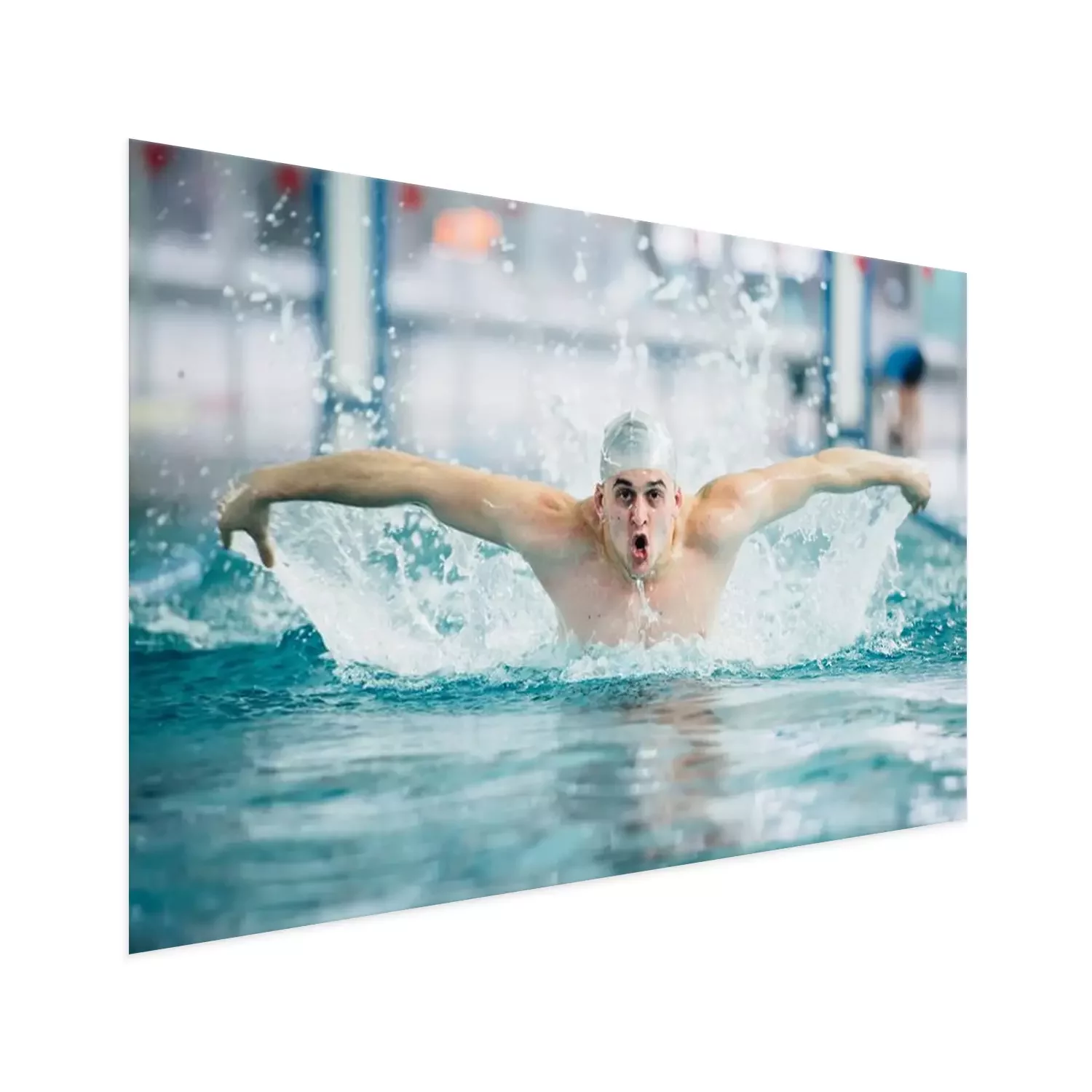 Poster  Nageur masculin, exécutant la technique de coup de papillon à la piscine intérieure. effet vintage